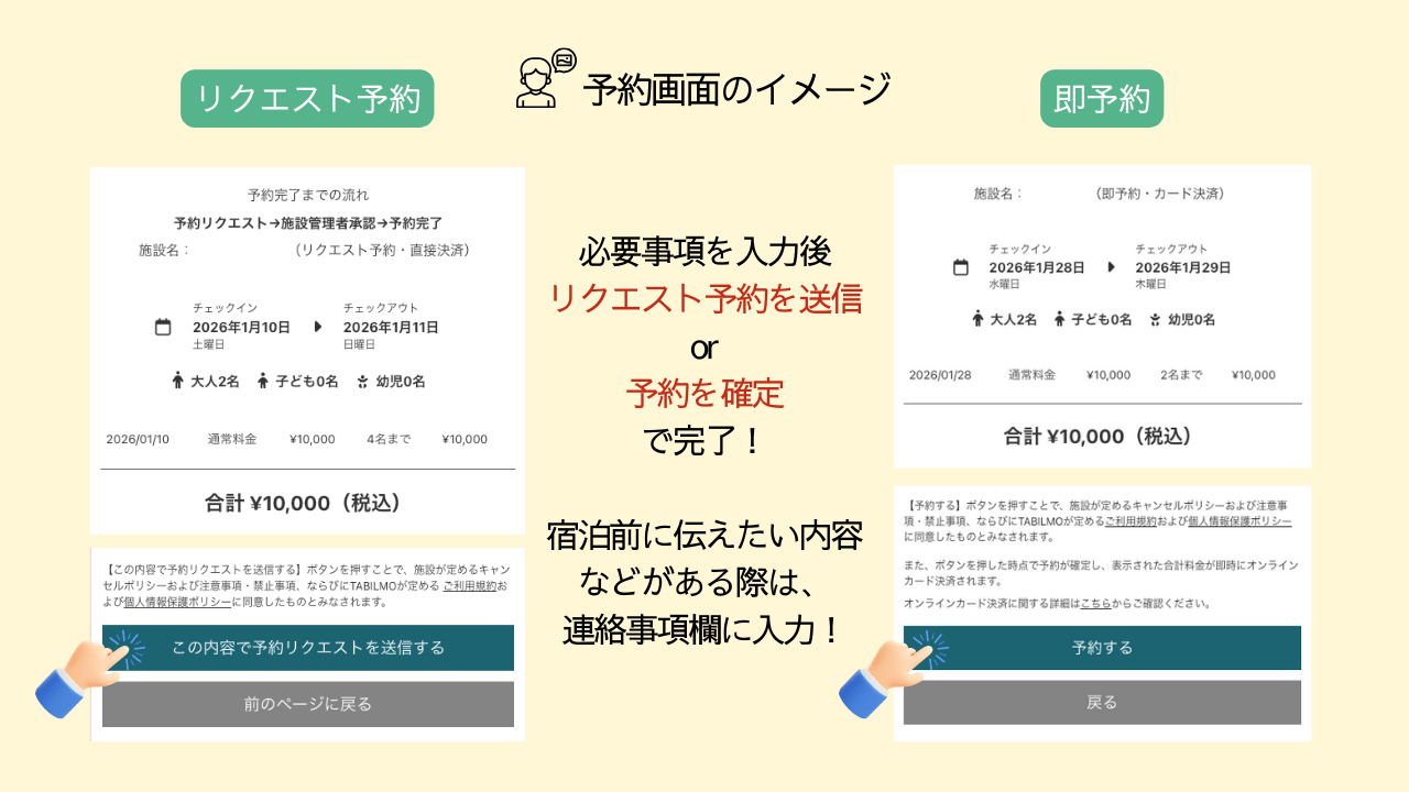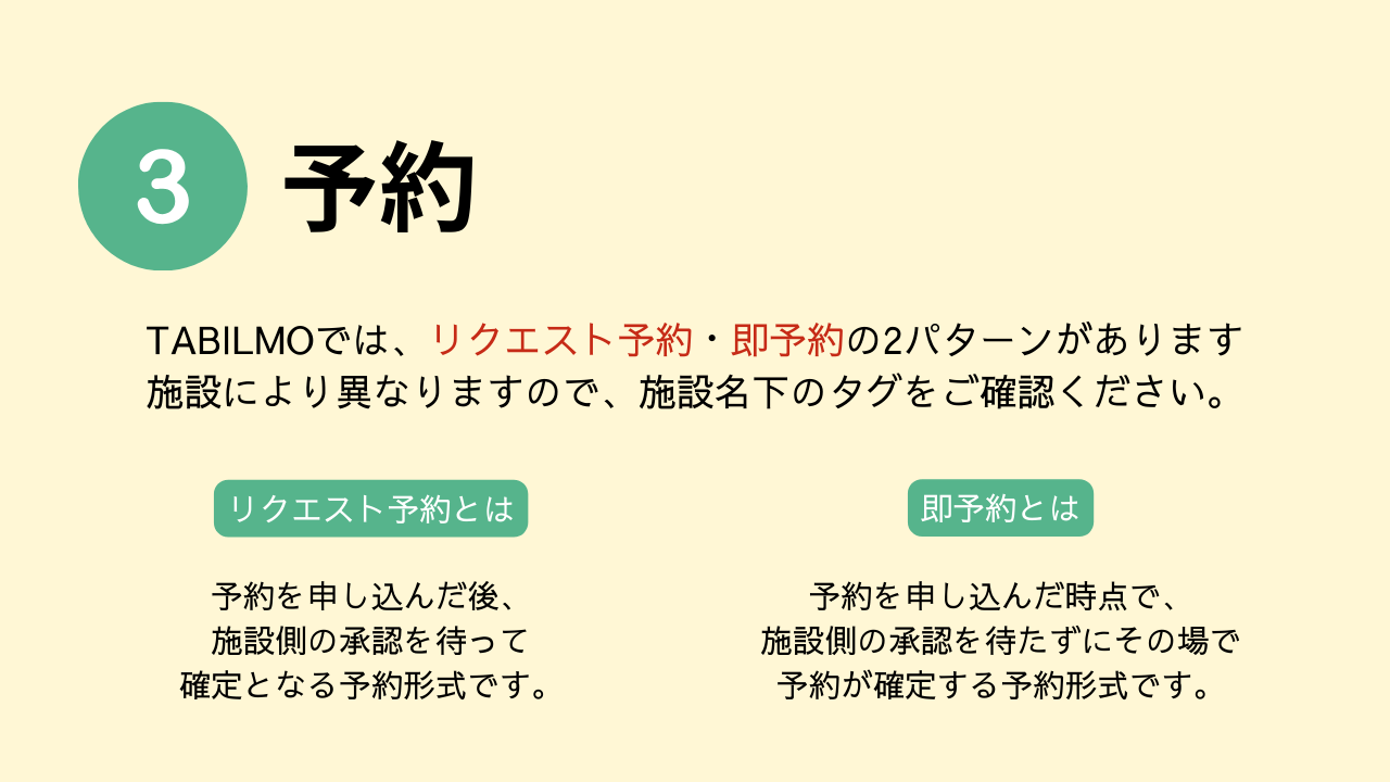オンラインカード決済の場合: 予約リクエスト / 予約送信時にサイト上で決済が確定いたします。