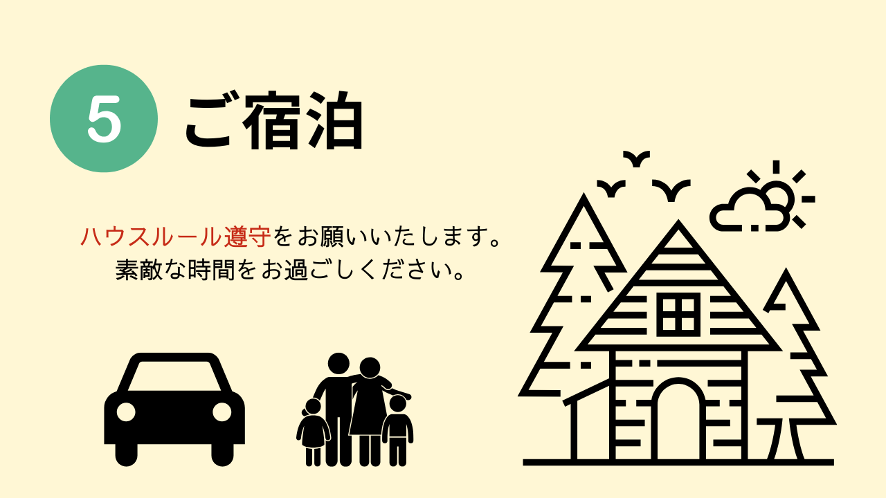 注意事項をご確認、ハウスルール遵守のうえご宿泊をお願いいたします。