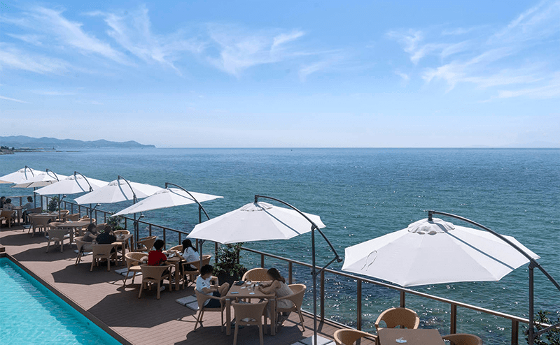 海に向かって伸びるウッドデッキが印象的な淡路島の人気カフェ。開放感あふれるテラス席は犬連れ利用が可能で、潮風を感じながらふわふわのパンケーキを楽しめます。周囲との距離が取りやすい席配置のため、犬連れでも落ち着いて過ごしやすいのが魅力。写真映えするロケーションは旅の思い出作りにもぴったりです。混雑しやすいため、時間帯をずらすのがおすすめです。