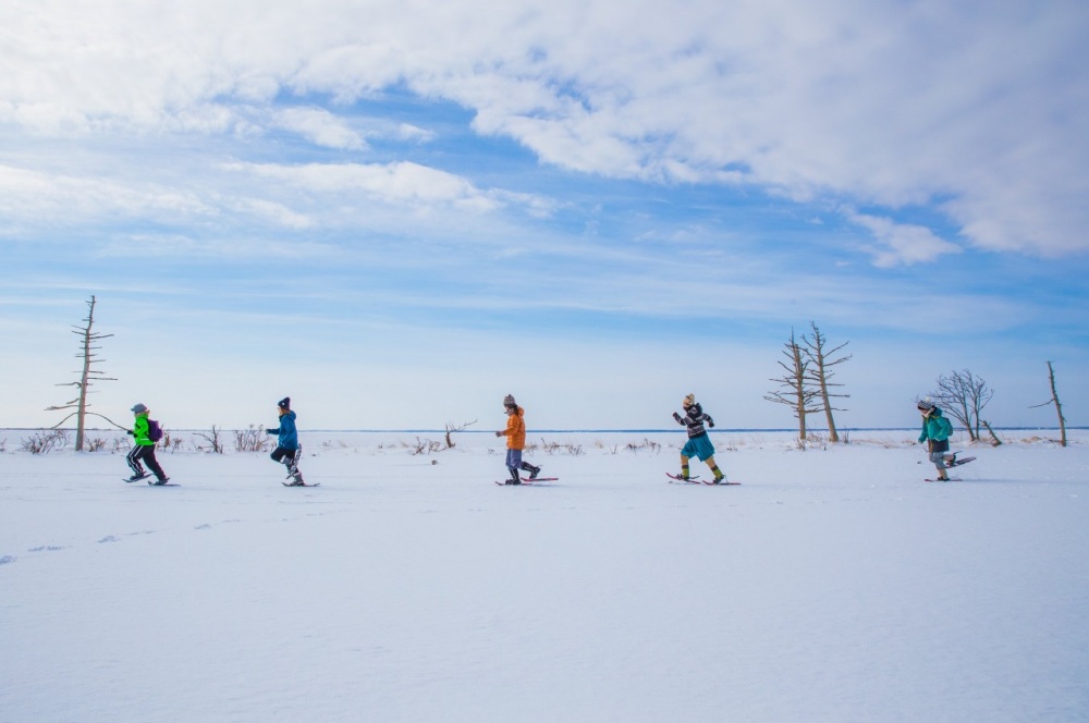 海と湿原の境界に、風や雪に耐えてきた立ち枯れの木々が静かに並ぶ原風景。冬になると空気は澄み、耳を澄ますと風の音だけが広がります。遠くまで続く浅い海と水平線は、都会ではなかなか味わえない開放感があります。夕方になると空がやわらかな色に染まり、枯れ木のシルエットが浮かび上がる景色は、旅の中でも心に残るひととき。足元は木道と雪の上を歩く形になりますが、決められたルートを静かに進めば、自然が積み重ねてきた時間を感じられます。近くのネイチャーセンターでは、この場所の自然や生きものについて学ぶこともでき、景色を見るだけで終わらない楽しみがあるのも魅力です。