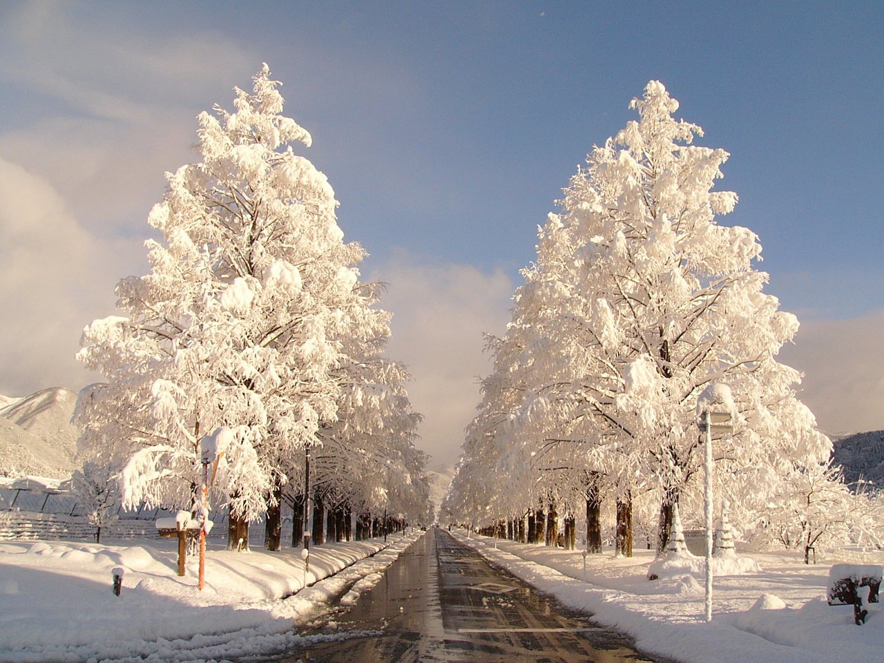 雪に縁取られた一直線の並木道が、すっと伸びる冬の絶景。雪が降ったあとの朝には、枝に残る霧氷がきらきらと光ります。道路沿いは停車できない場所が多く、歩道からの観賞が基本。湖や山への寄り道もしやすく、短時間でも冬らしい景色を楽しめます。