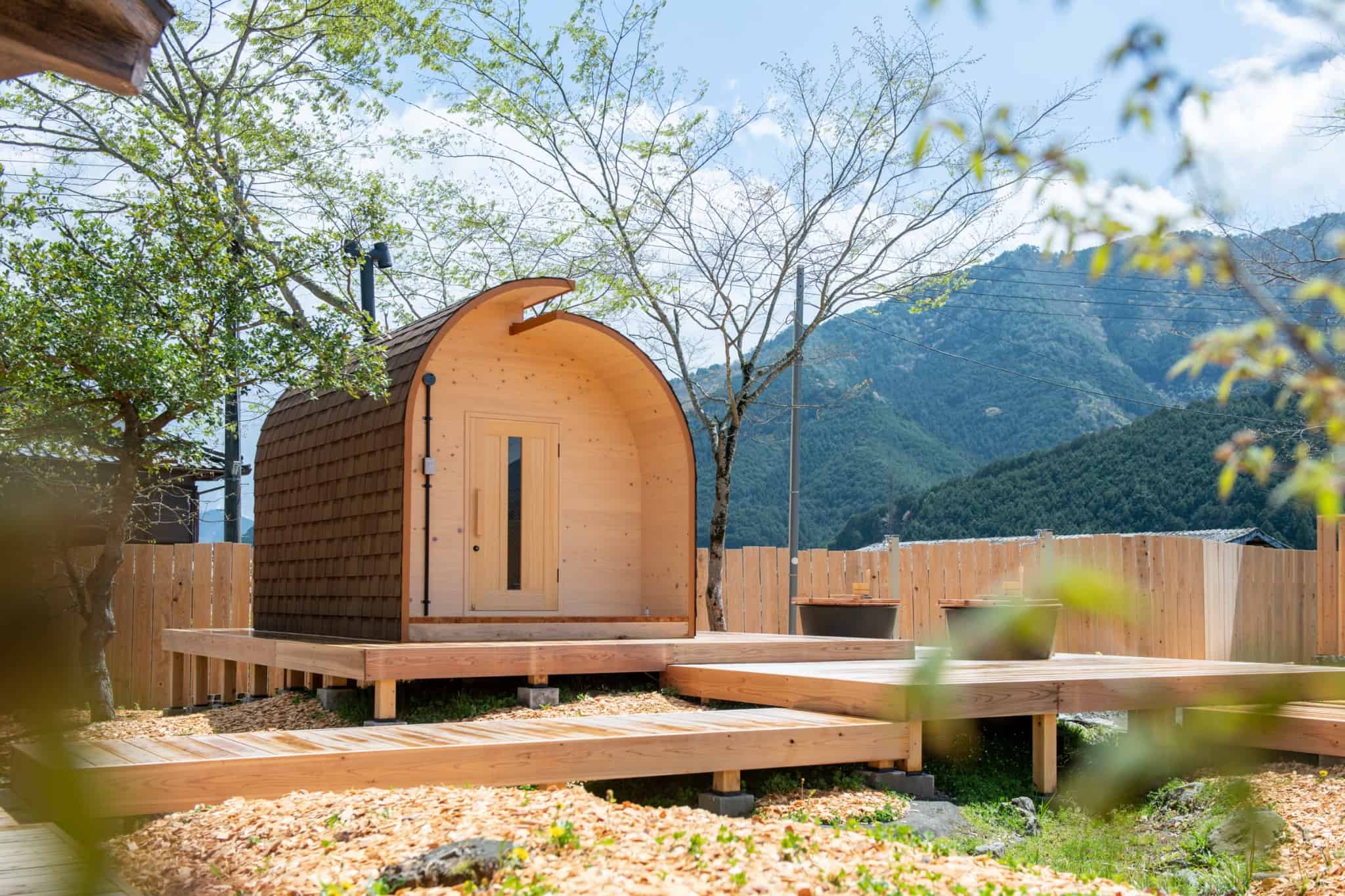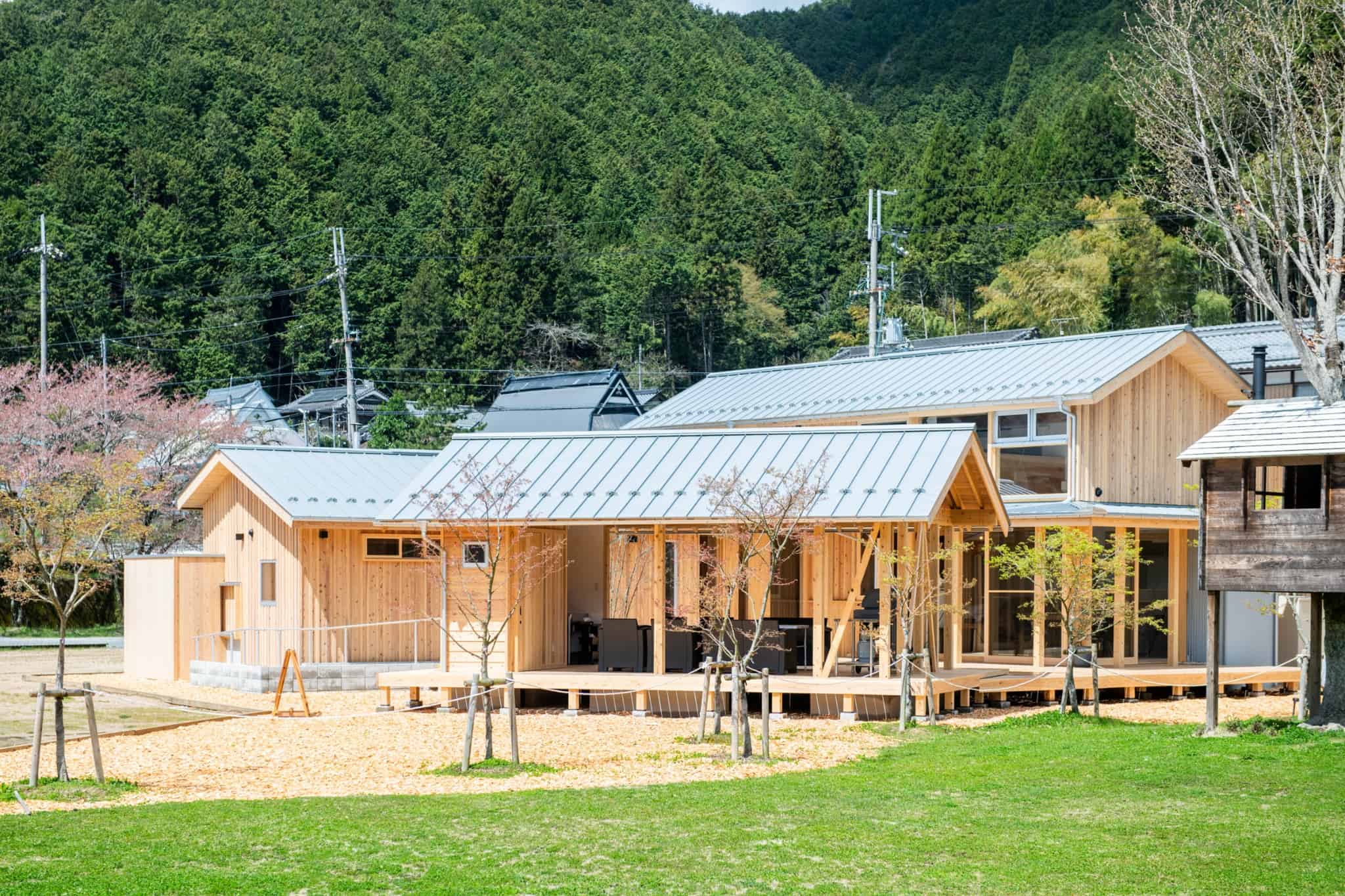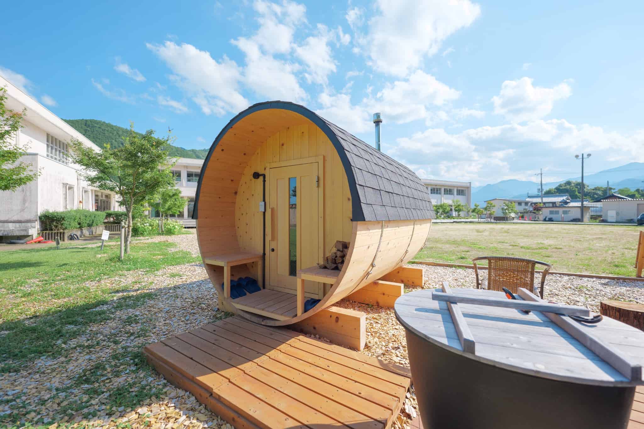 兵庫県丹波市の廃校利活用施設「FOREST DOOR -旧神楽小学校-」のグラウンドに建つ、貸切サウナ付きの「木を楽しむ一棟貸しの宿」。