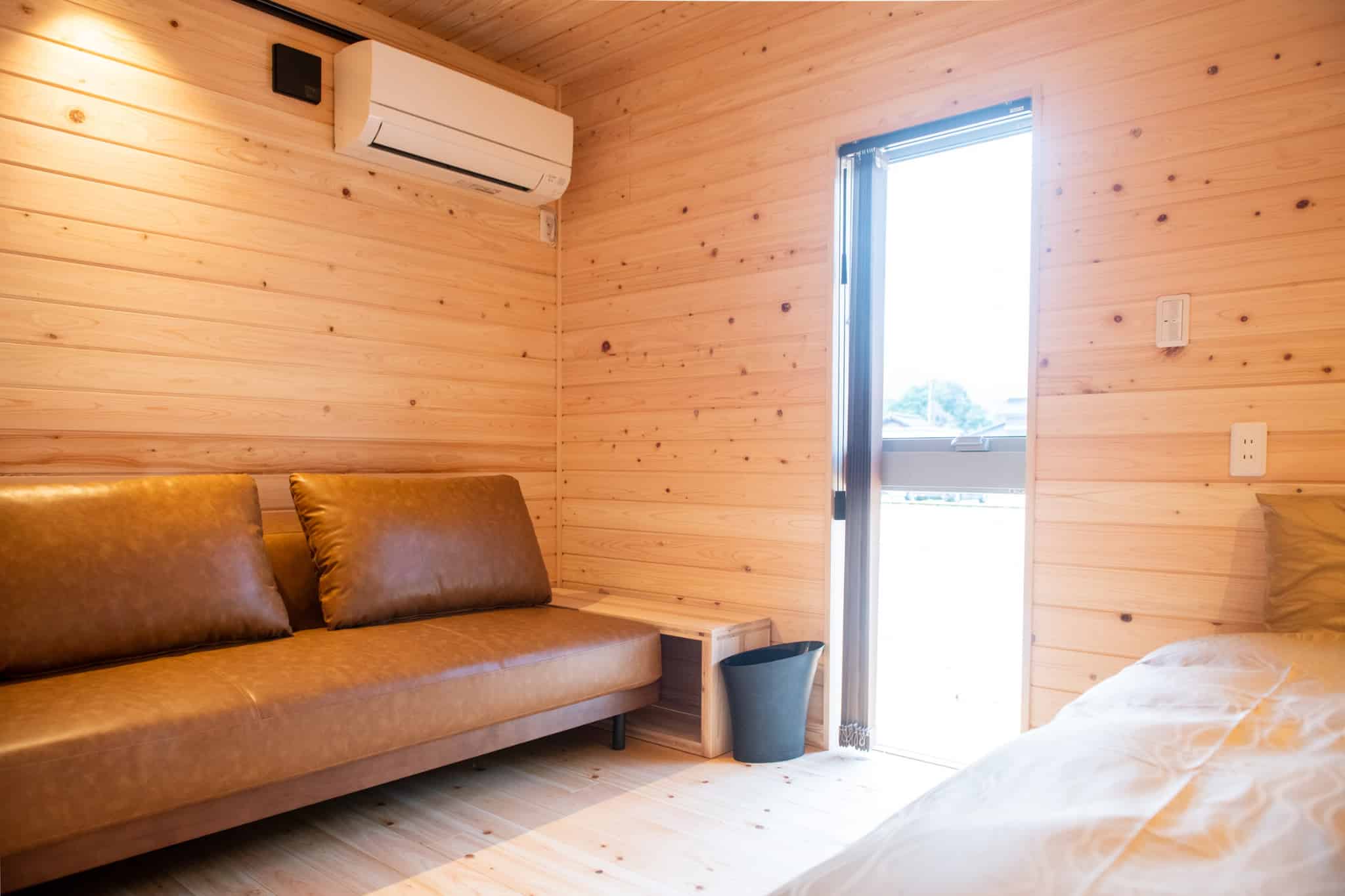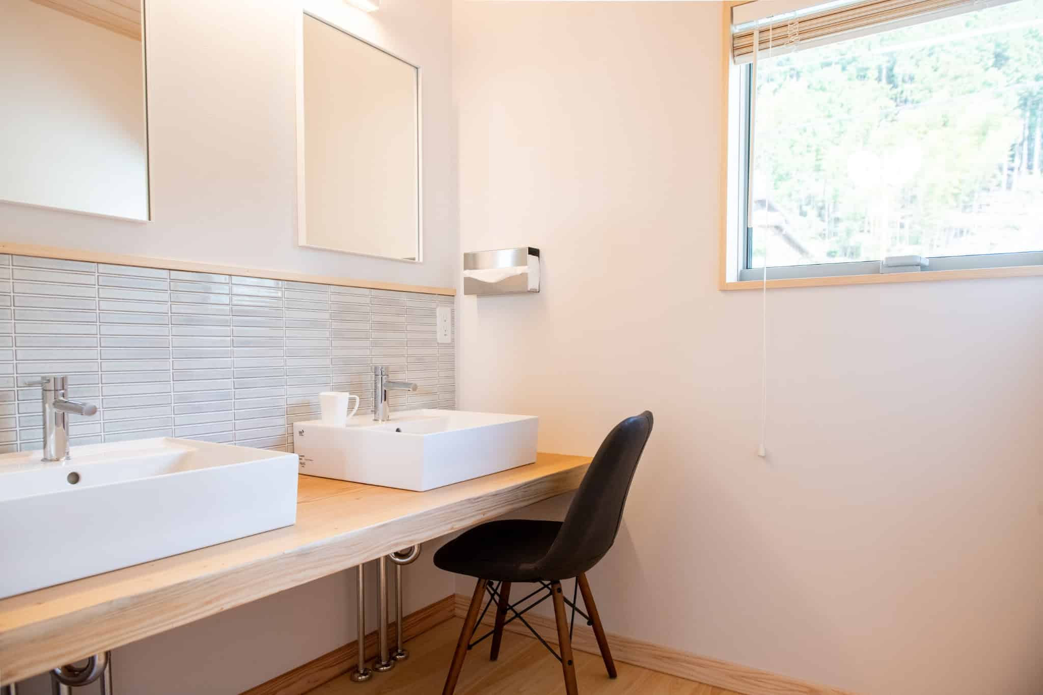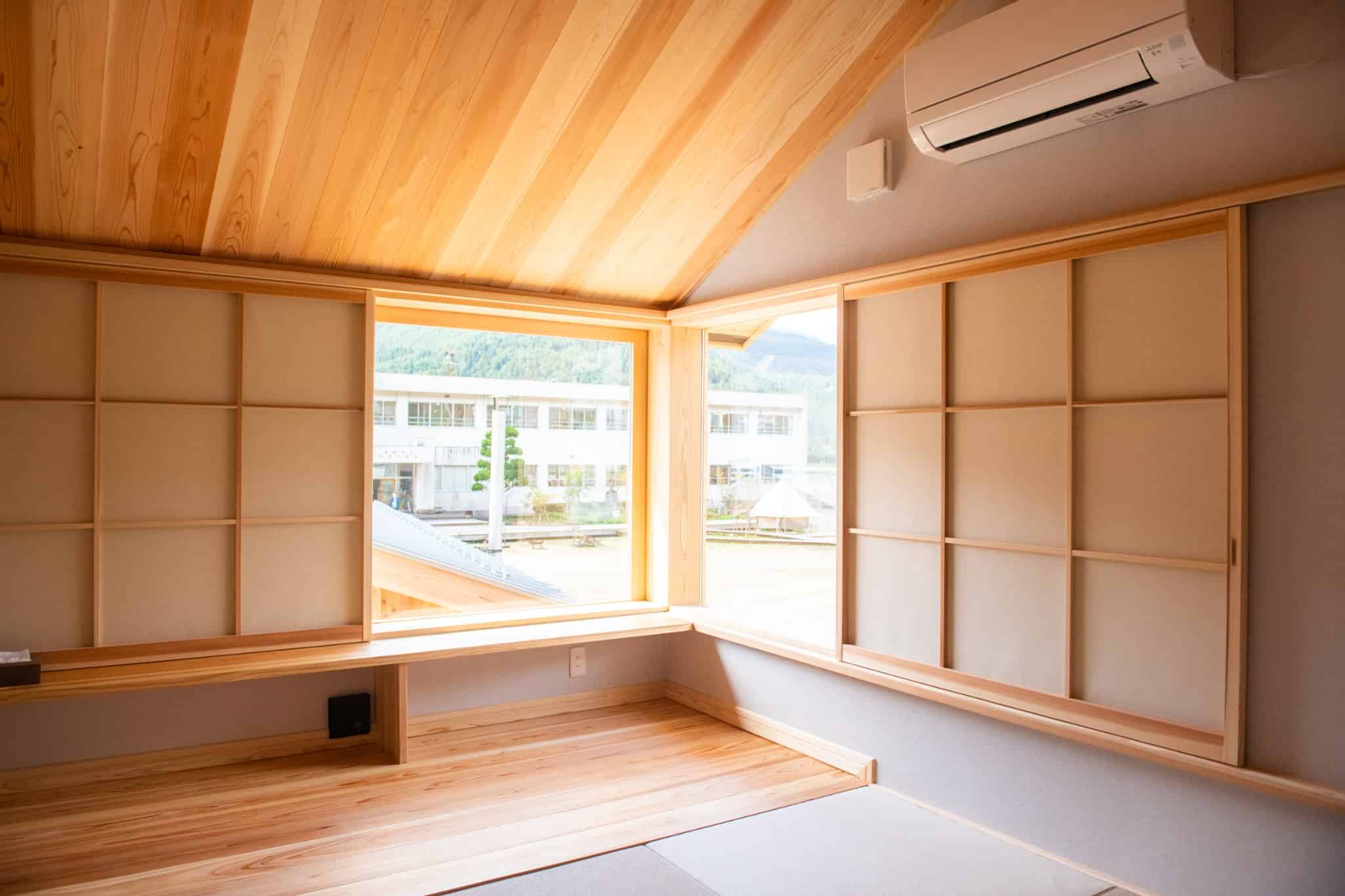 兵庫県丹波市の廃校利活用施設「FOREST DOOR -旧神楽小学校-」のグラウンドに建つ、貸切サウナ付きの「木を楽しむ一棟貸しの宿」。