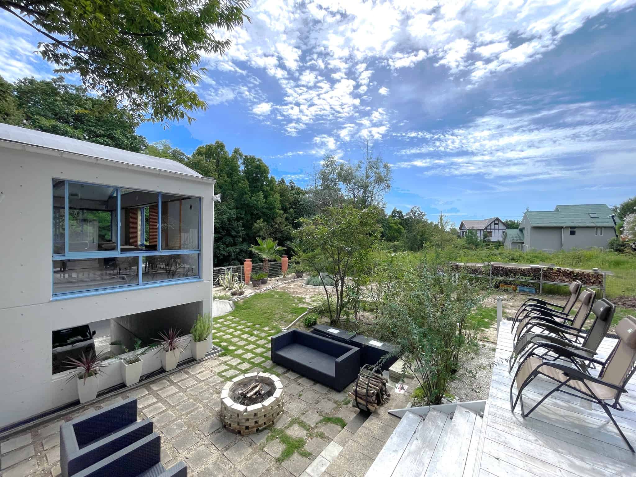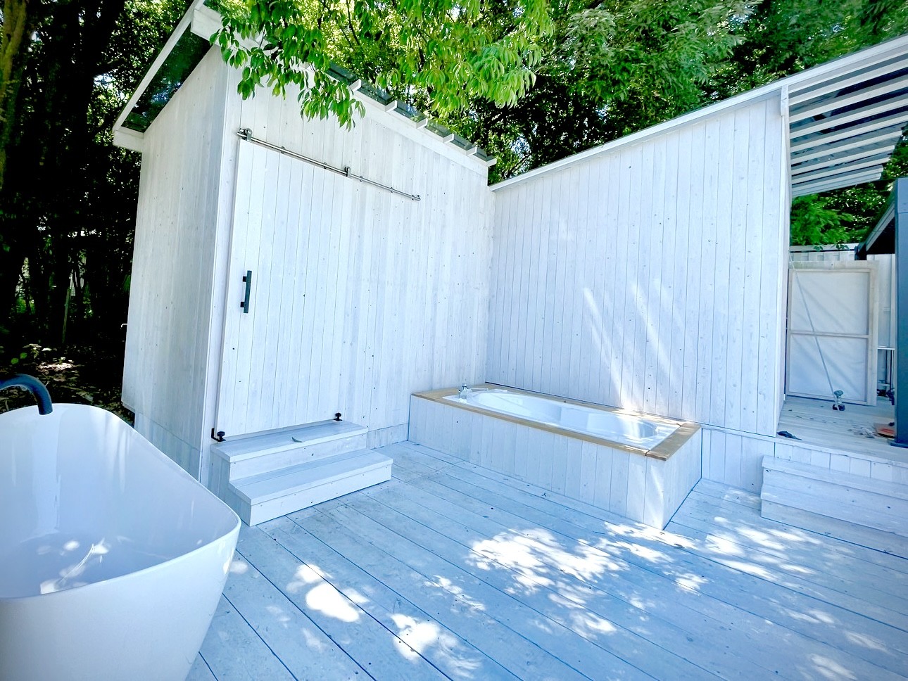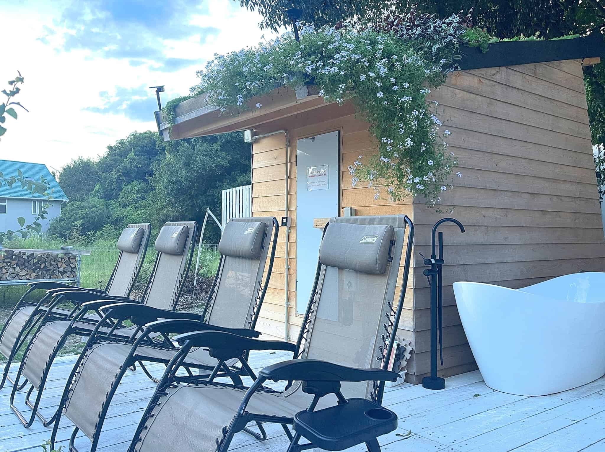 玄関からつながる真っ白な広いウッドテラスには屋外ダイニング、BBQコンロ、ジャグジー、焚火台、シャワー×2、更衣室、トイレも完備。