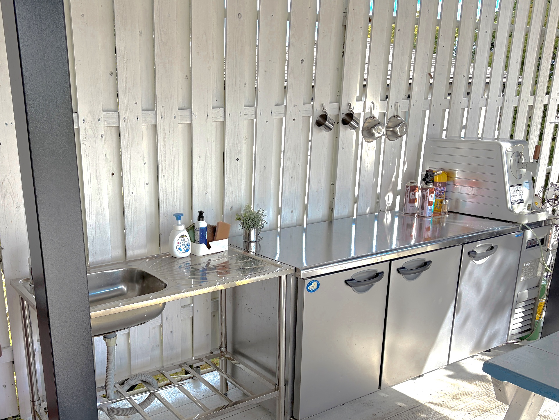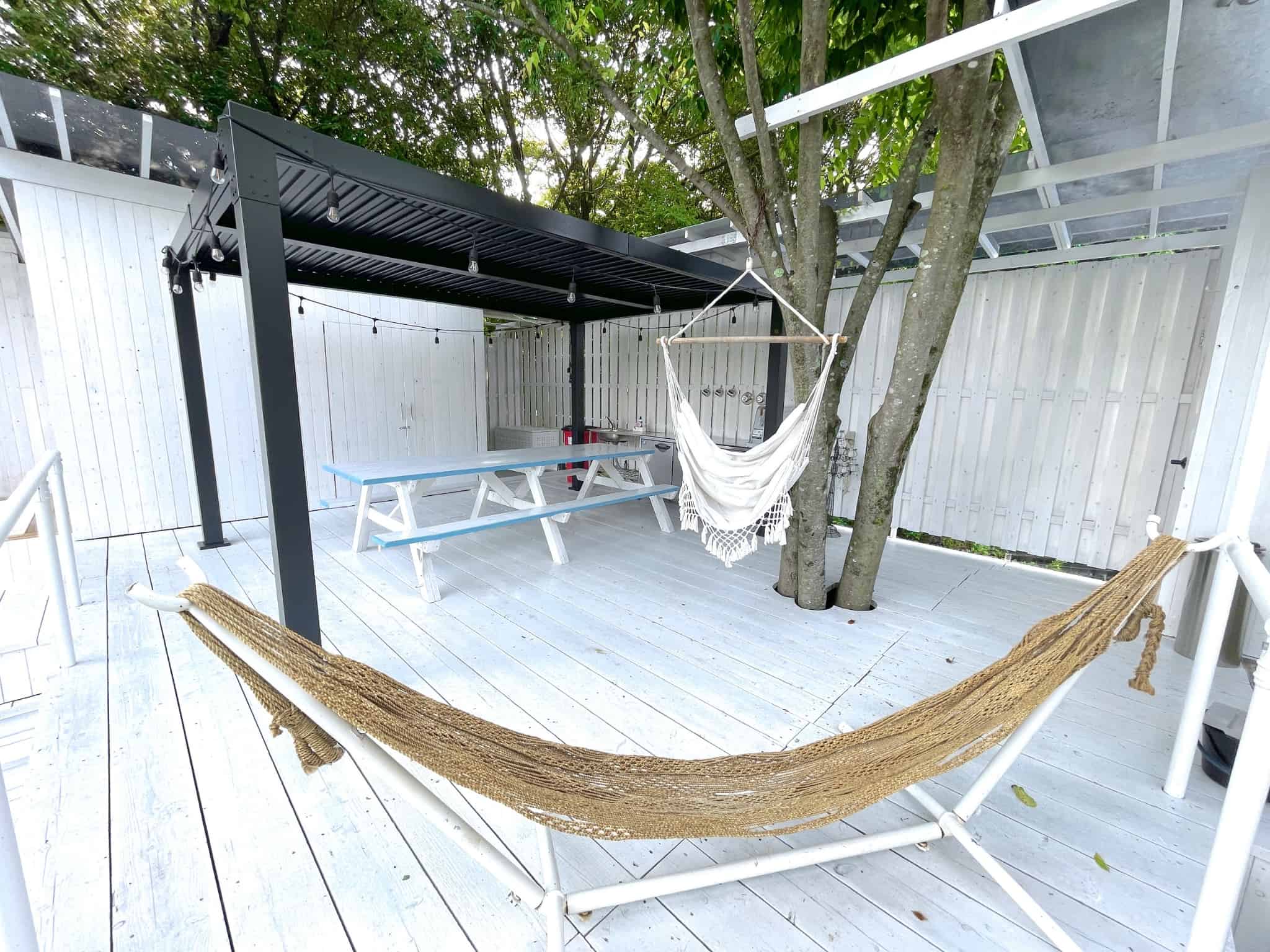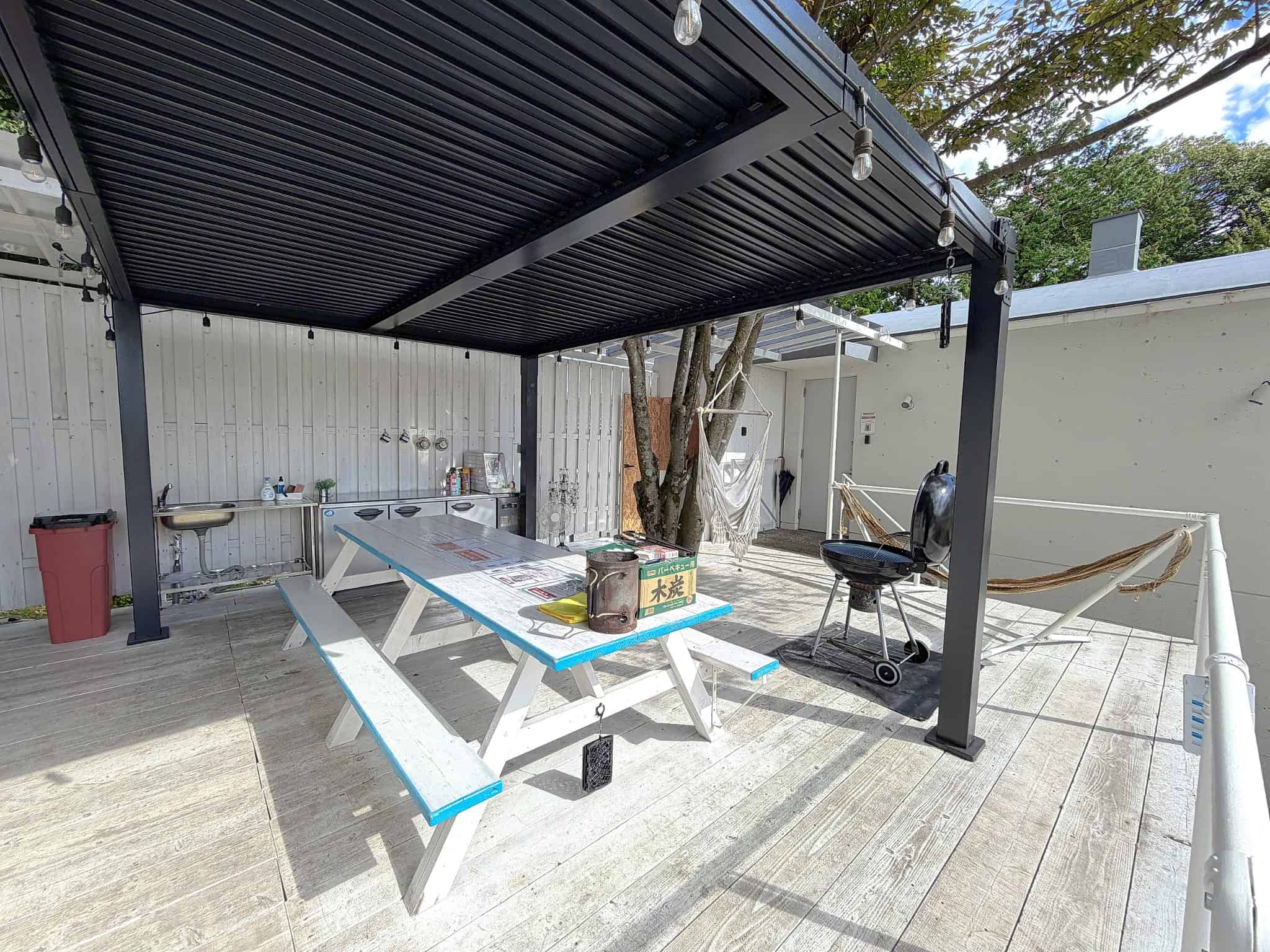 玄関からつながる真っ白な広いウッドテラスには屋外ダイニング、BBQコンロ、ジャグジー、焚火台、シャワー×2、更衣室、トイレも完備。