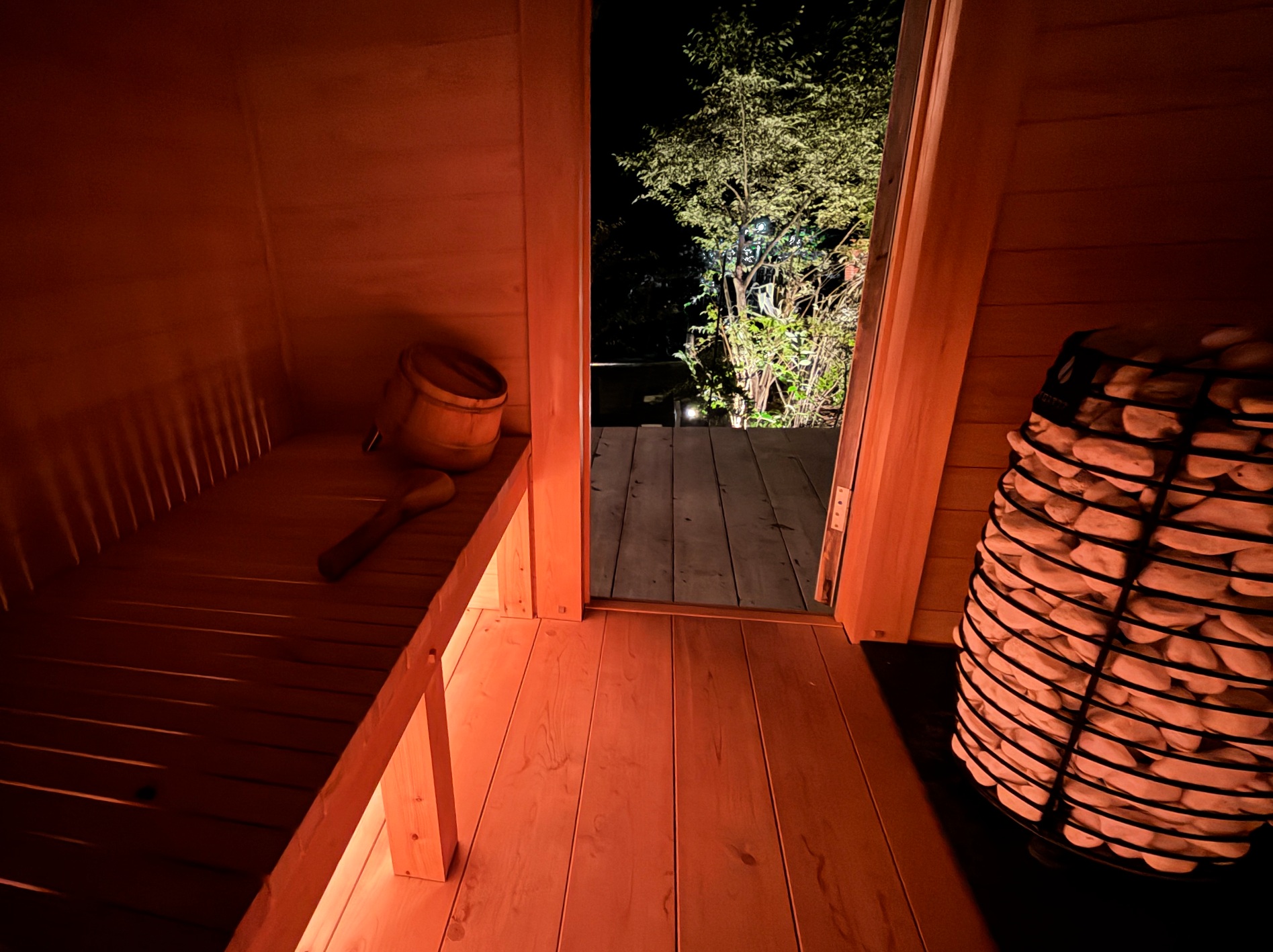 ・サウナは高品質な「電気ストーブ」を採用しています。電源以外のボタン操作はご遠慮ください。ヒノキの香りと設備を守るため、大量の水をかける過度なロウリュはお控えください。