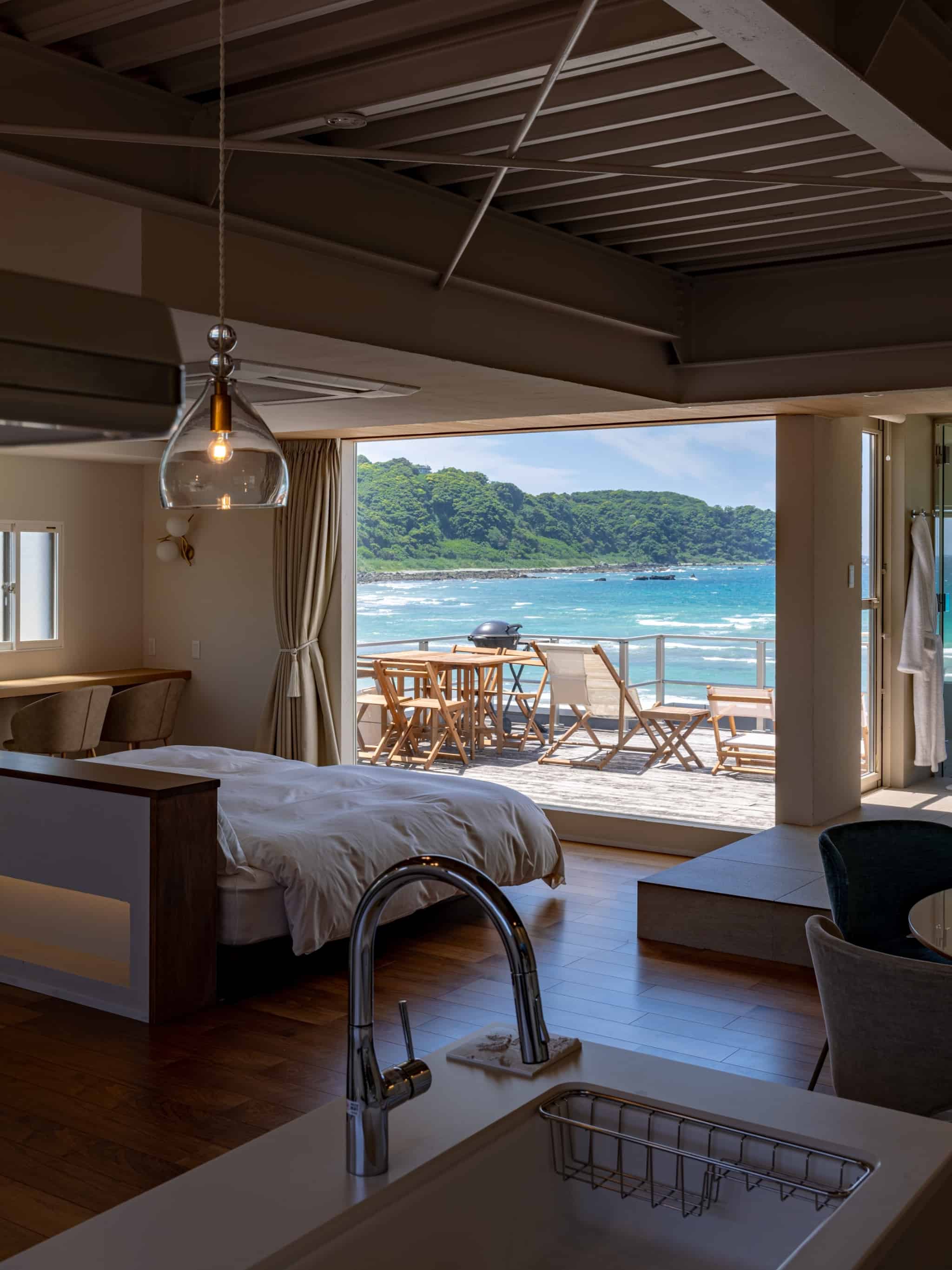 朝起きて、大きな窓から見える海。
