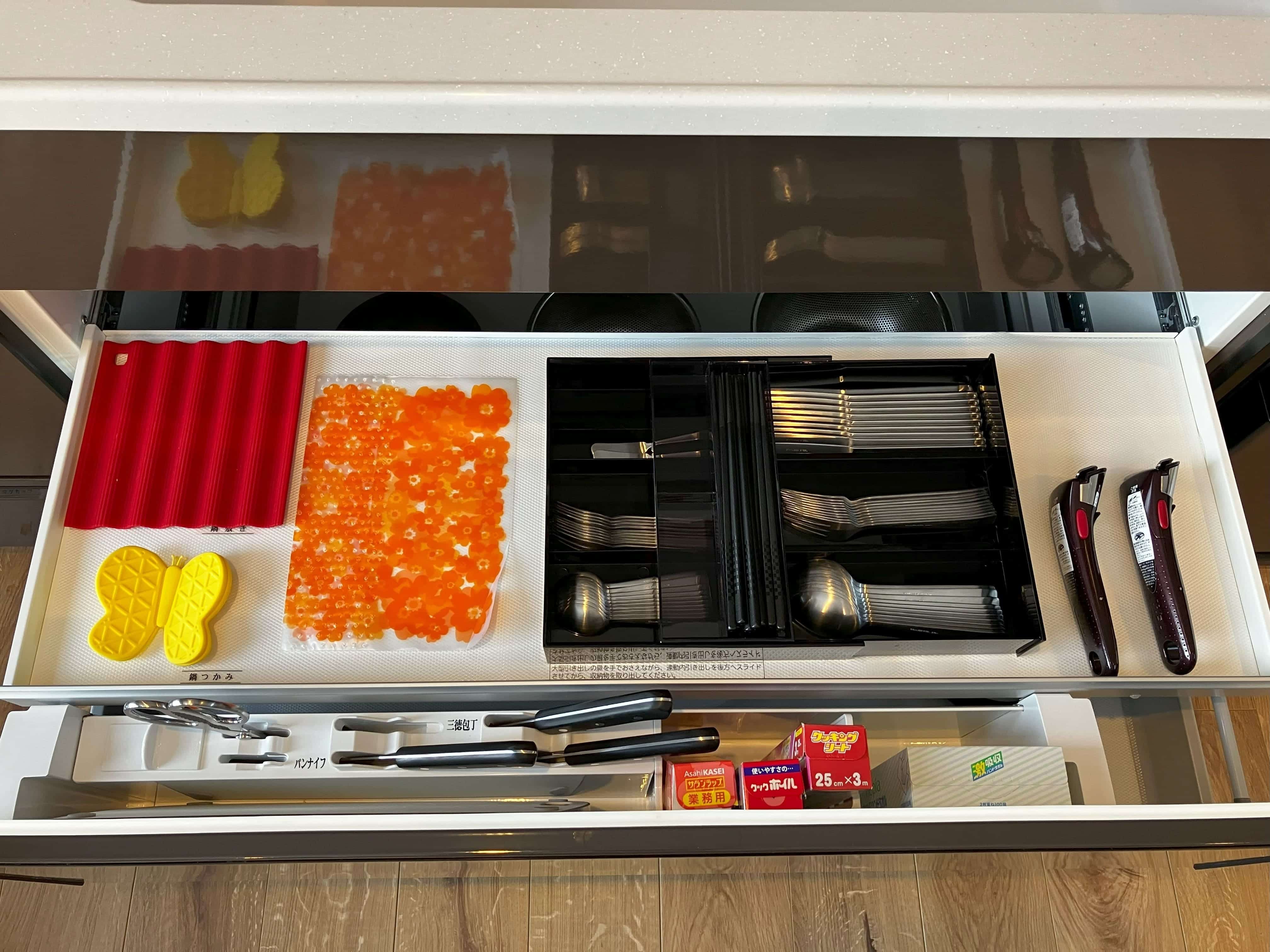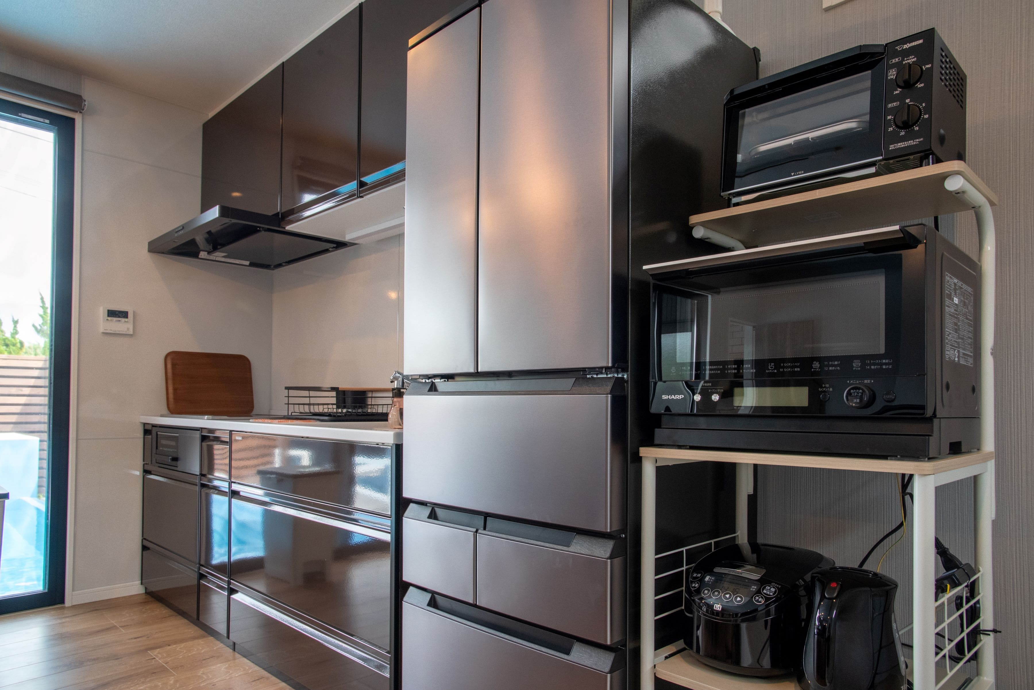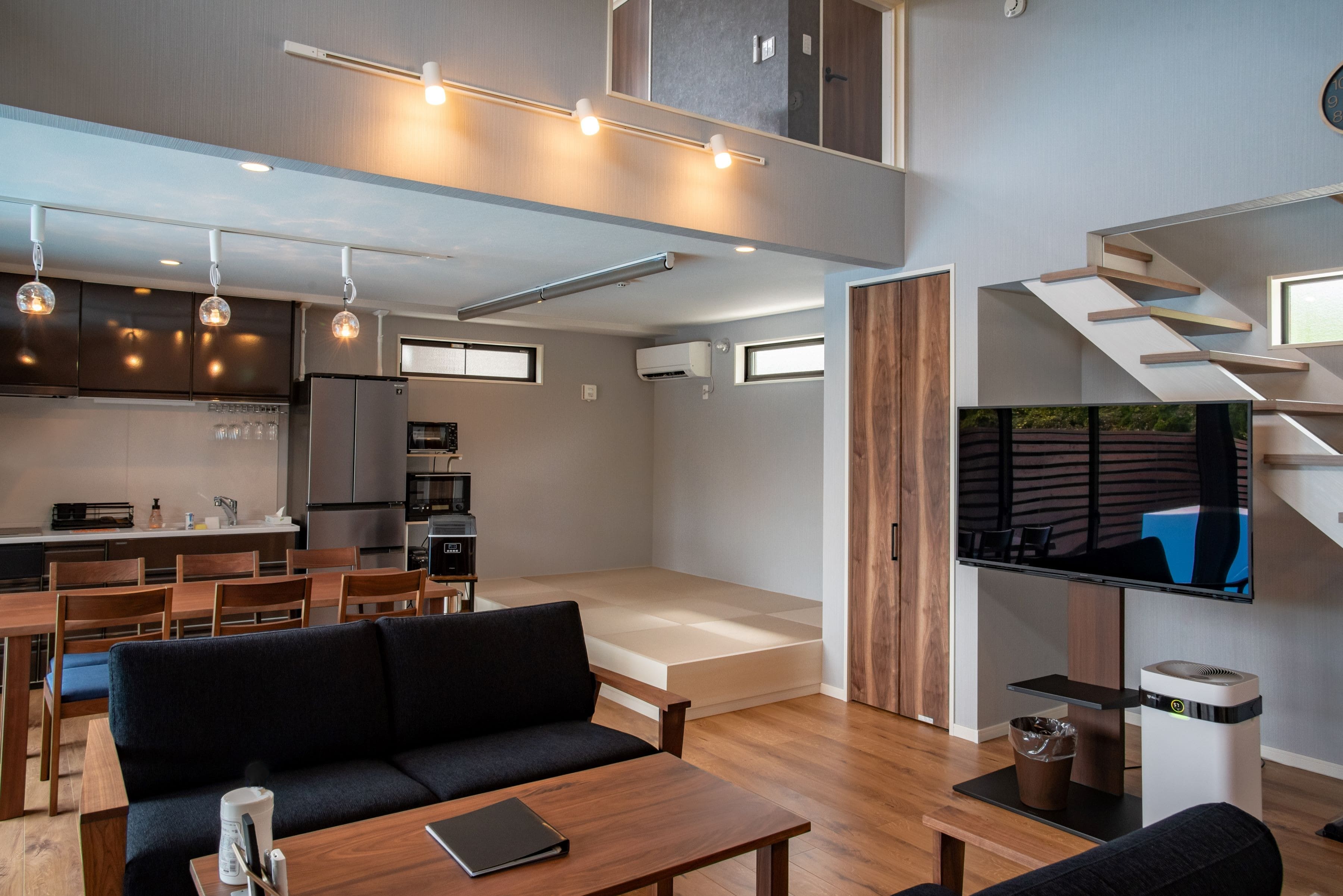 リビングは吹き抜けの開放的な空間。キッチン、ダイニングテーブル、ソファ、畳スペースもあり、お好みのスタイルでリラックスした時間をお過ごしいただけます。
