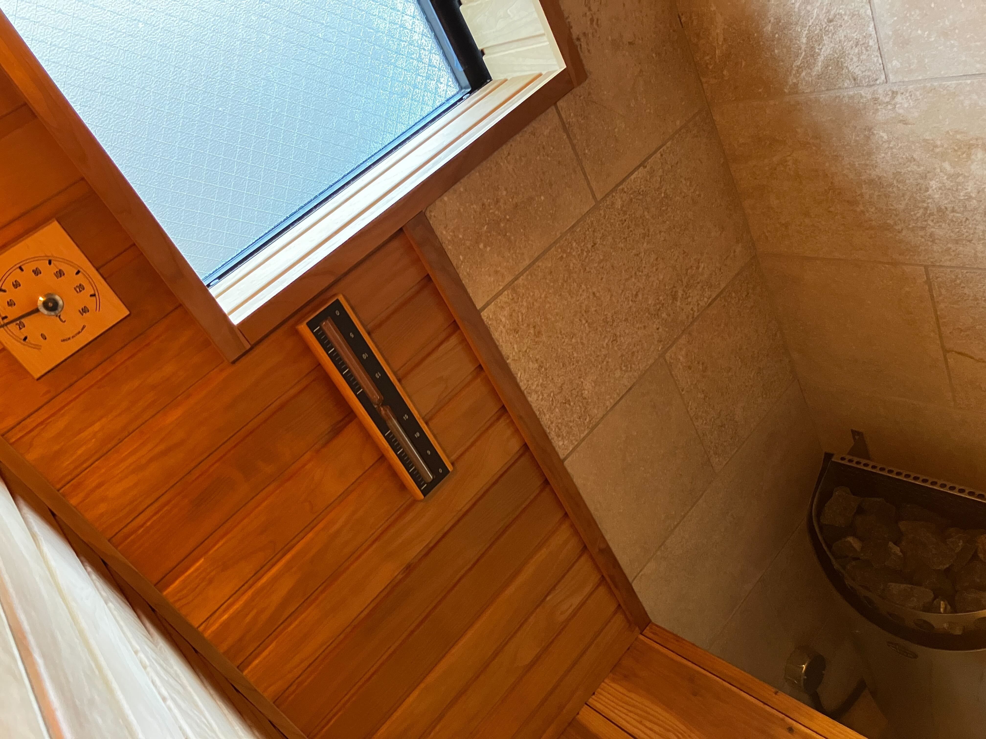 ロウリュも楽しめるサウナストーン使用のサウナルーム。ロウリュアロマ、オリジナルサウナハットもご用意しています。