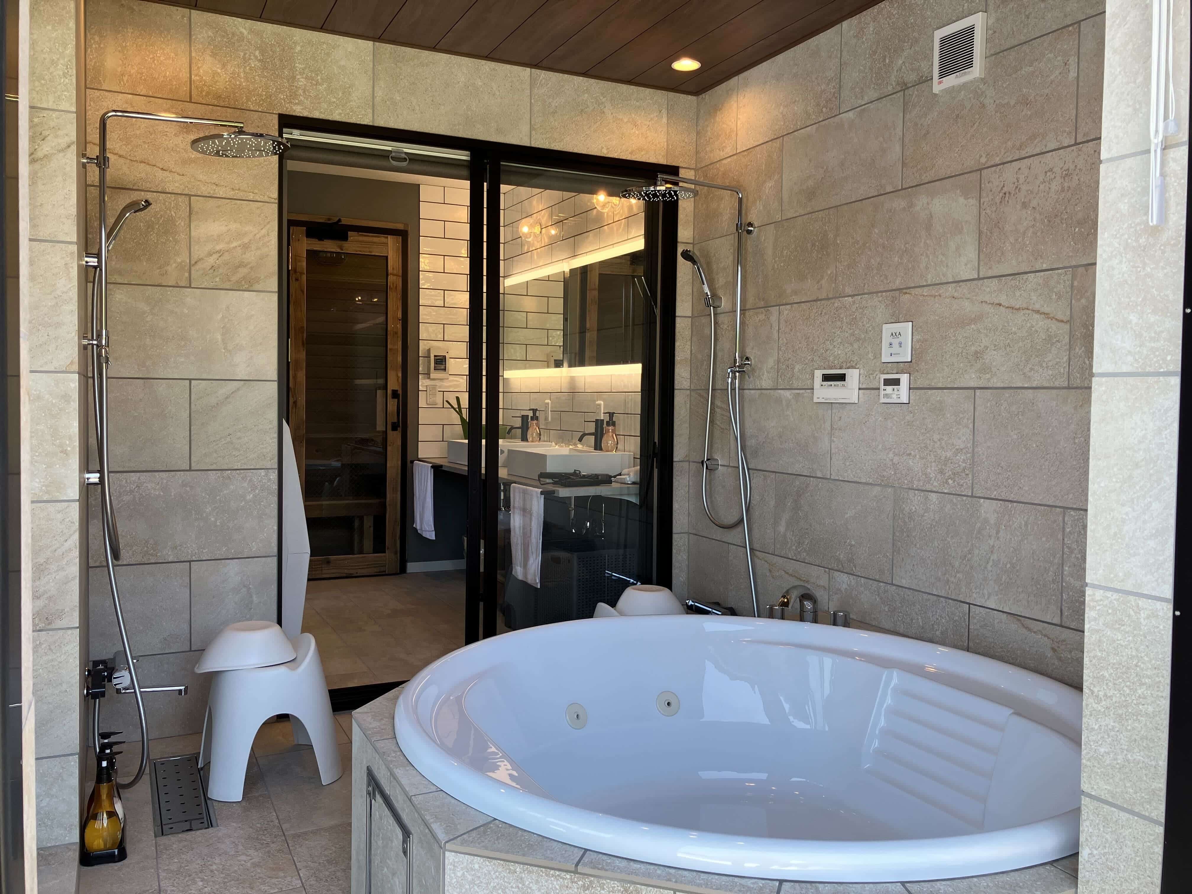 プールサイドから直接行き来ができる浴室にはジャグジーも完備。