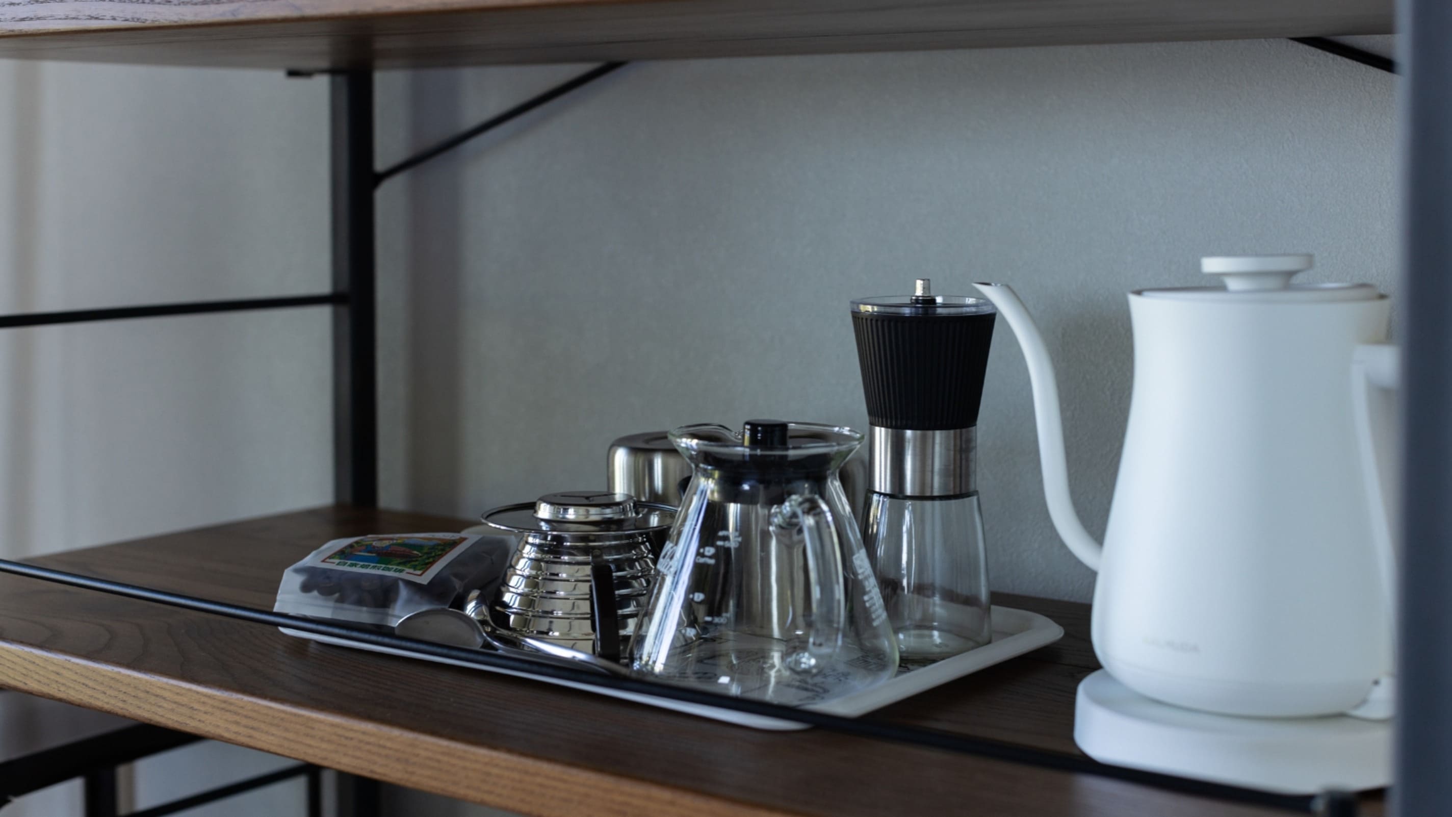 シモンズのセミダブルベッド2台、ソファーベッド、エアコン、ユニットバス、小型冷蔵庫、Bluetoothスピーカー、温水洗浄機付きトイレ、電気ケトル、テーブル&チェア、ランタン、内線電話、freeWi-Fi、セーフティボックス、ドライヤー、スリッパ