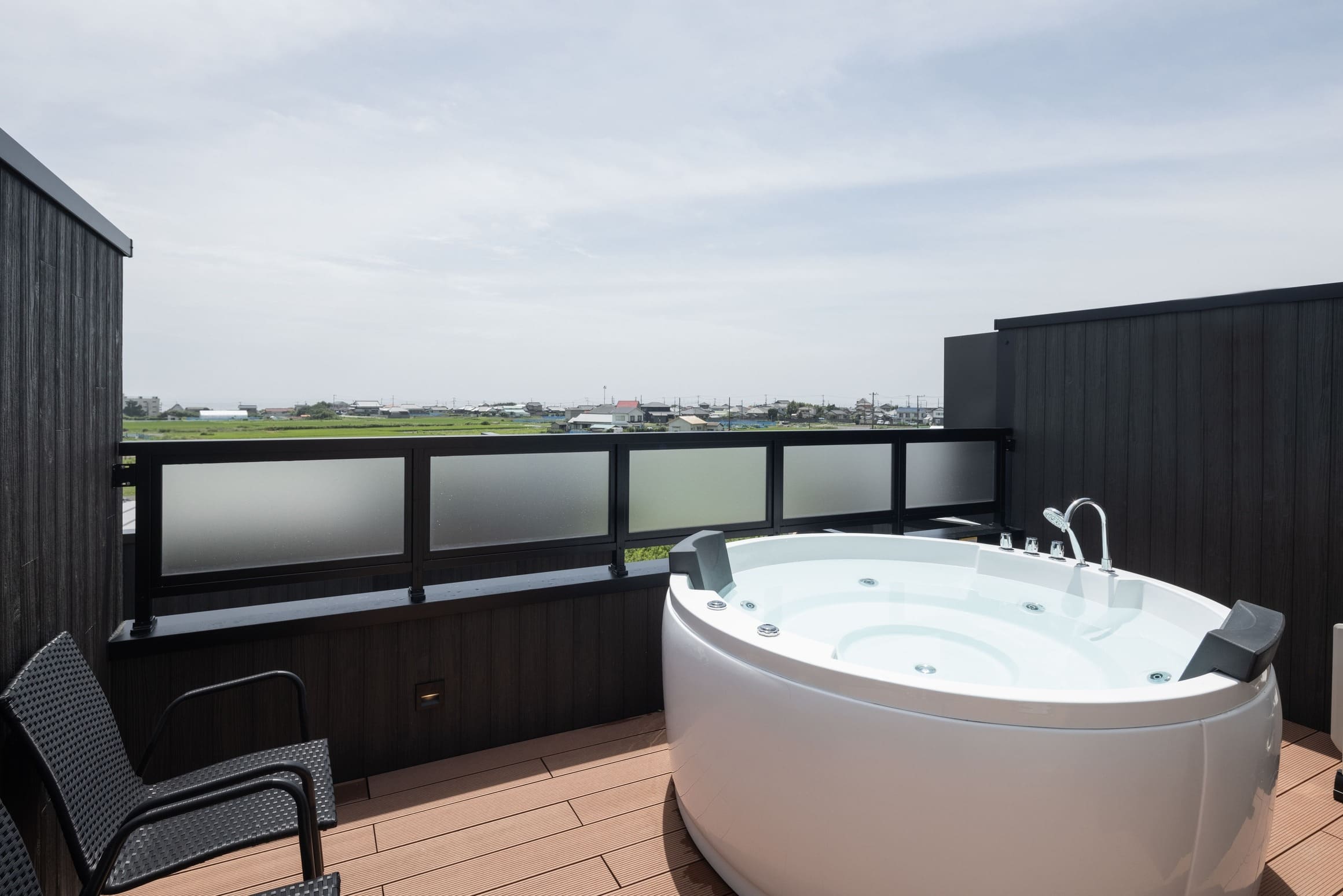 屋根付きの広々としたウッドデッキでのBBQは、屋外での食事をより楽しむことができます。また、屋上テラスに設置されたジャクジーでは、広々とした空を眺めながら、リラックスした時間を過ごすことができます。