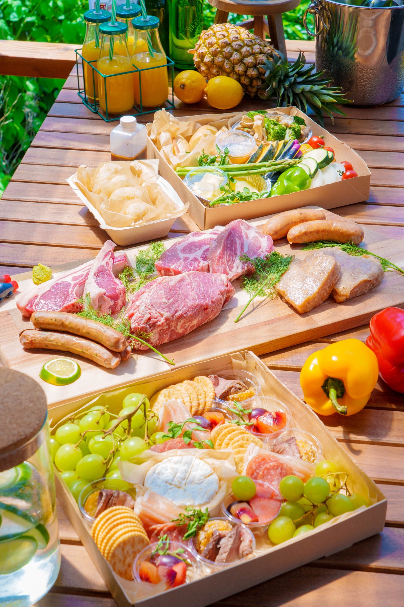 季節のお野菜、きのこのアヒージョ、おにぎり、バケット、カマンベールチーズやサラミなどのおつまみセット、フルーツ