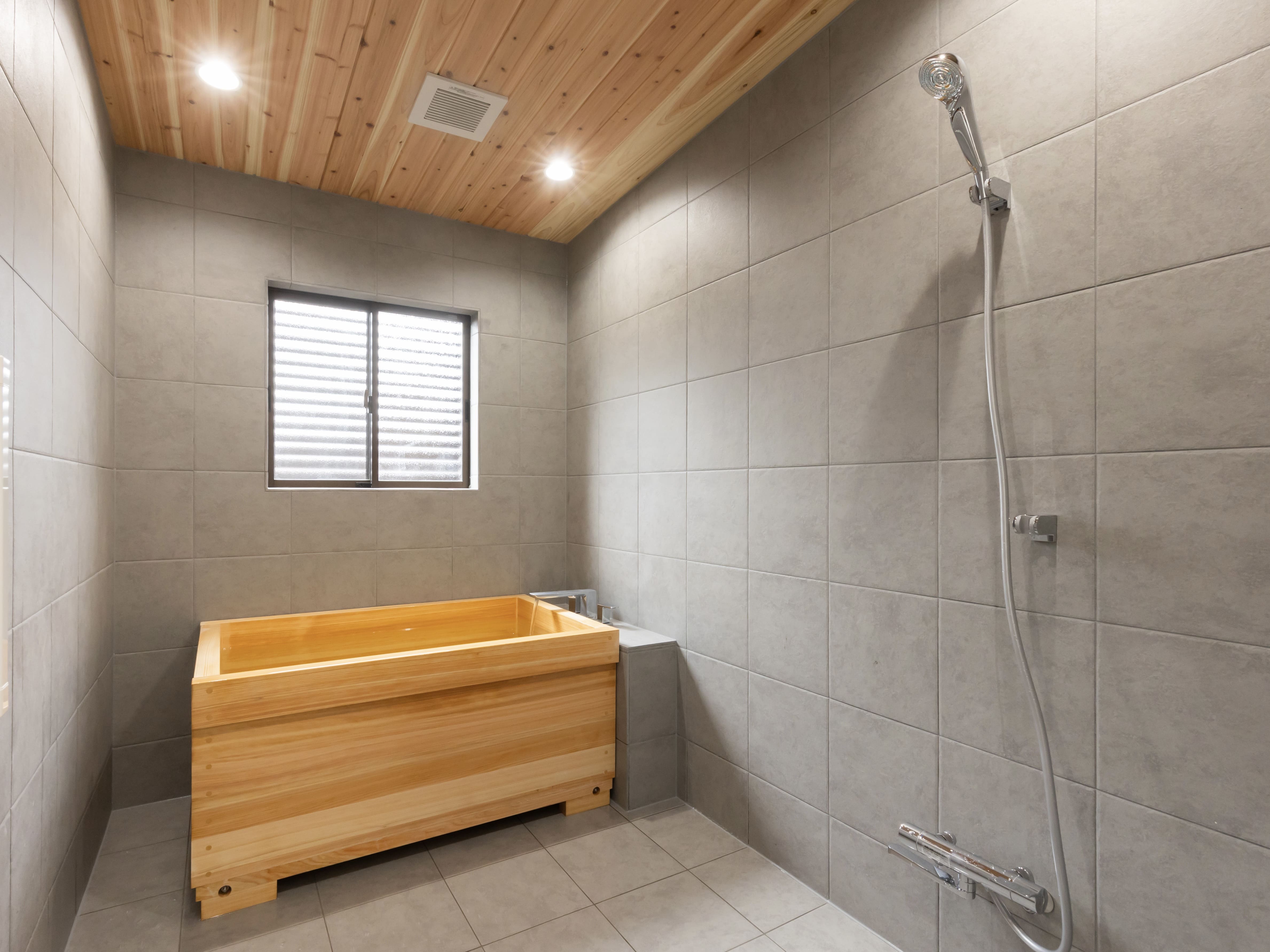 お風呂は温泉ではありませんが、天然木の香りが広がるヒノキ風呂です。
