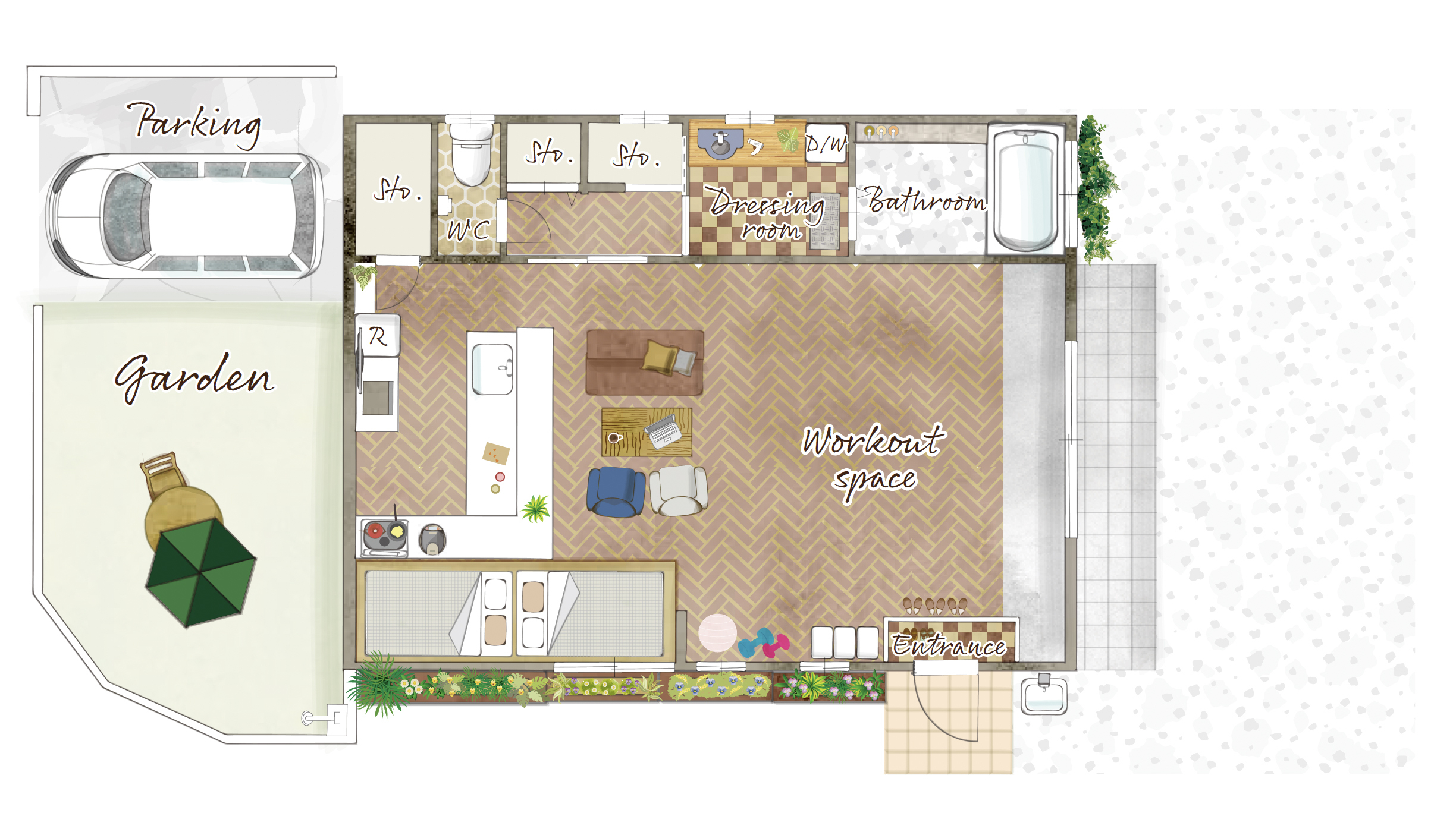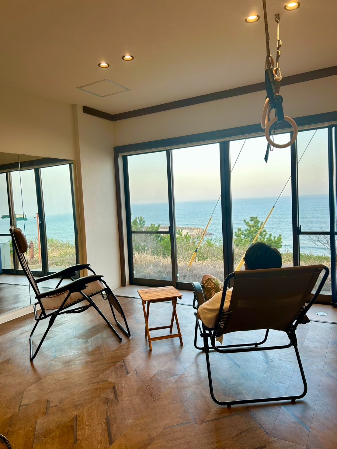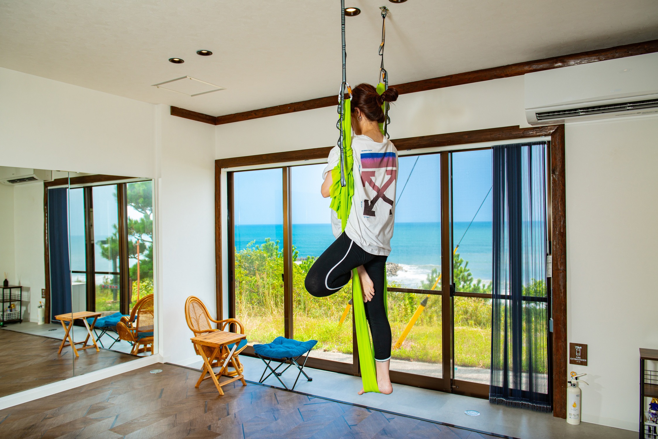エアリアルヨガやピラティス、ダンス、ストレッチ、吊り輪や軽度の筋トレができるように生活スペースを狭めて、身体を動かしたりリトリートスペースに広さを割り当てて創りましたので海に囲まれたプライベートスタジオで、心身ともにリフレッシュして頂けたら嬉しいです。