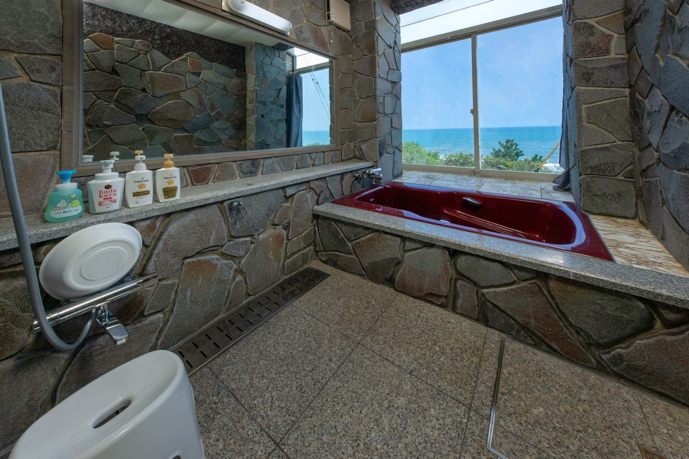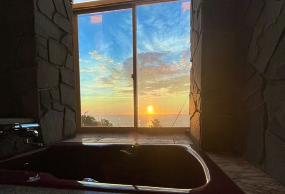 5.浴室海側は全面窓で、太平洋を一望できるように造られており、日中は反射フィルムで外からは見えないようにしてますが、曇りの日やうす暗い時間帯は
