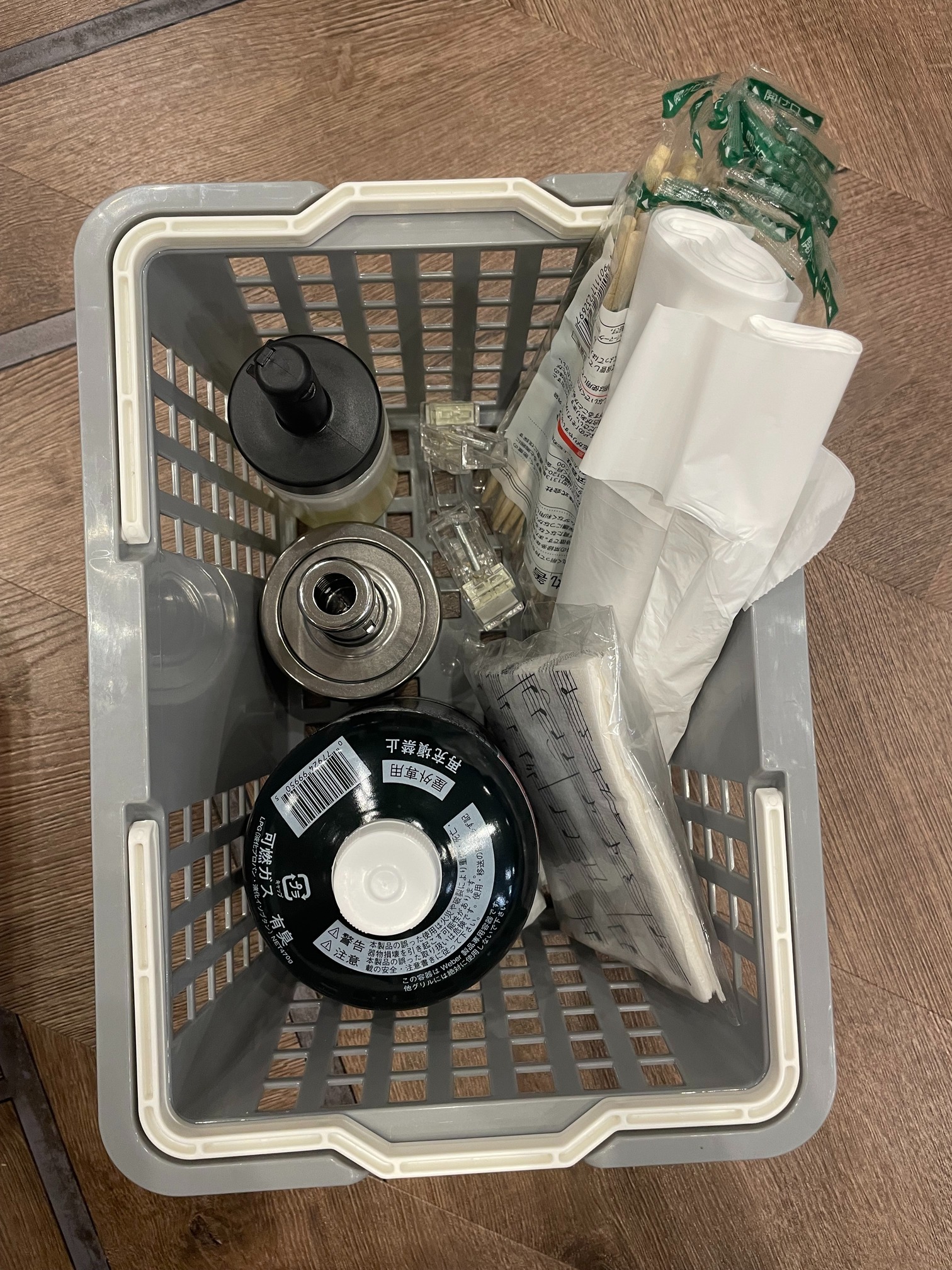 ガス式のwebar製グリル、トング、ハサミ、ゴミ用袋、ウェットティッシュ、油、食器等、割り箸