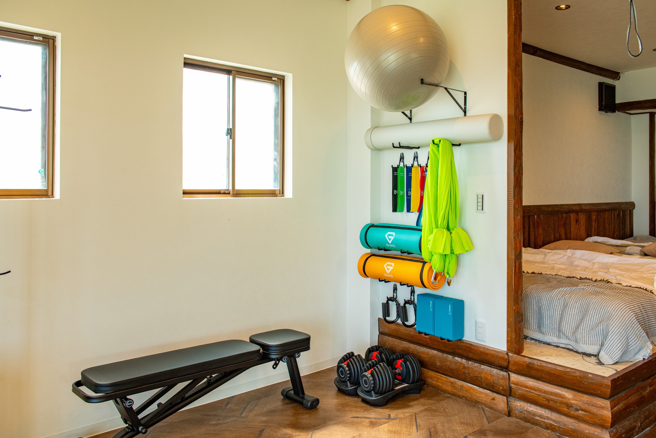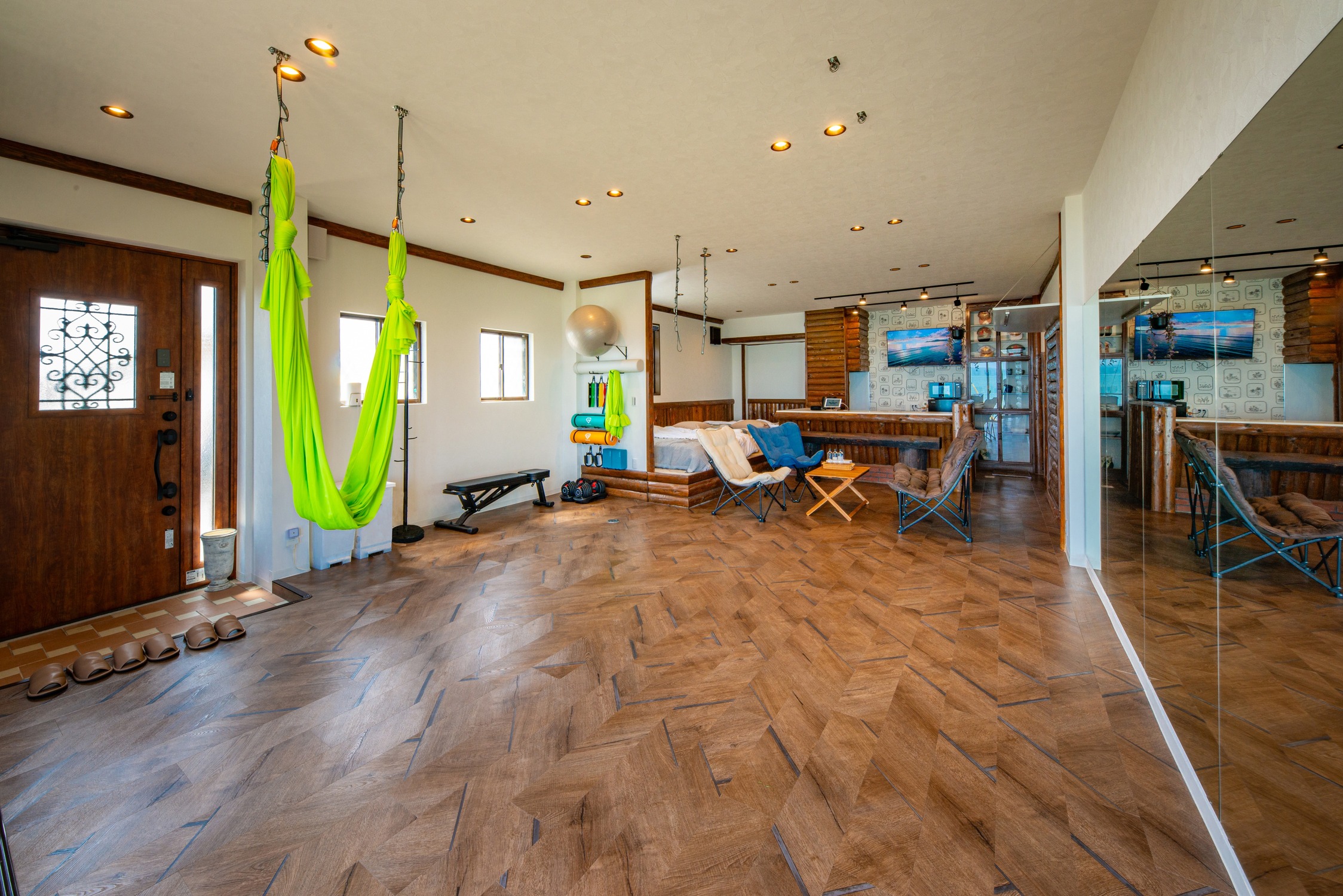 ヨガやストレッチやダンス。軽度の筋トレができるように大きな鏡付ジムが併設されてるユニークな宿です。