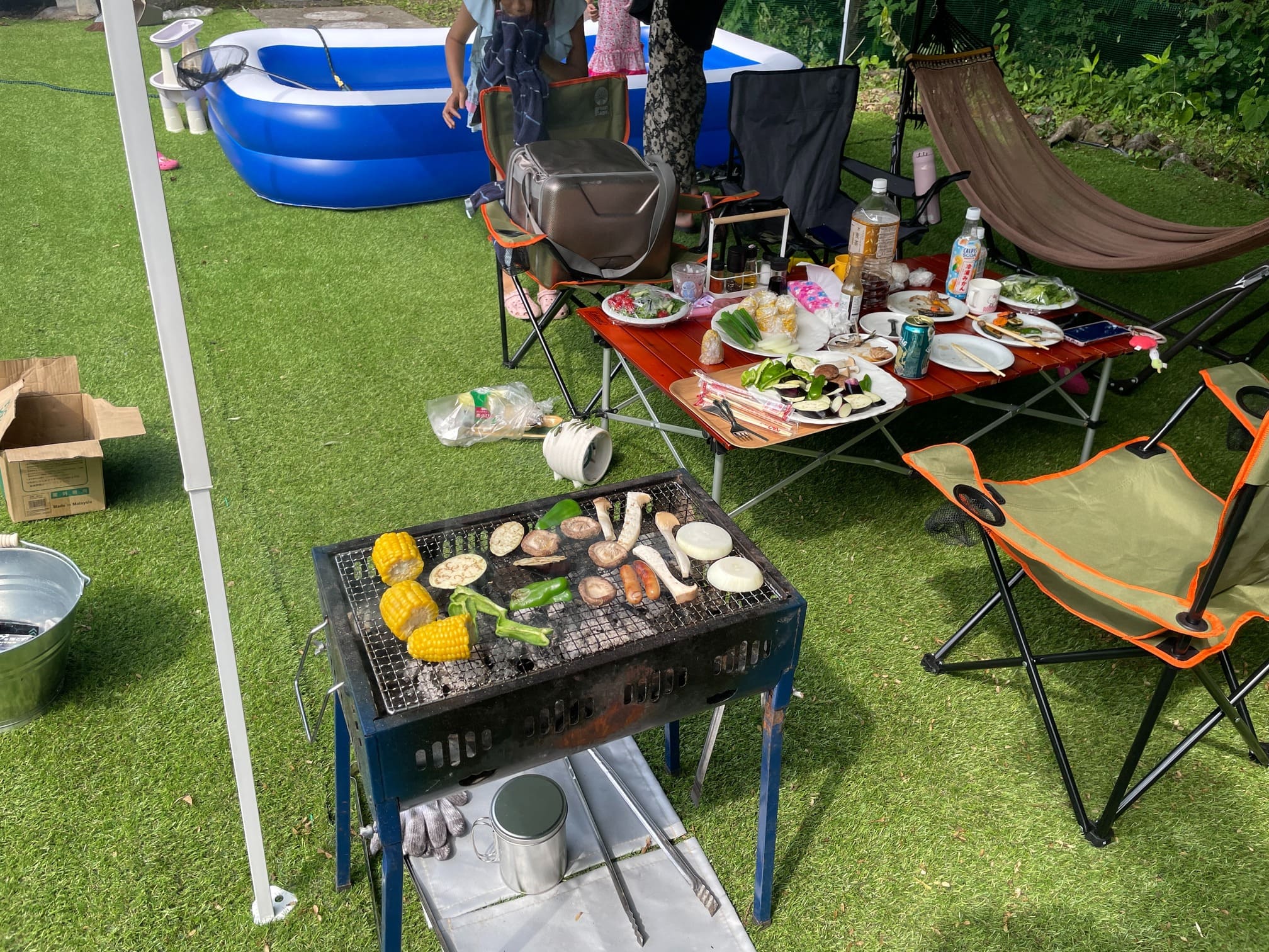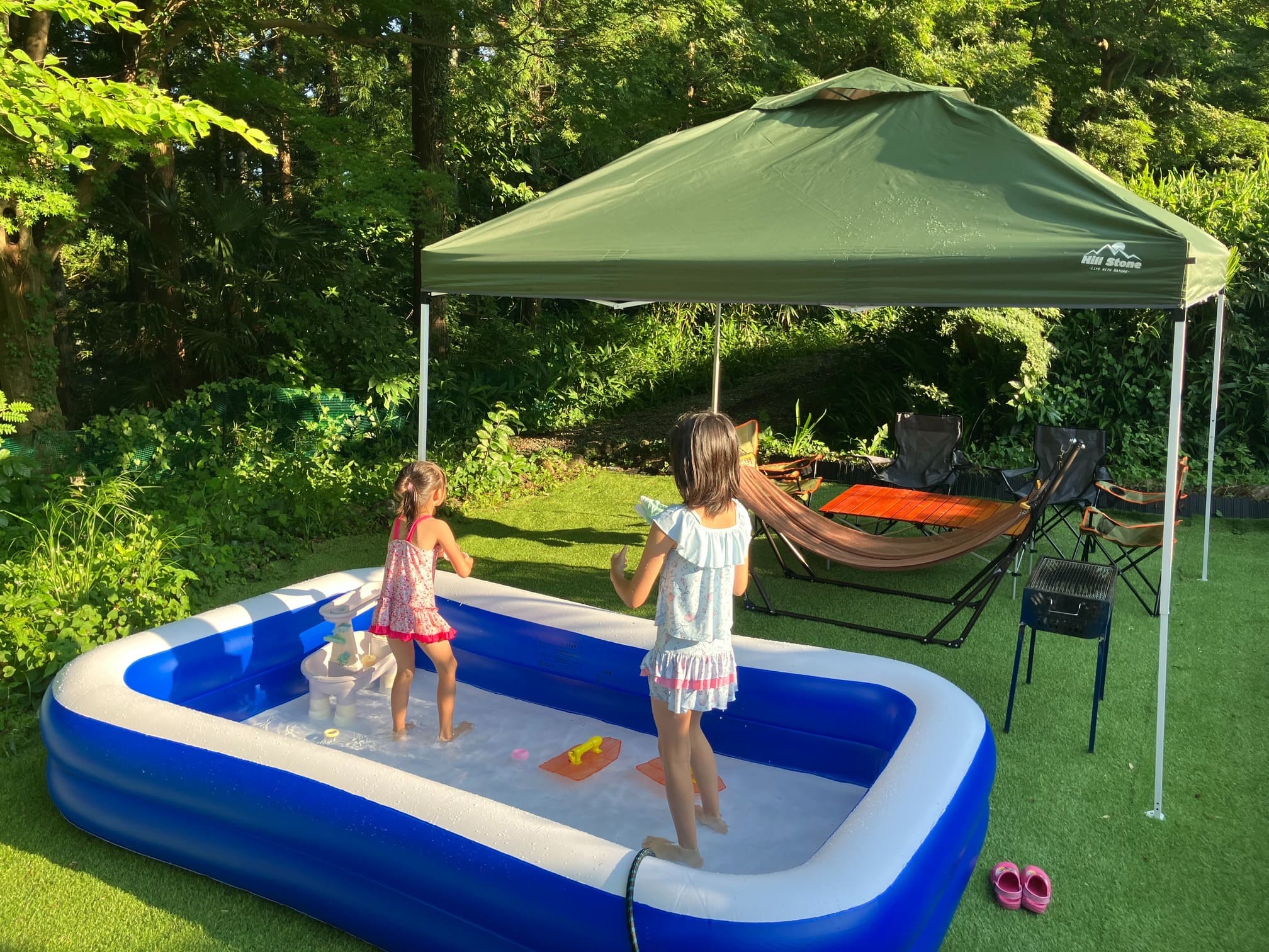 敷地は100坪以上のあり、縁側や人工芝を敷いたお庭でBBQやハンモック、ビニールプールを楽しむことができます
