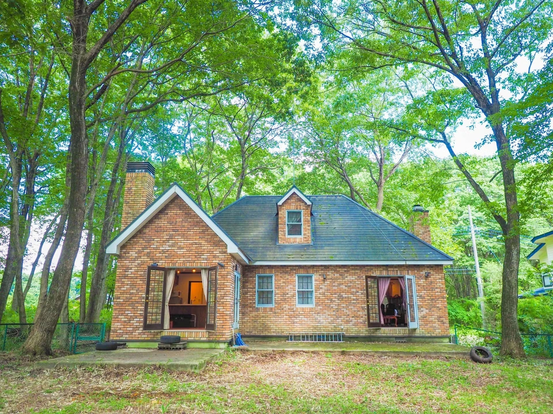 緑に囲まれた森の中、レンガ作りのカナディアンハウスが現れます。