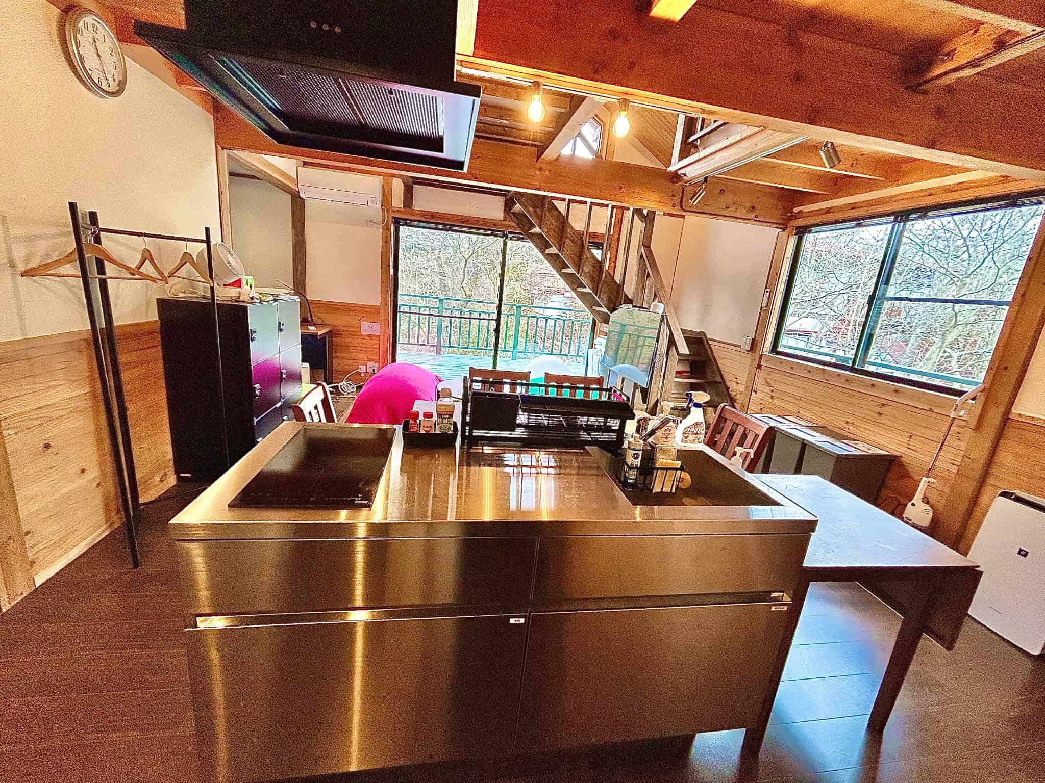 開放感のあるウッドデッキ、秘密基地のようなロフト、お仕事にも最適なワークスペースと高速Wi-Fi、無料の駐車場、デッキでのBBQ(鉄板)、