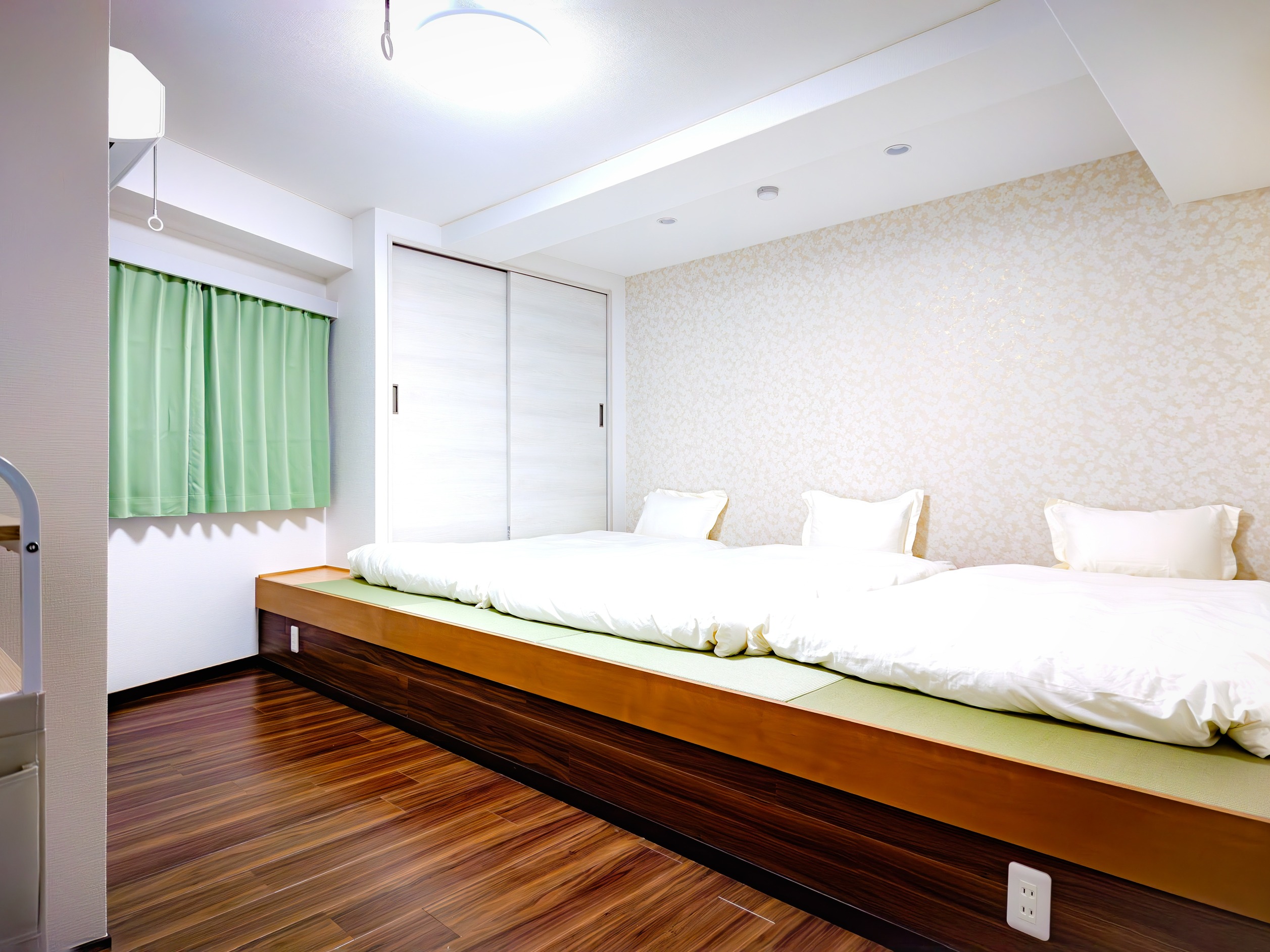 布団での就寝に加え、押し入れ収納とハンガーを備えているため、お荷物の整理や長期滞在にも対応しています。