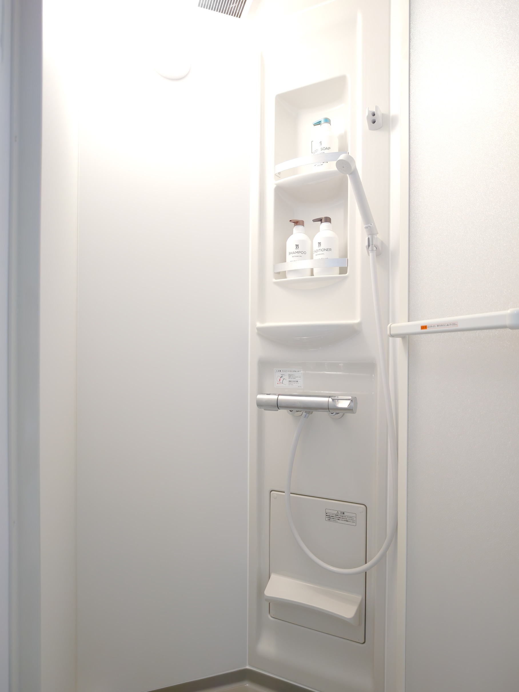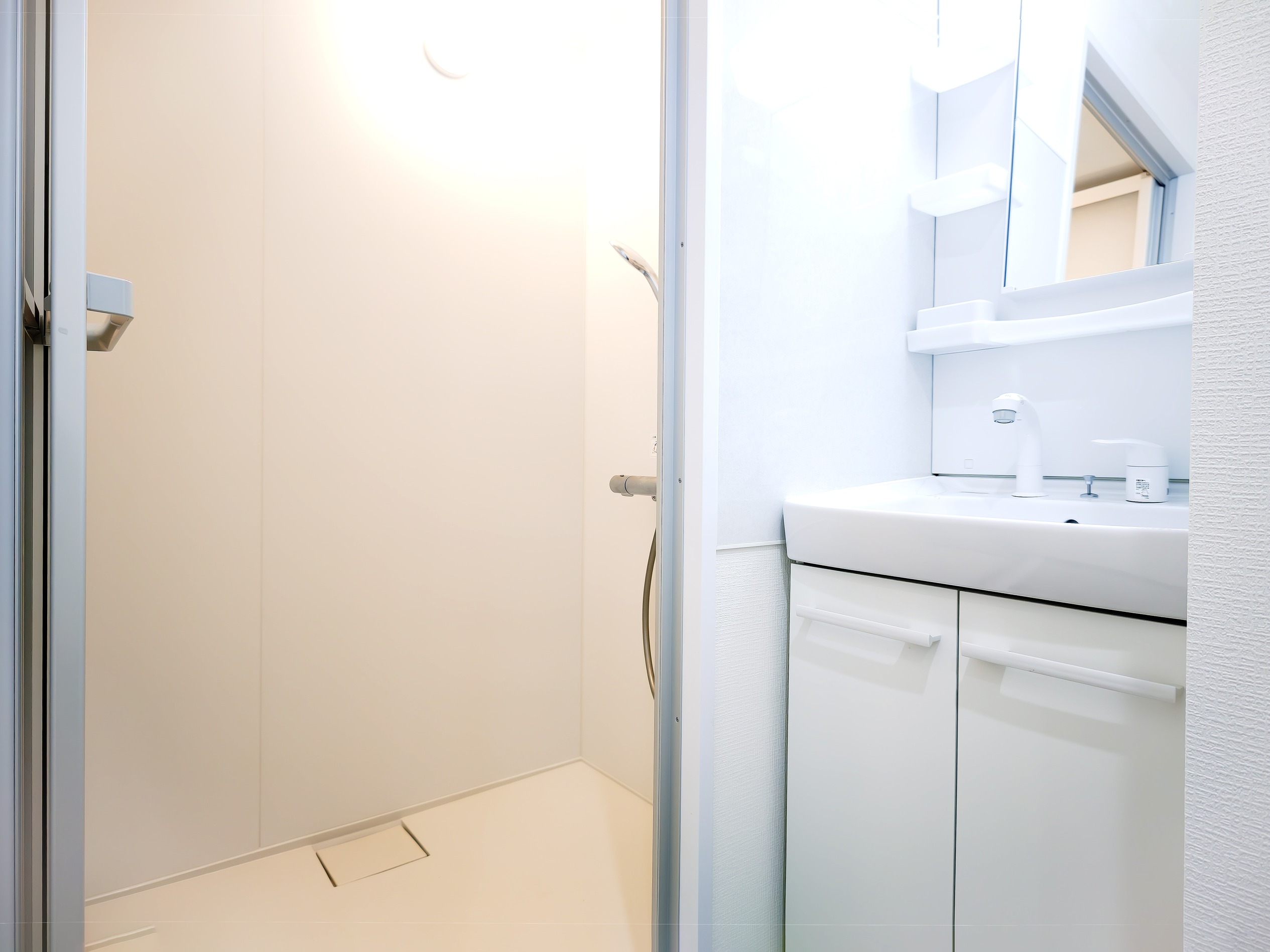 シャワー室は2室あります。どちらも洗髪用の洗面台・サーキュレーター・脱衣カゴなどを備えており、湿気がこもらず快適です。