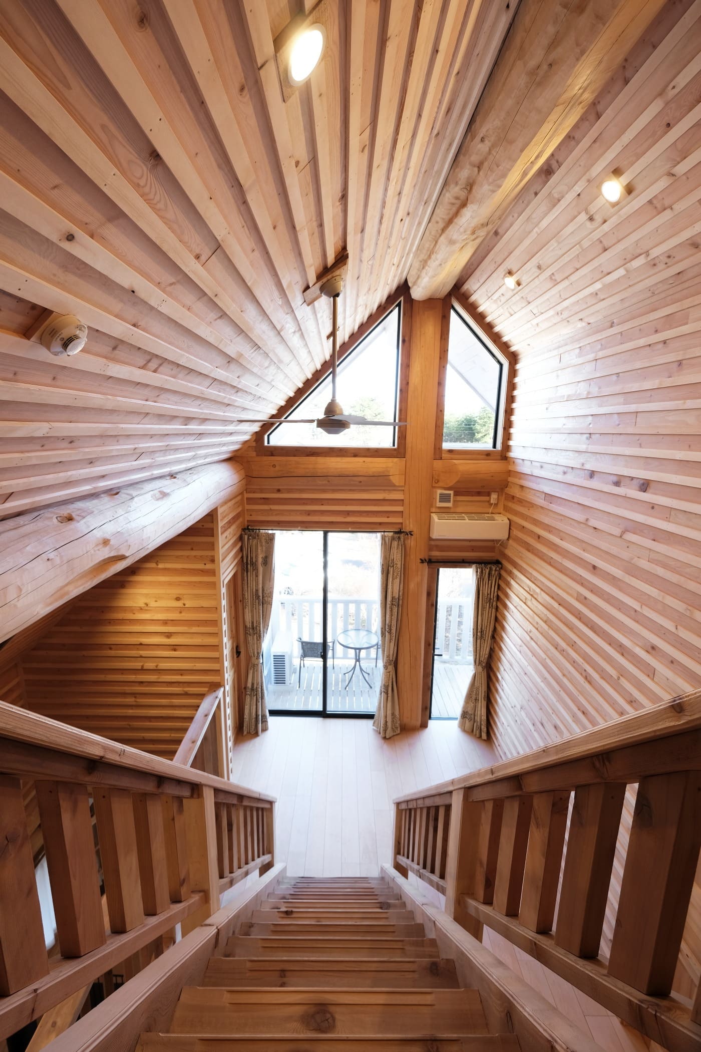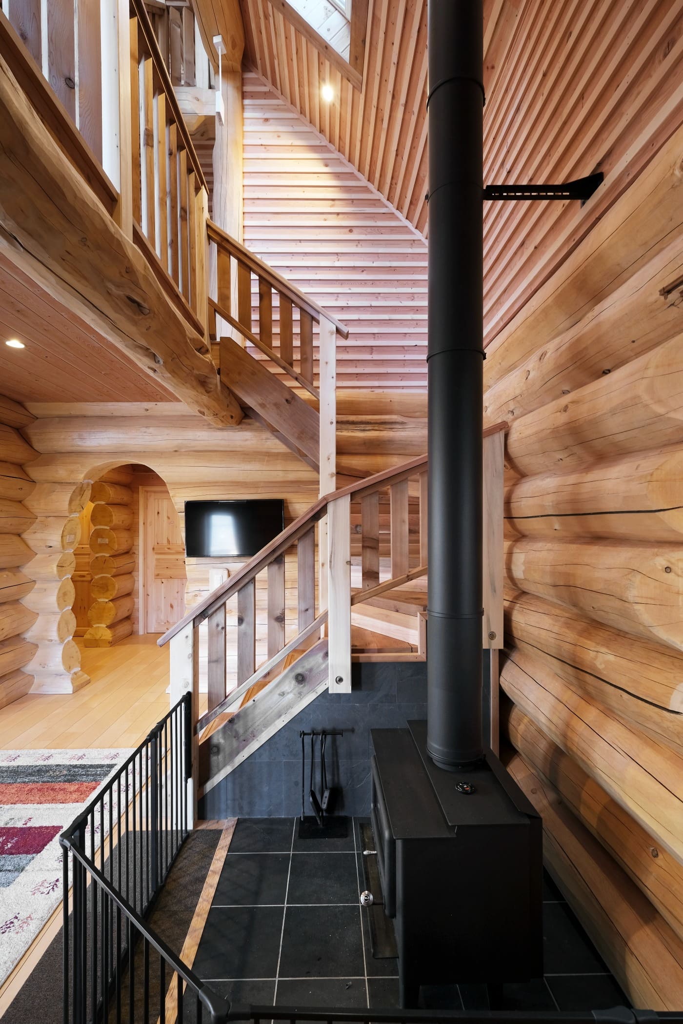 【イエローシーダー】の直径500㎜の丸太、天井や壁、階段、窓には「木の女王」【ウエスタンレッドシーダー】を使用していることなのです。