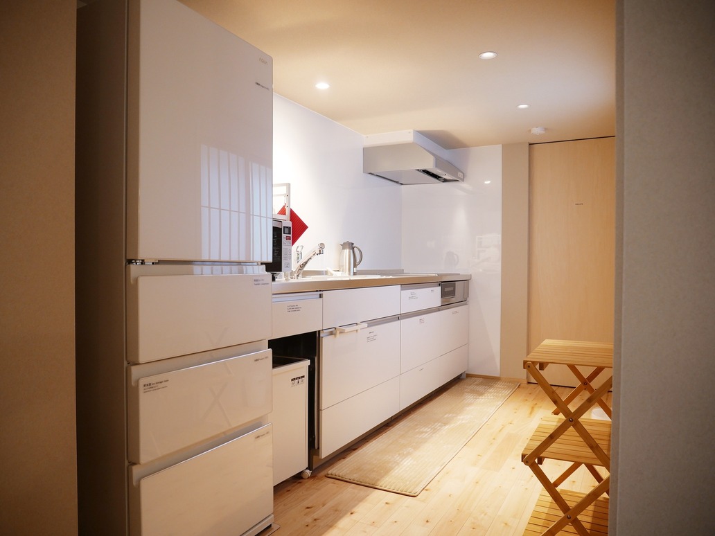 IH3 口コンロ・グリル付きのキッチン・冷凍冷蔵庫(430L)・電子レンジ・トースター・炊飯器・木製ラック(折りたたみ)・鍋・フライパン・やかん・保温ポット・まな板・包丁・キッチンバサミ・ざる・ボール・ラップ・アルミホイル・和食器・洋食器・箸・スプーン・フォーク・バターナイフ・ワインオープナー・栓抜き・おぼん(木製トレイ)・鍋敷き・鍋つかみ・急須・湯呑・茶たく・コーヒーカップ・グラス・猪口