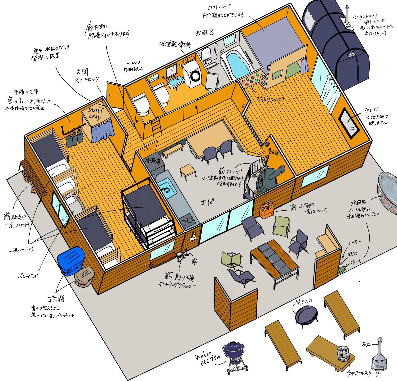 *当コテージは清掃費を基本いただいておりませんので、使用したものは洗っていただき元の場所にお戻しください。