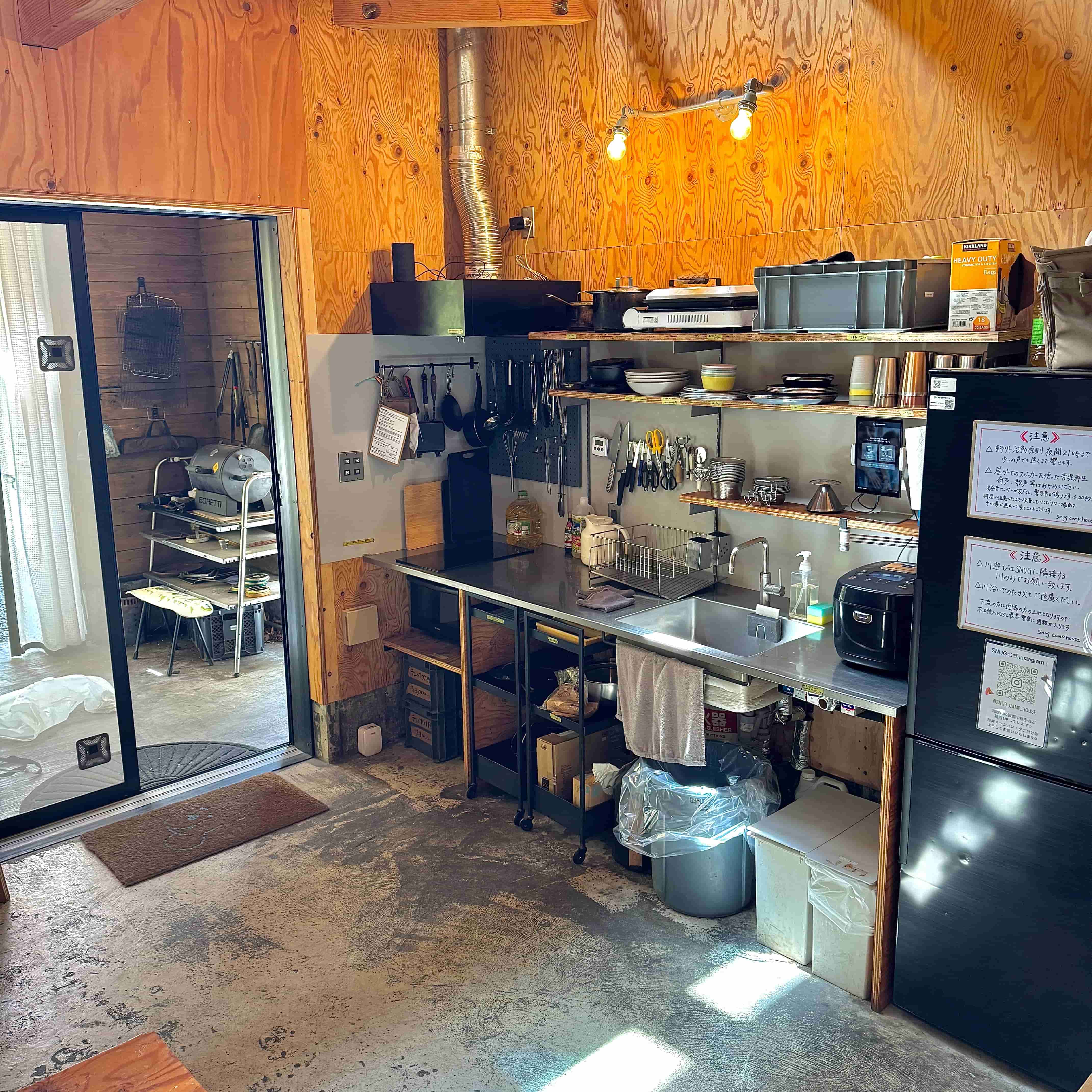 IHヒーター2口コンロ|室内キッチンシンク(給湯器あり)|キッチン用品各種|ダッチオーブン|片手鍋、鍋(直径23cm)|フライパン|カップ(少なめです)|シェラカップ