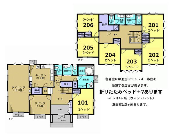 計7室15ベッド+折りたたみベッド7台となります。