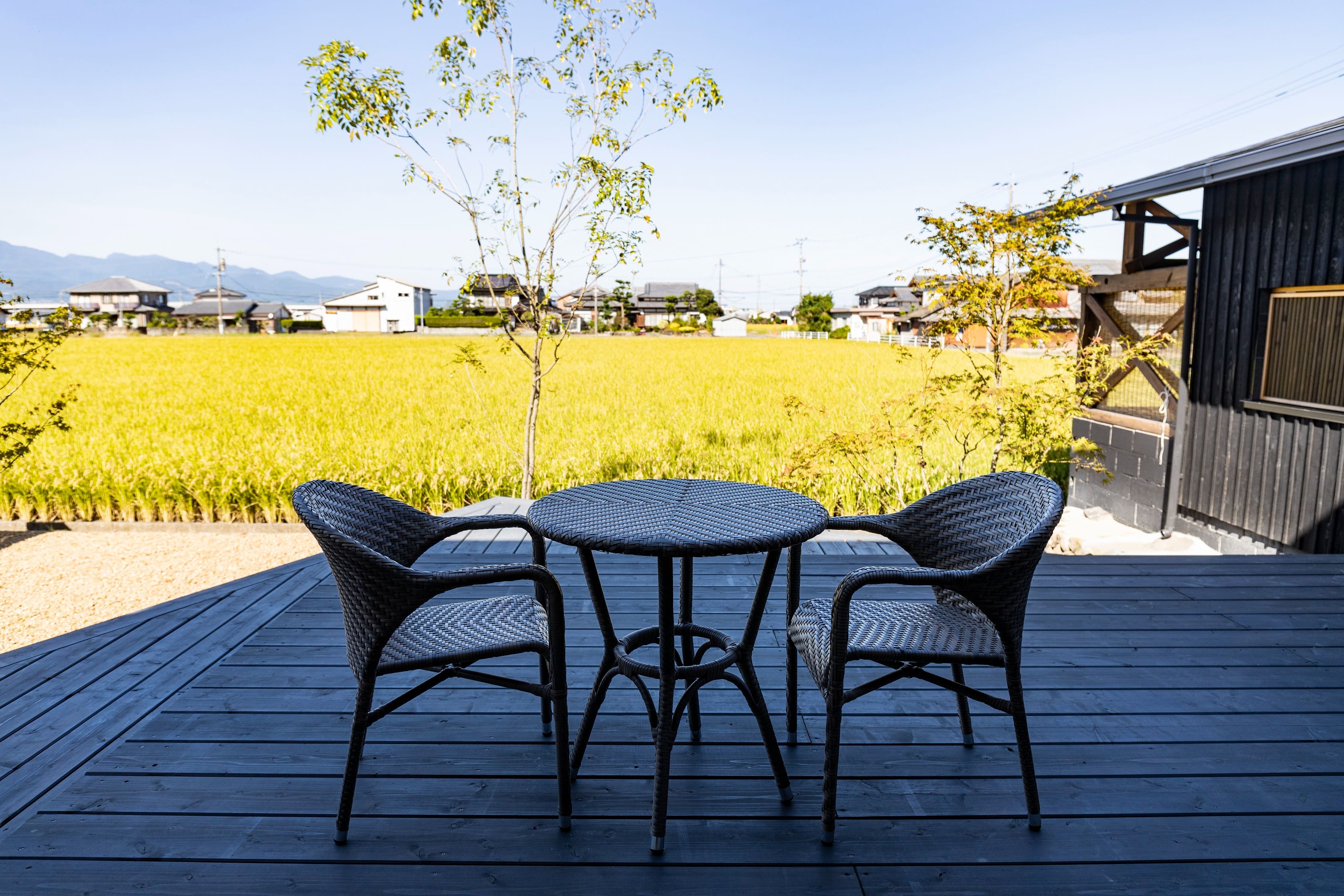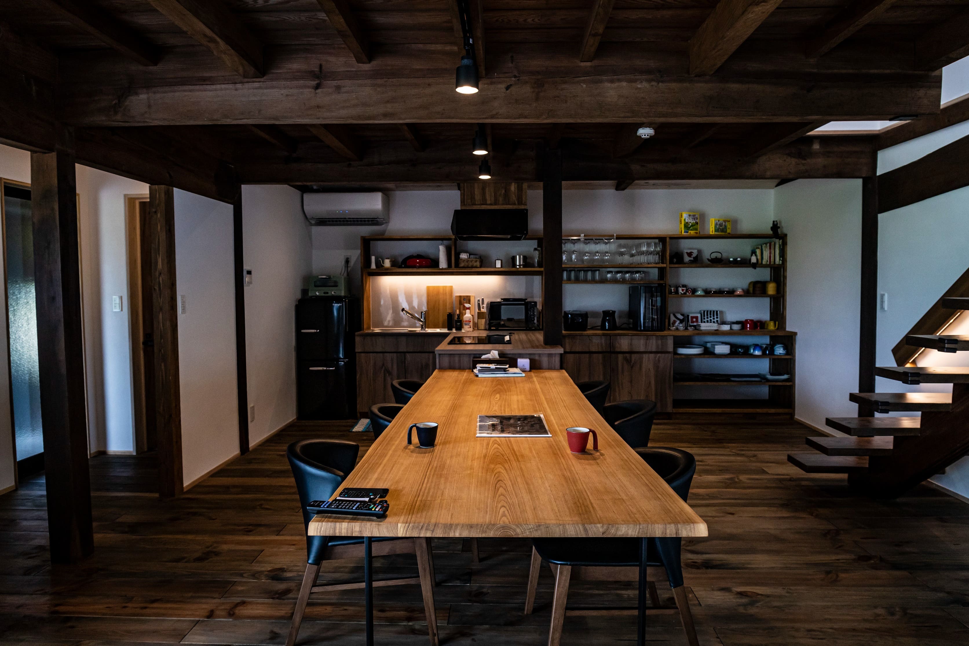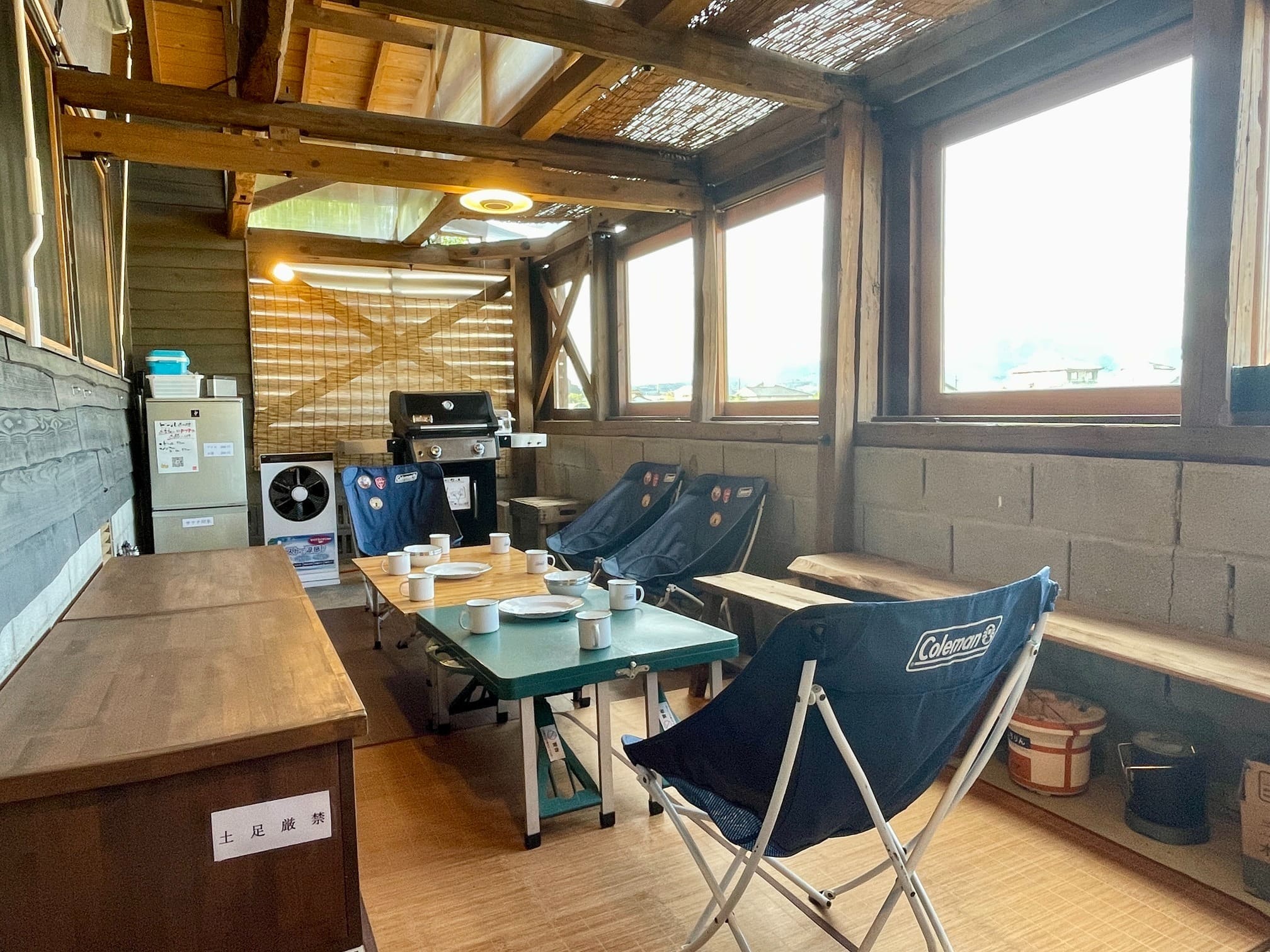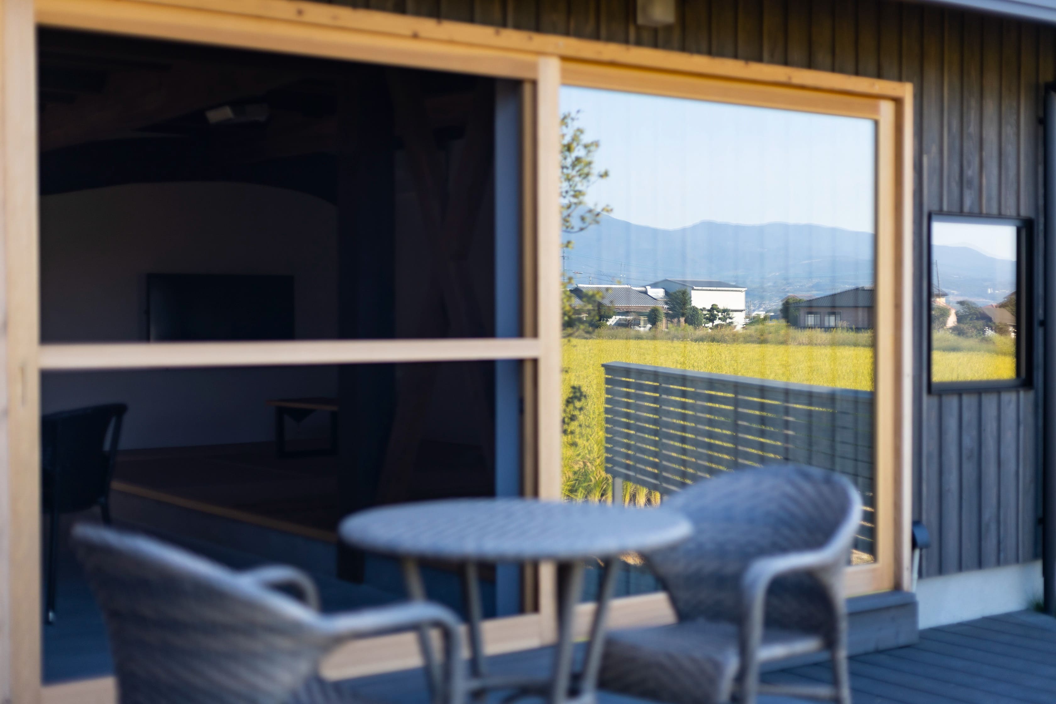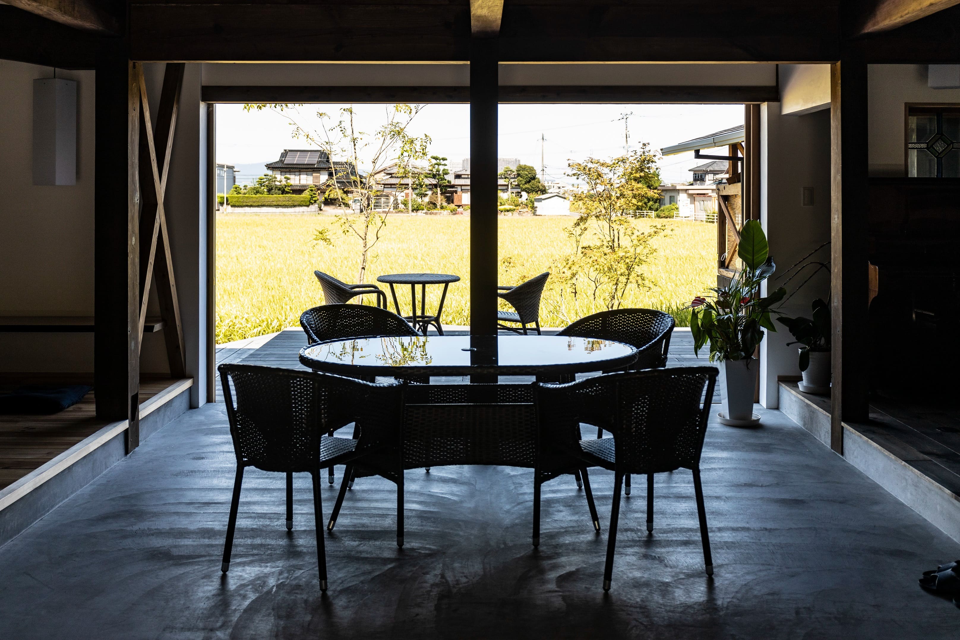 玄関から入ると土間が広がっており、右側に和室 細長い掘りごたつ式のテーブル(5人掛け)・左側にキッチン(8人利用できるテーブル) 2階が寝室 別棟に洗面所・露天風呂・BBQコーナー 1階から大きな窓がありウッドデッキが!!その先に長閑な田園風景が ウッドデッキ左隣にプライベートサウナ完備