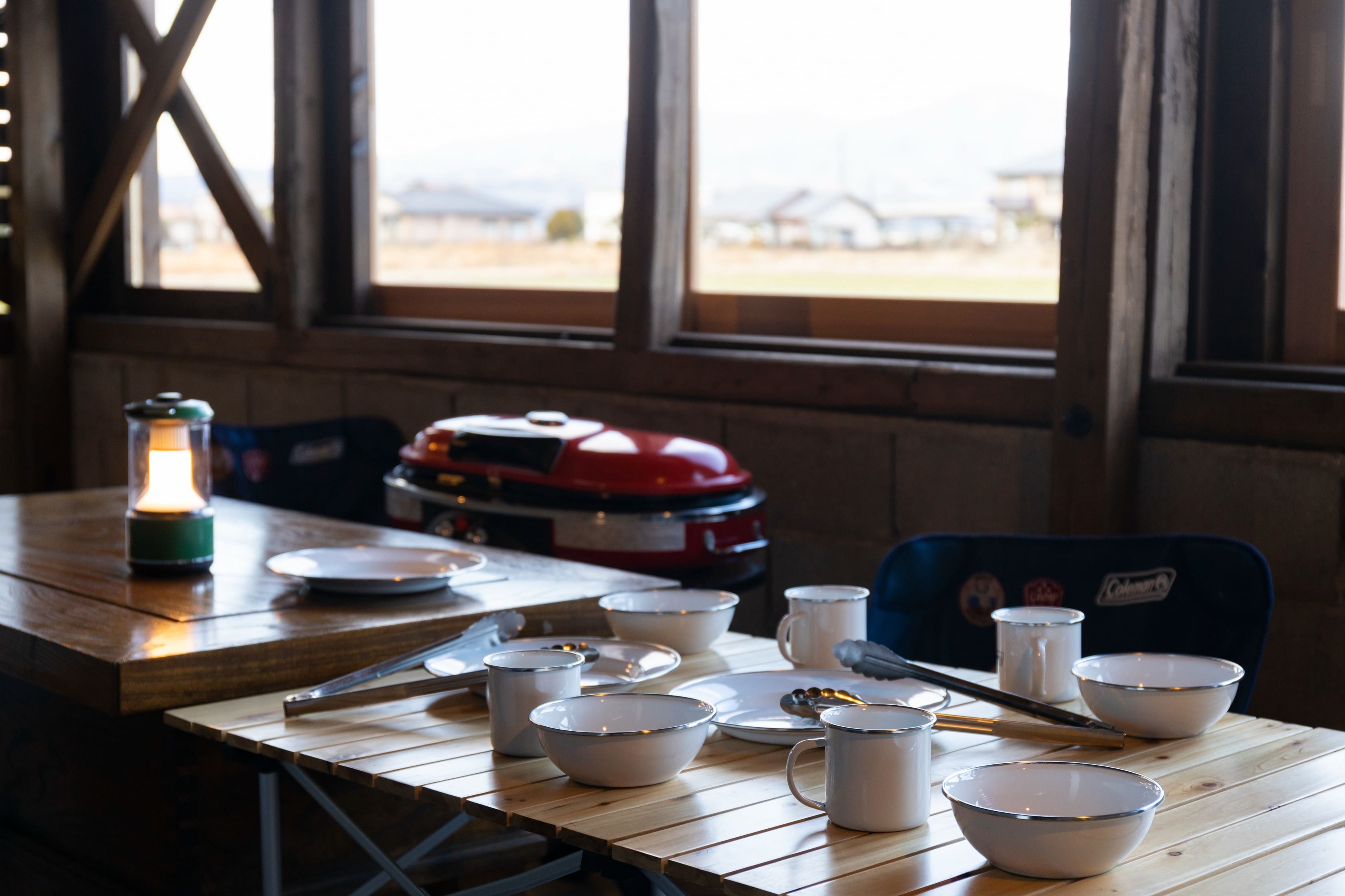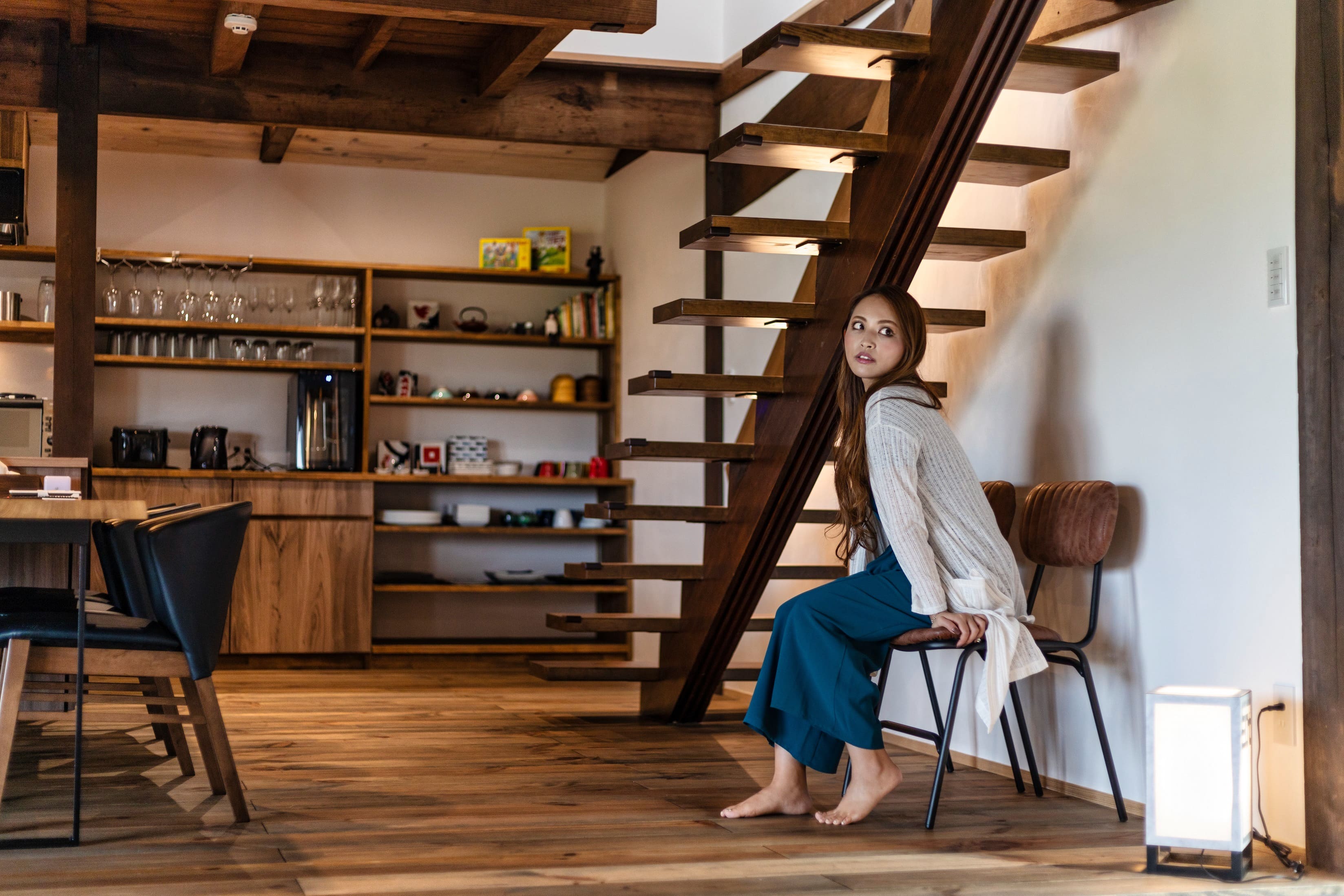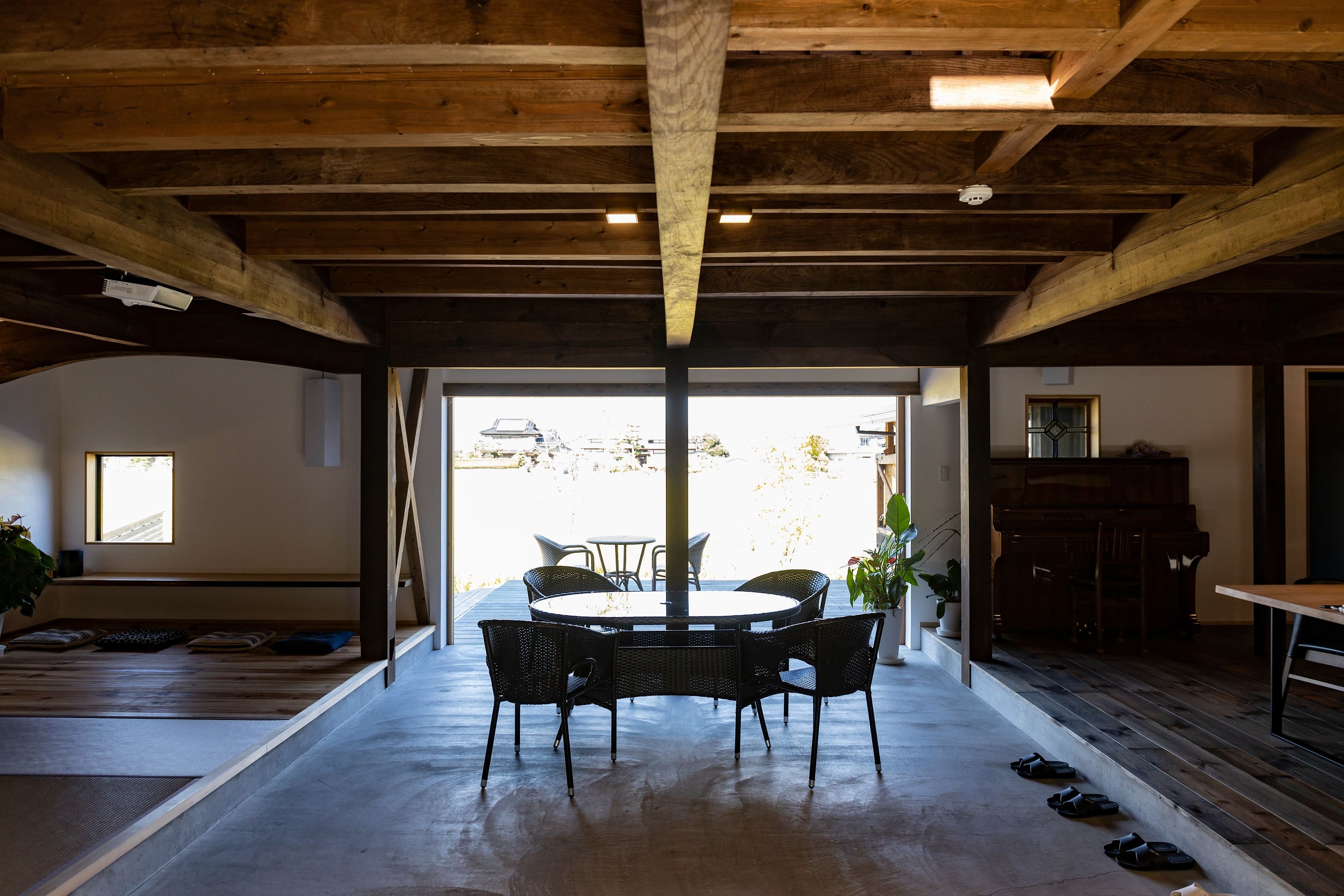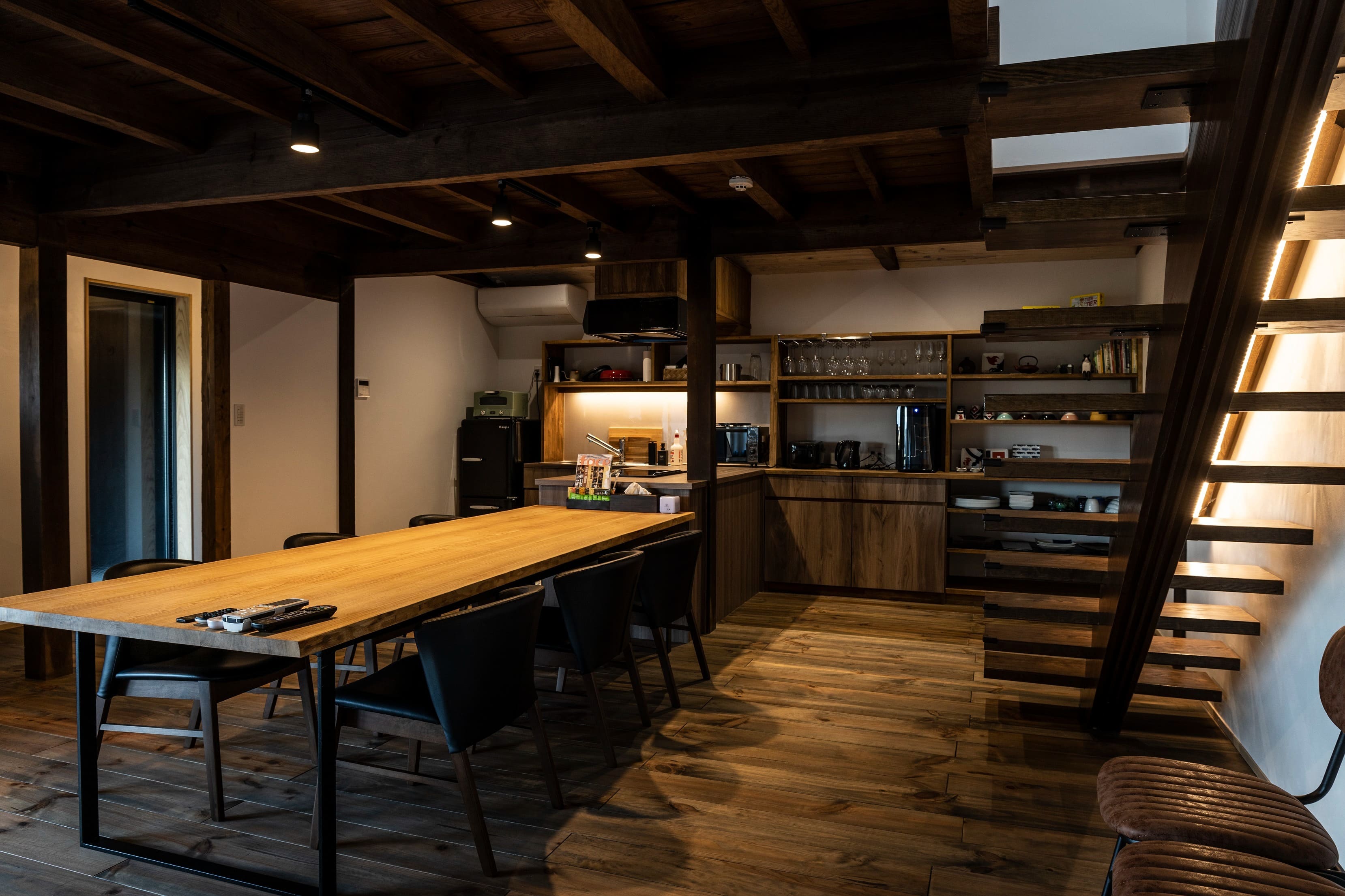 玄関から入ると土間が広がっており、右側に和室 細長い掘りごたつ式のテーブル(5人掛け)・左側にキッチン(8人利用できるテーブル) 2階が寝室 別棟に洗面所・露天風呂・BBQコーナー 1階から大きな窓がありウッドデッキが!!その先に長閑な田園風景が ウッドデッキ左隣にプライベートサウナ完備