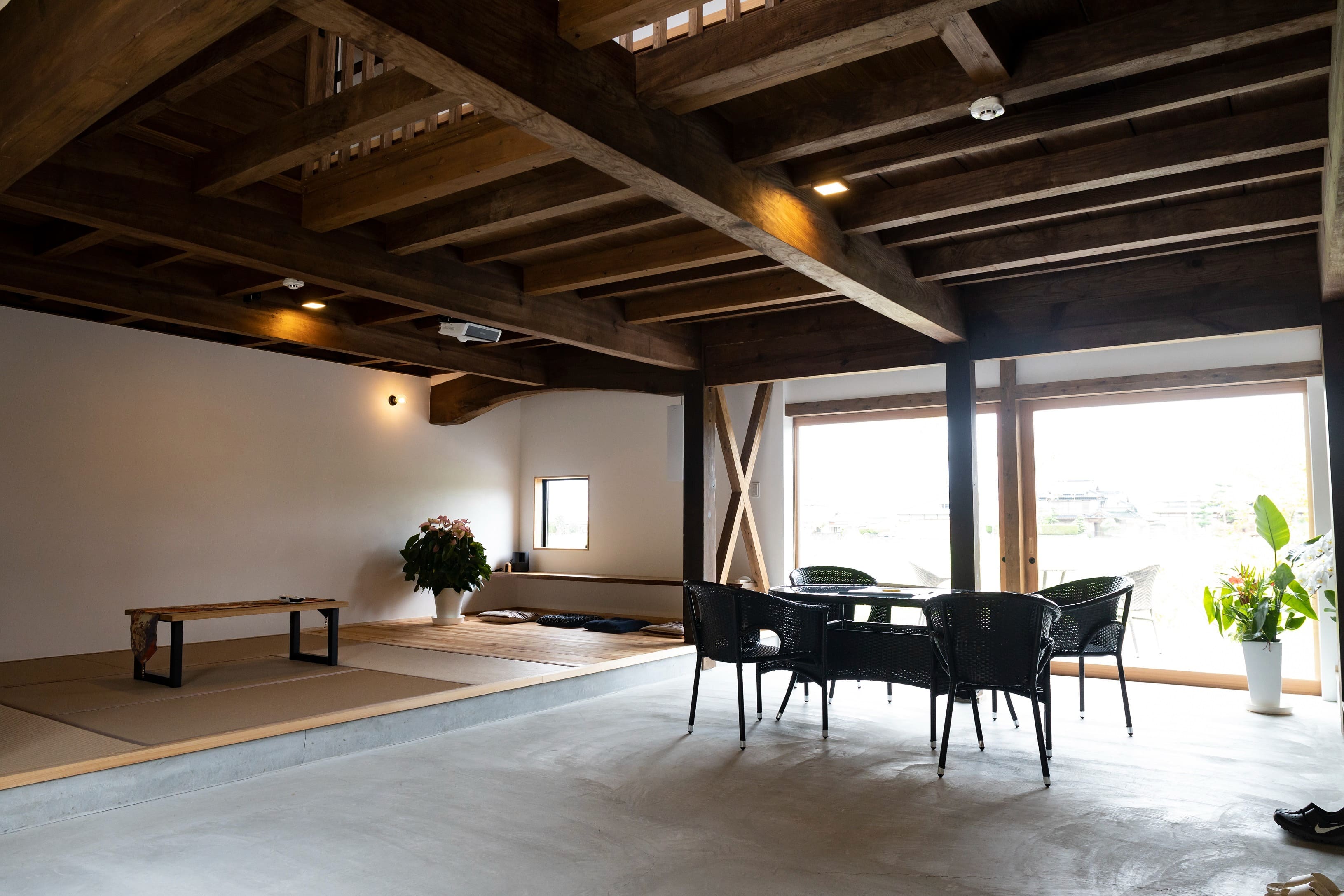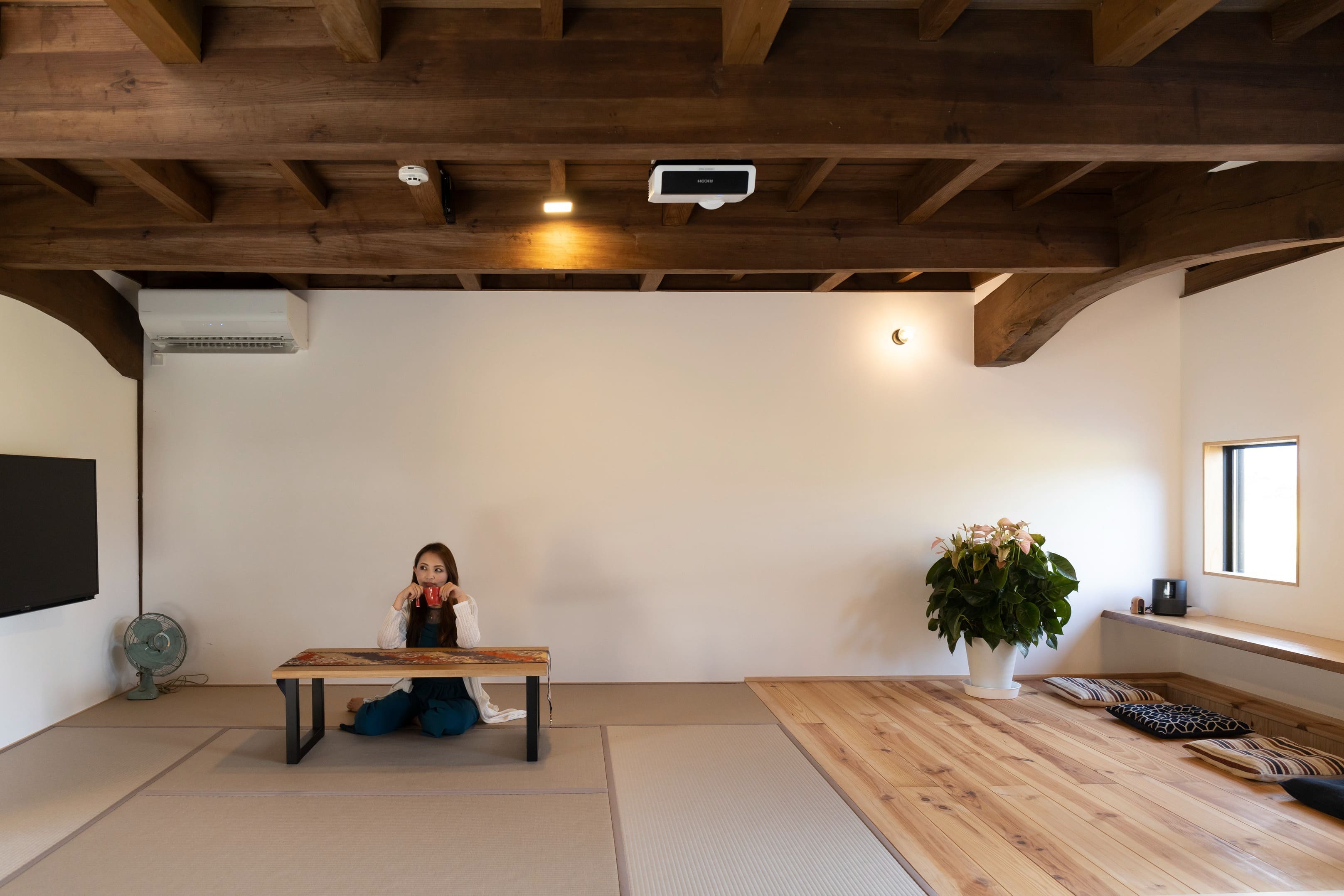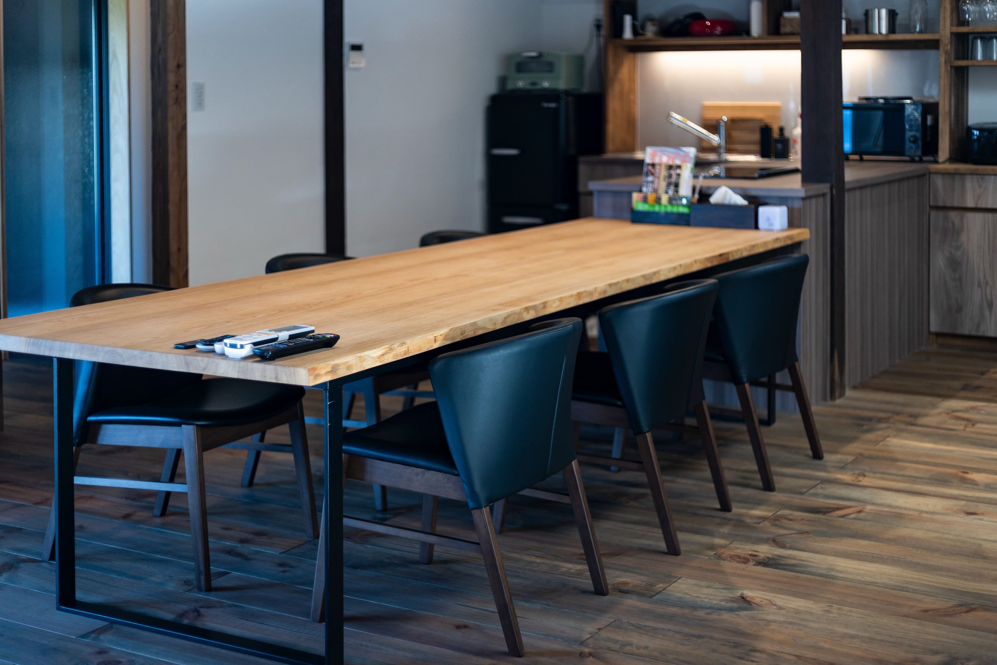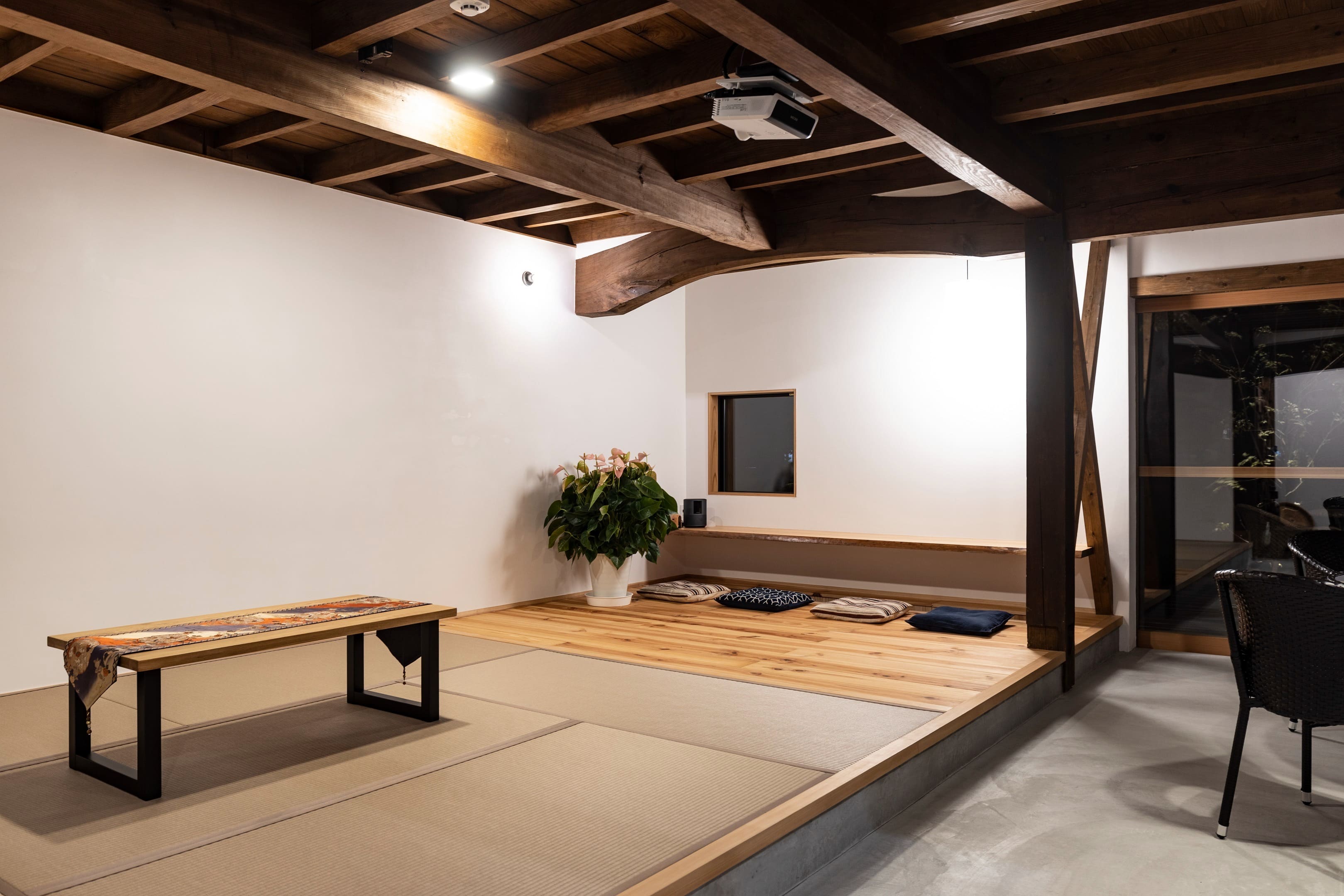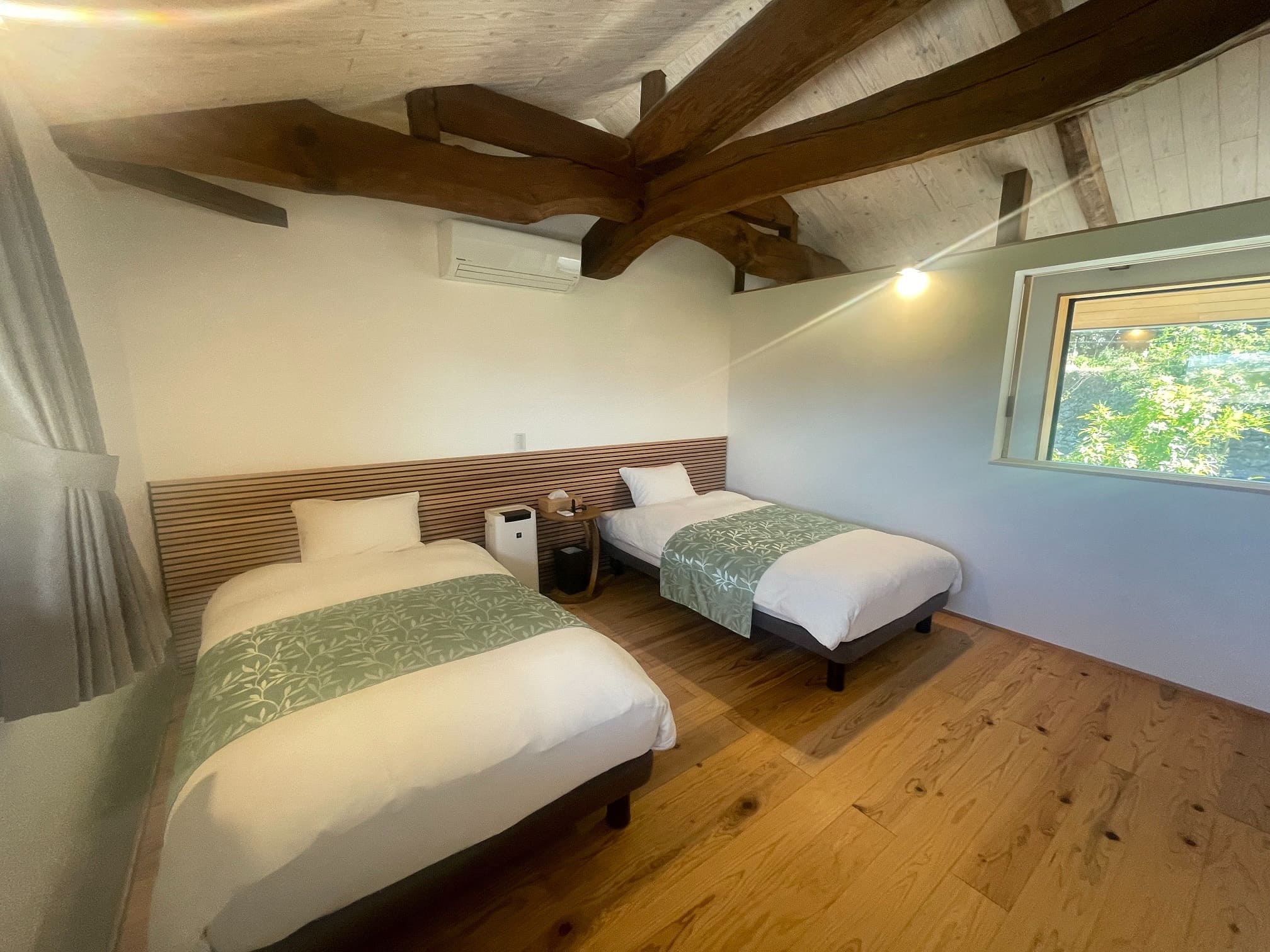 玄関から入ると土間が広がっており、右側に和室 細長い掘りごたつ式のテーブル(5人掛け)・左側にキッチン(8人利用できるテーブル) 2階が寝室 別棟に洗面所・露天風呂・BBQコーナー 1階から大きな窓がありウッドデッキが!!その先に長閑な田園風景が ウッドデッキ左隣にプライベートサウナ完備