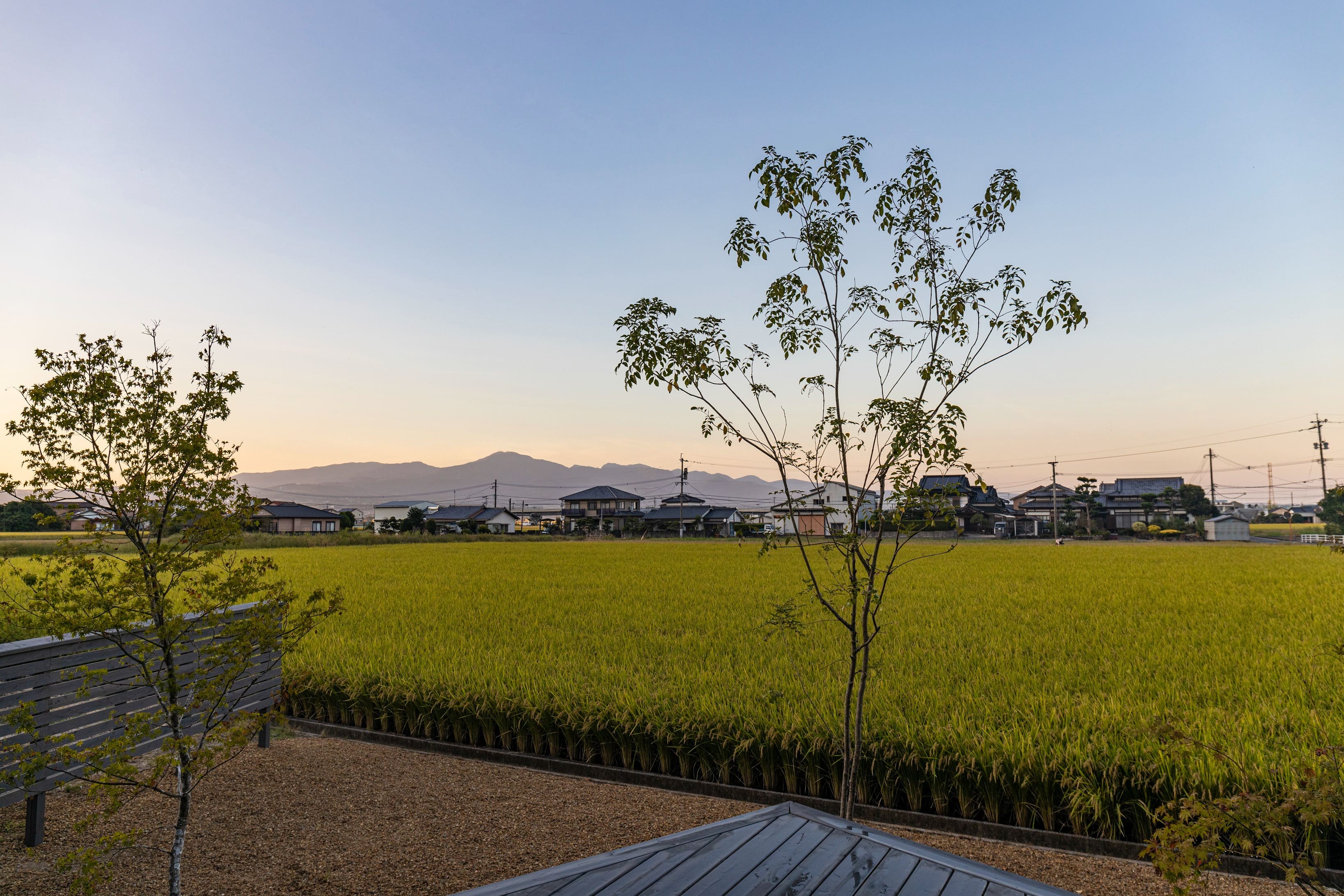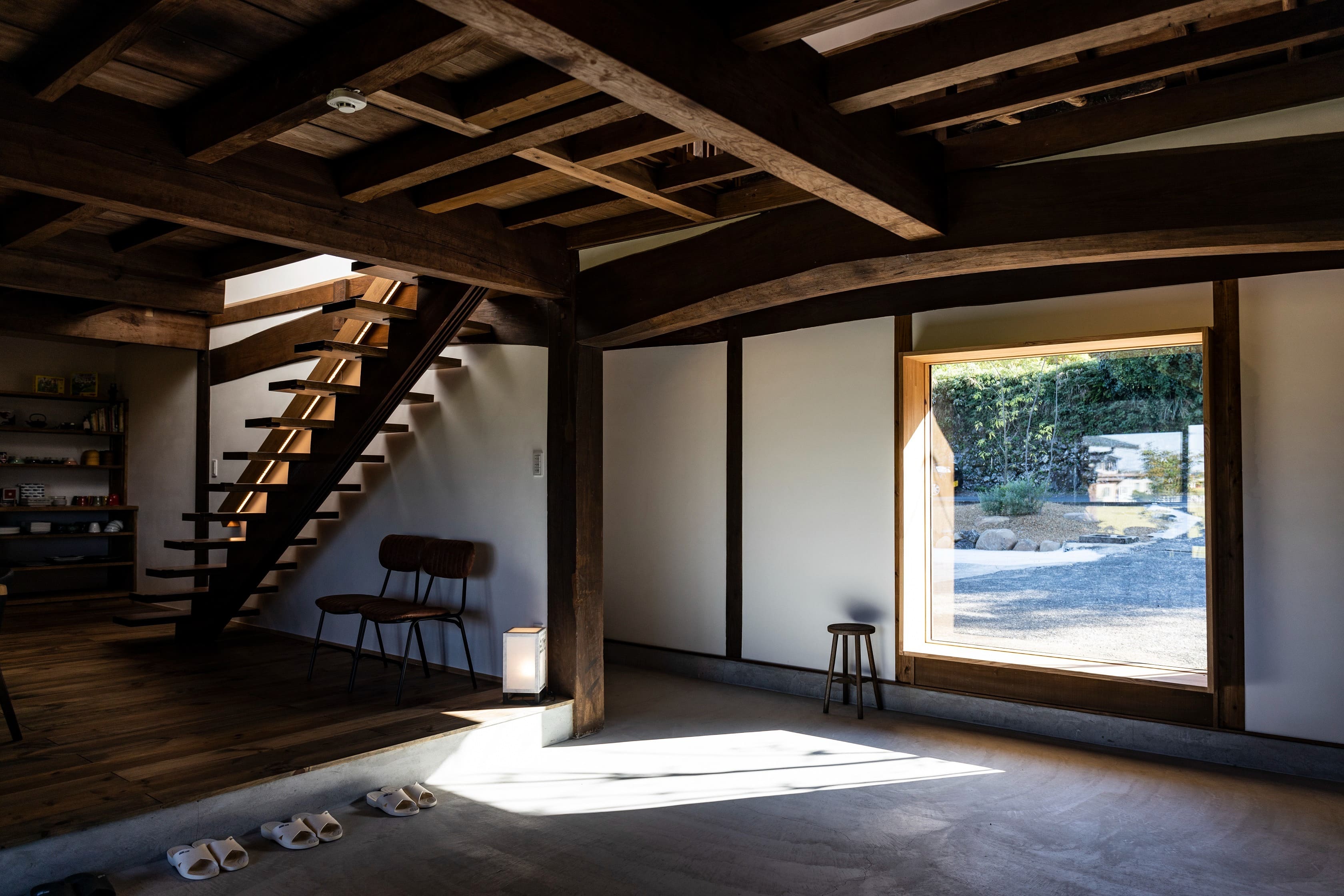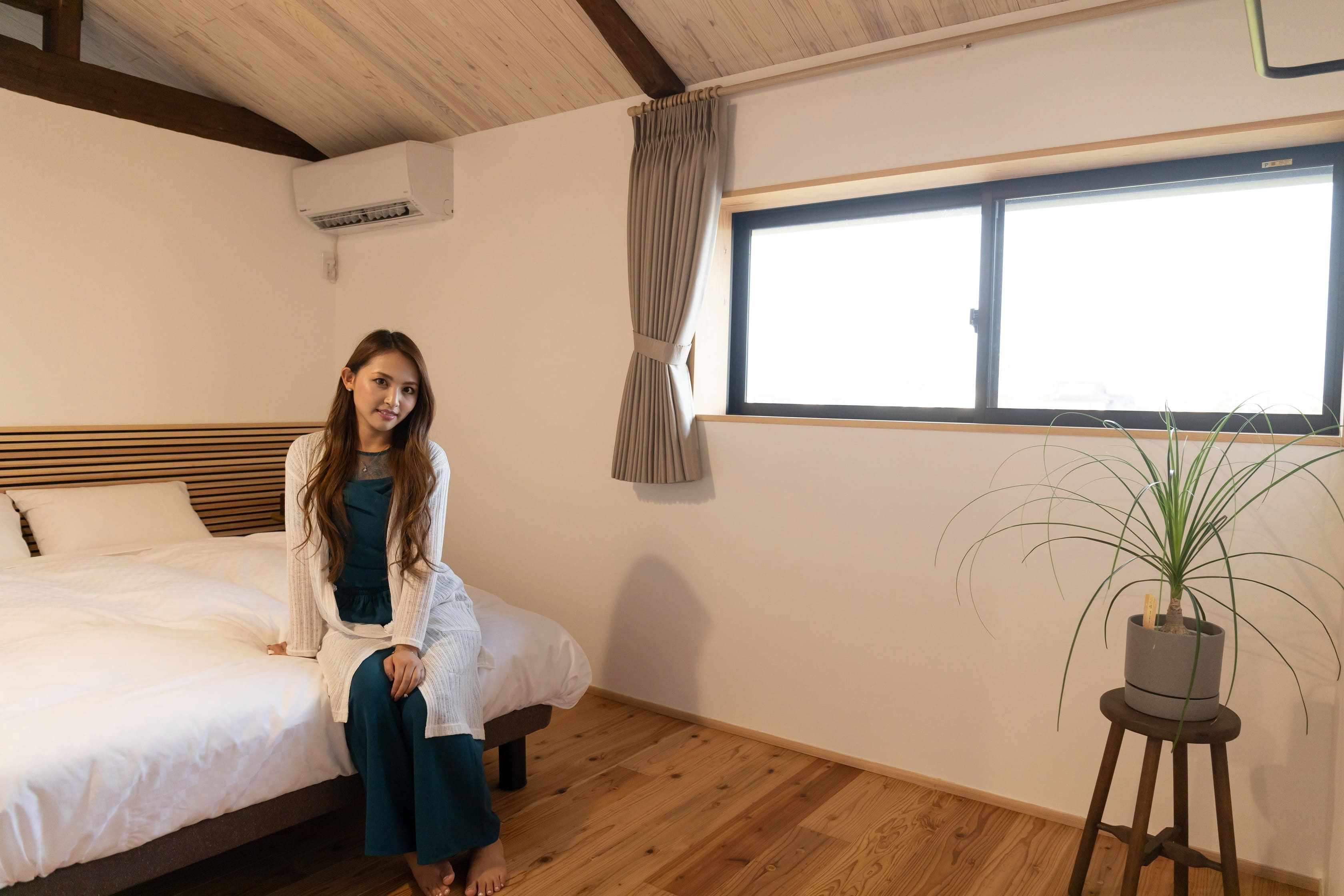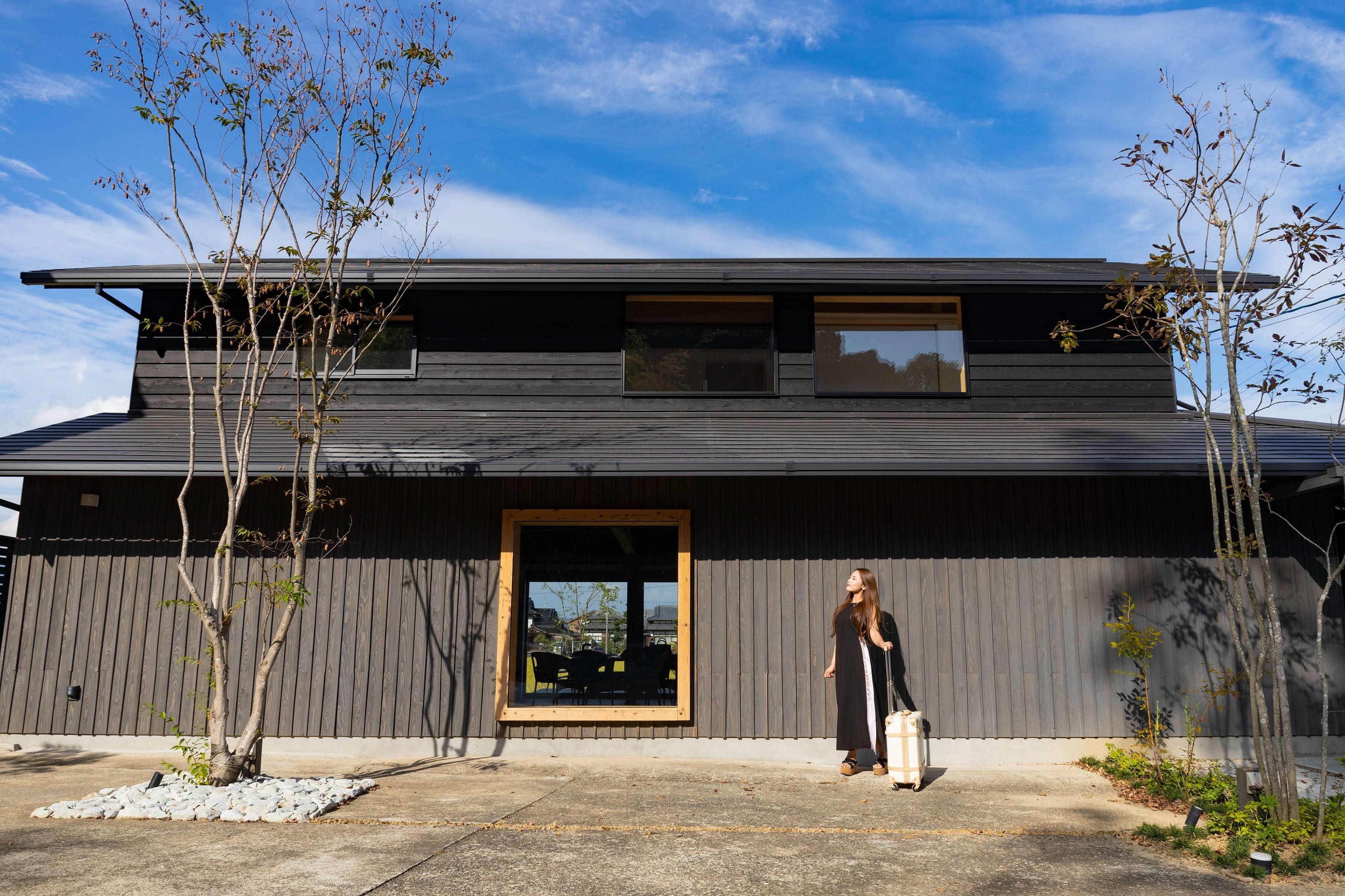 玄関から入ると土間が広がっており、右側に和室 細長い掘りごたつ式のテーブル(5人掛け)・左側にキッチン(8人利用できるテーブル) 2階が寝室 別棟に洗面所・露天風呂・BBQコーナー 1階から大きな窓がありウッドデッキが!!その先に長閑な田園風景が ウッドデッキ左隣にプライベートサウナ完備
