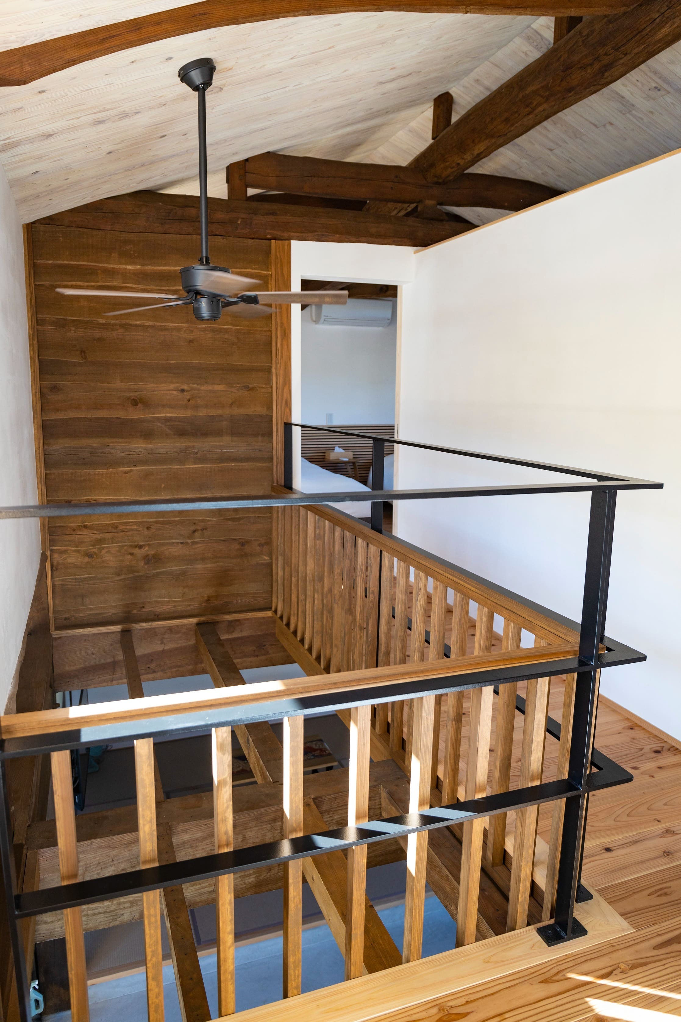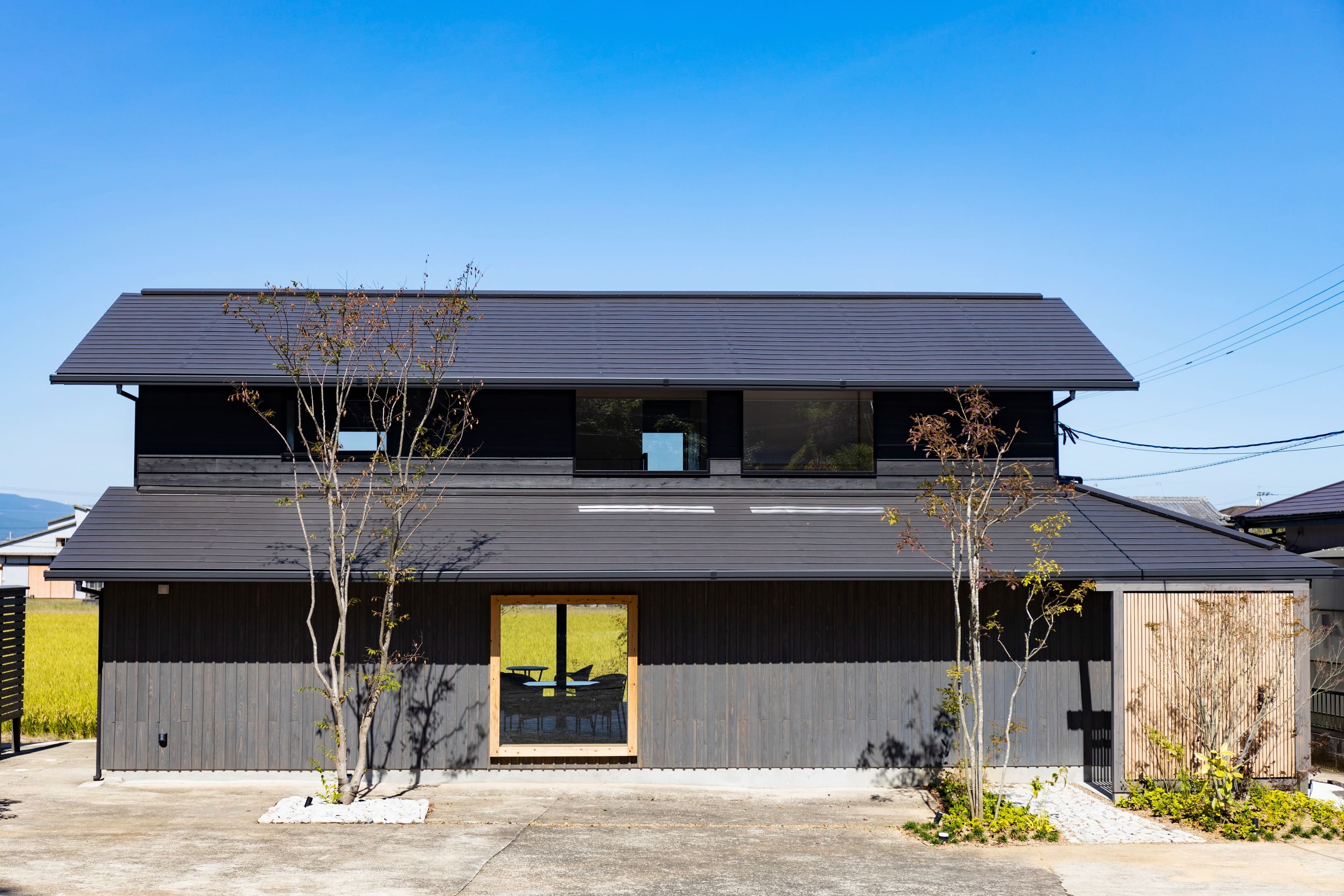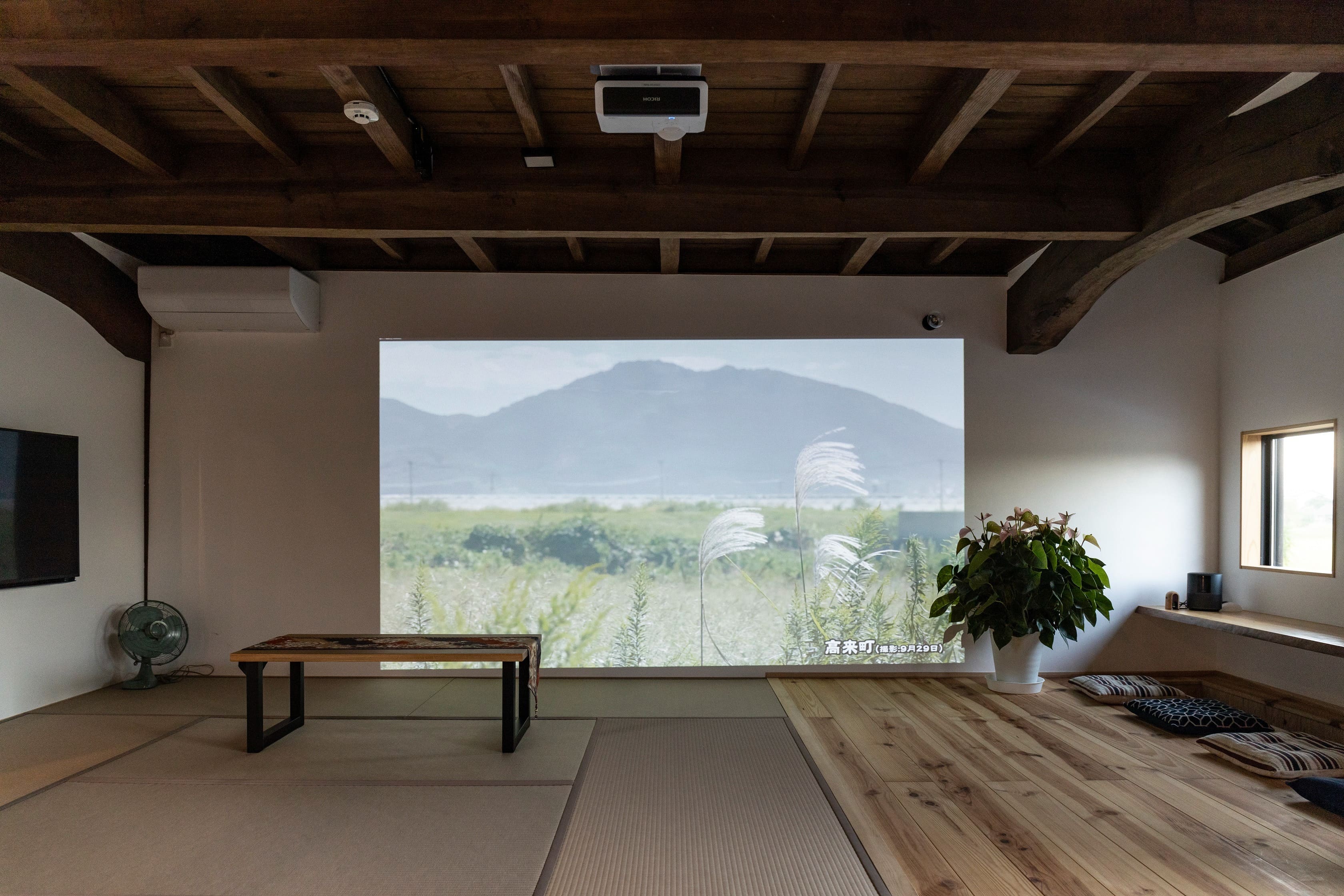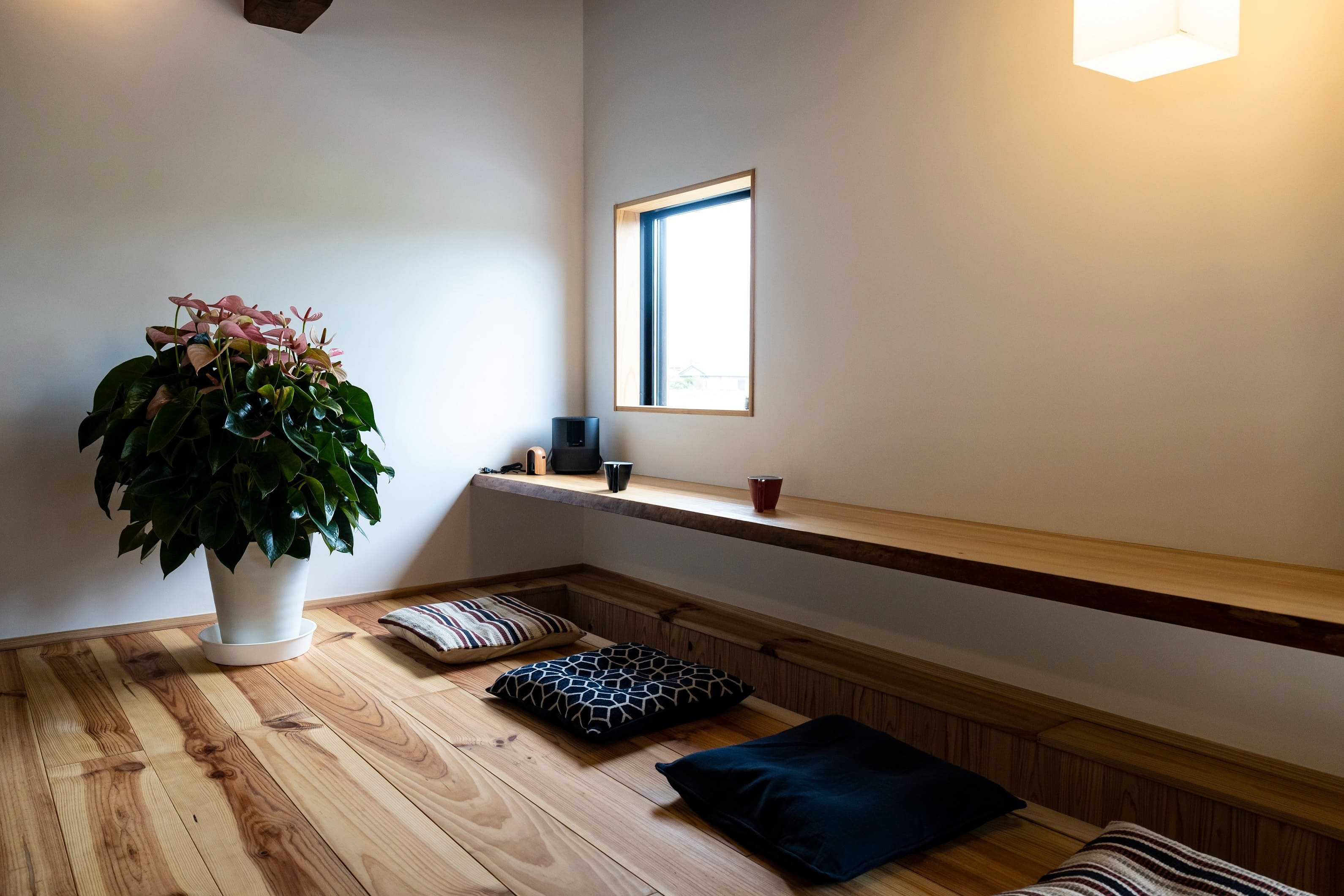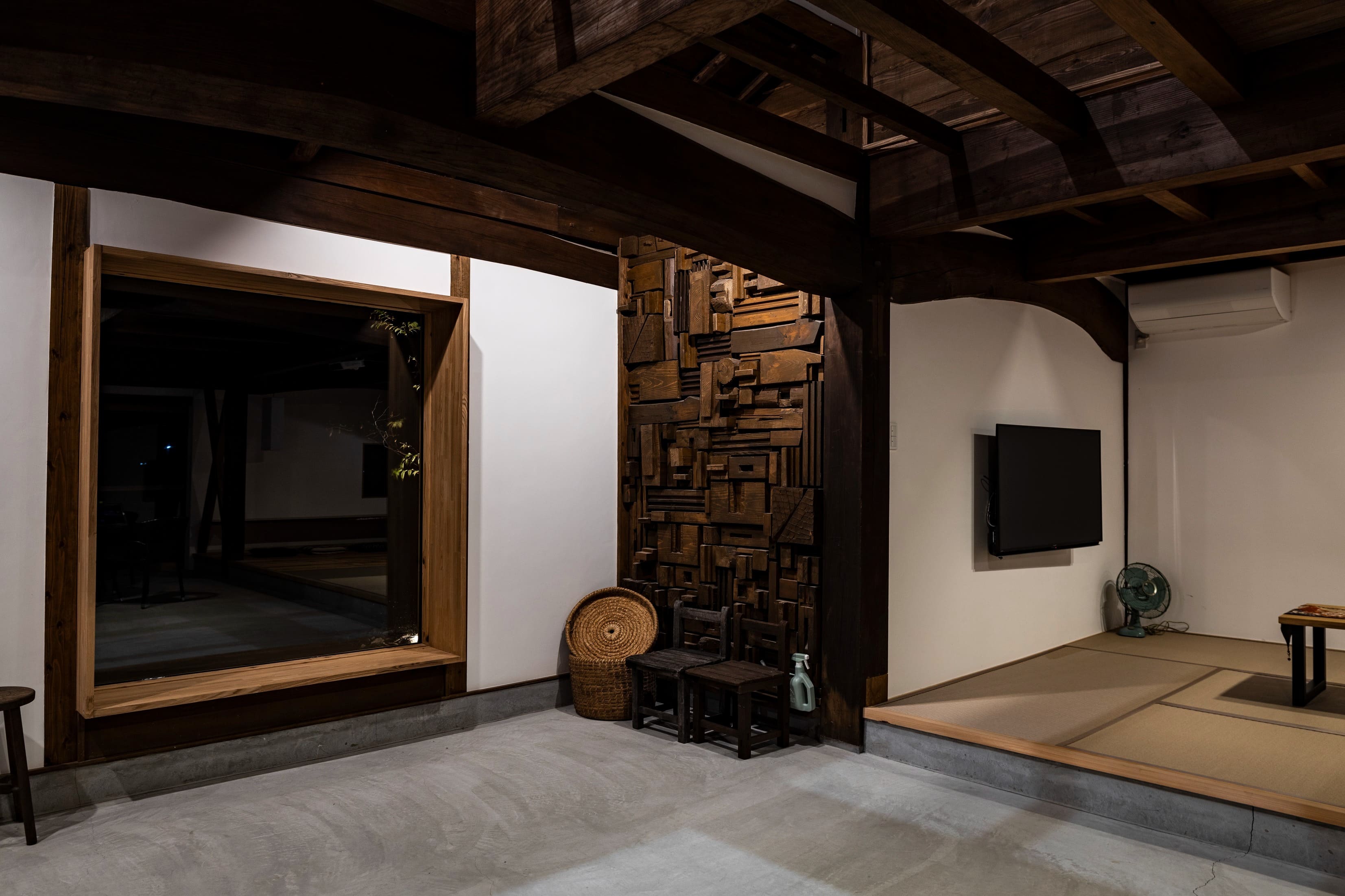 玄関から入ると土間が広がっており、右側に和室 細長い掘りごたつ式のテーブル(5人掛け)・左側にキッチン(8人利用できるテーブル) 2階が寝室 別棟に洗面所・露天風呂・BBQコーナー 1階から大きな窓がありウッドデッキが!!その先に長閑な田園風景が ウッドデッキ左隣にプライベートサウナ完備