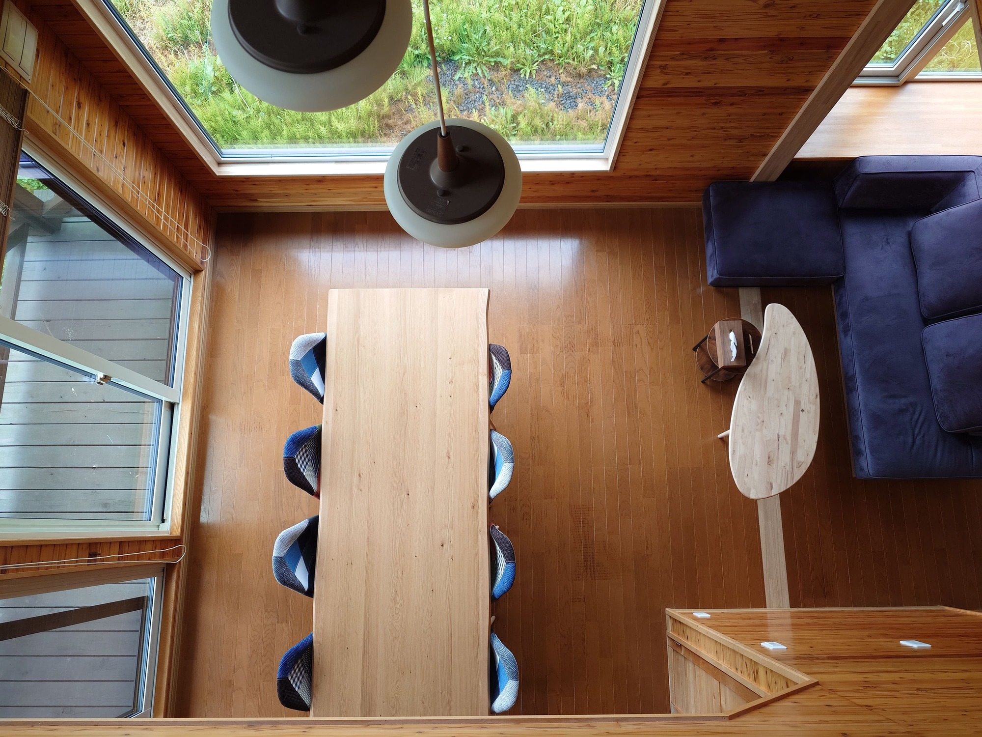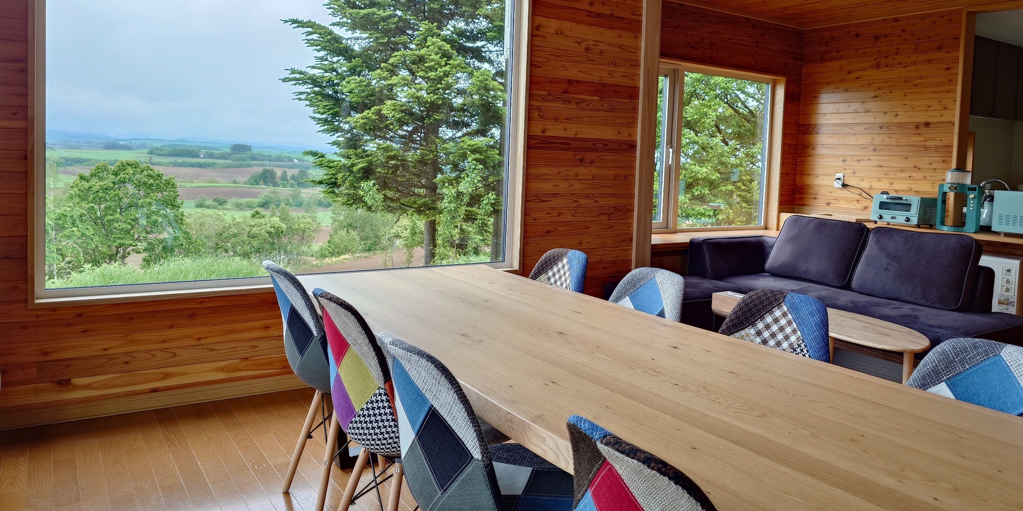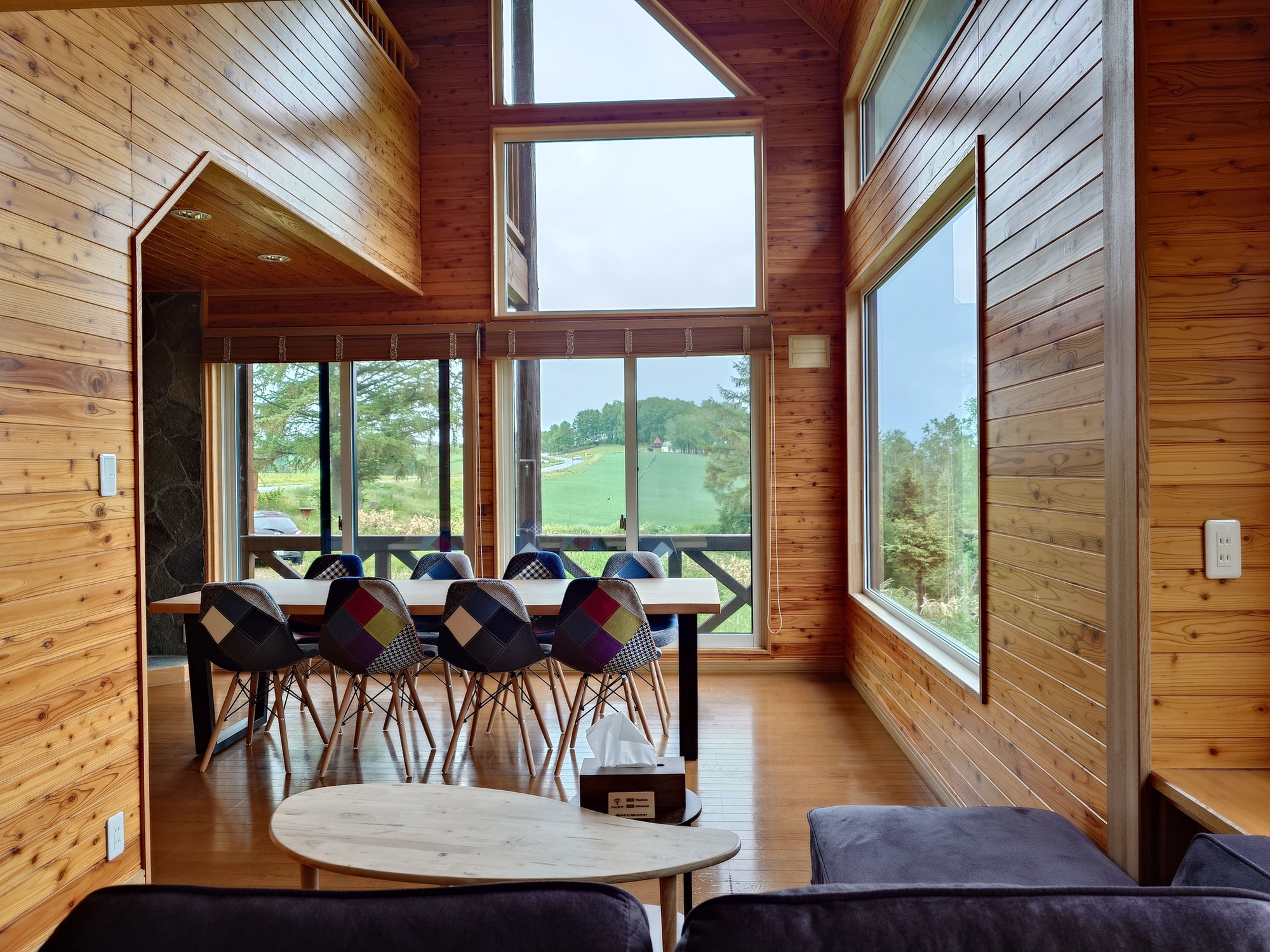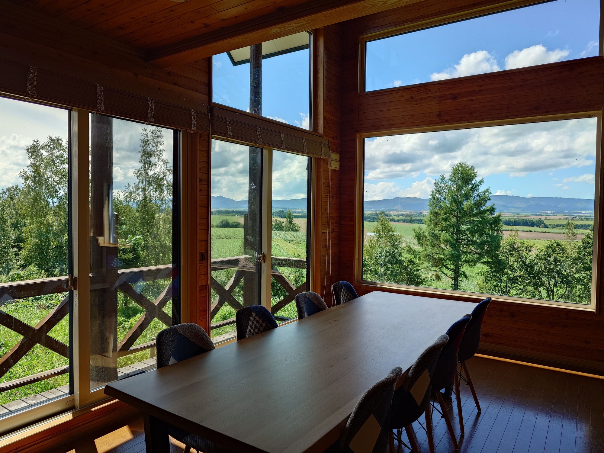 吹き抜けのダイニング。大きな窓から、美瑛の絶景が広がります。