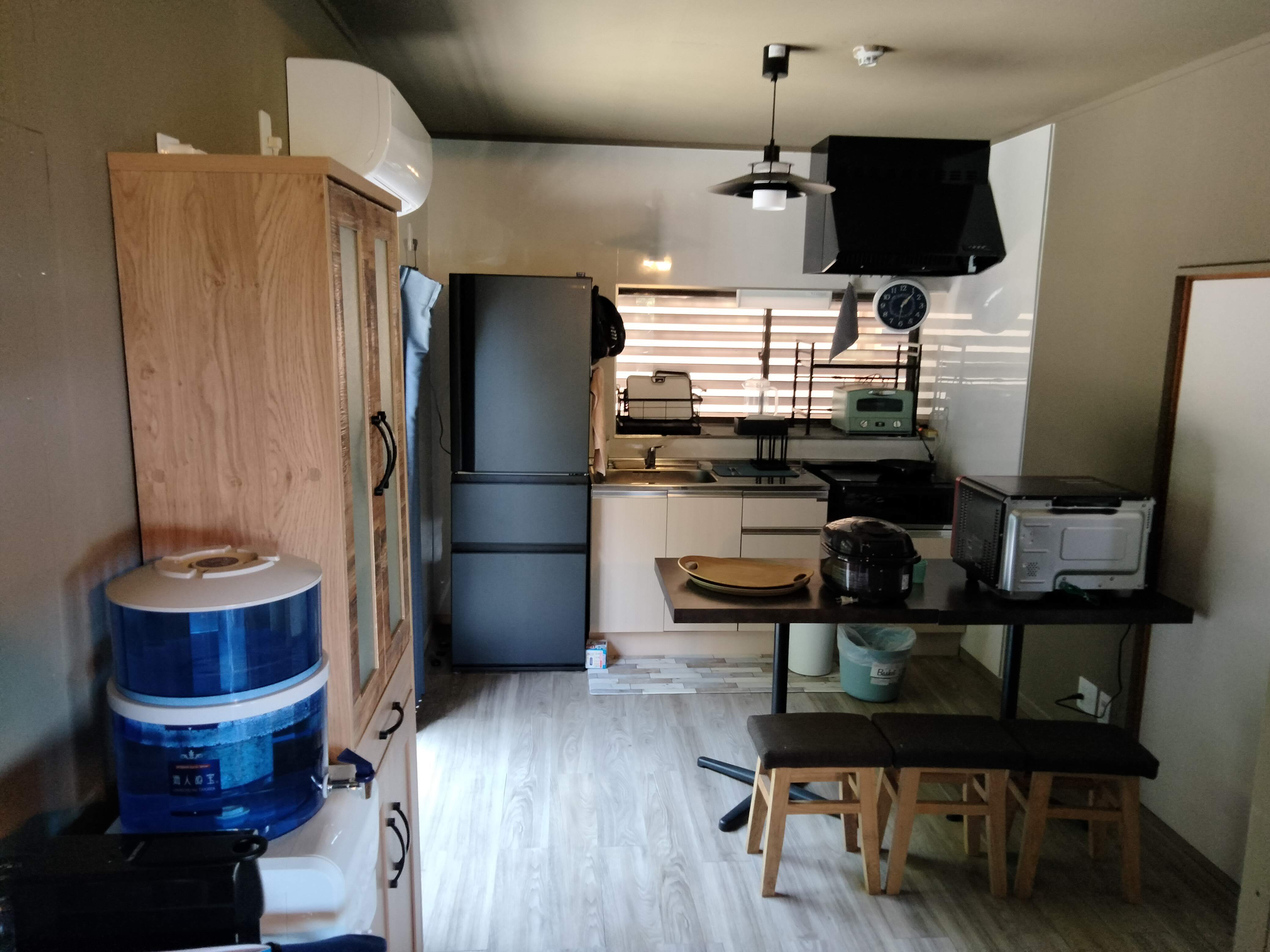 IHクッキングヒーター、鍋、炊飯器、トースター、電子レンジ、各種食器がそろっています。