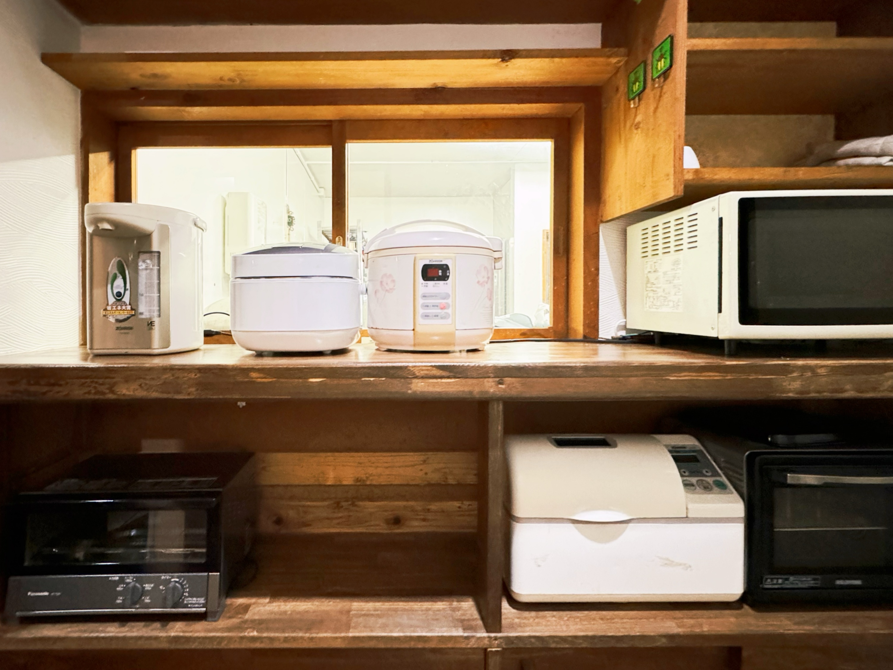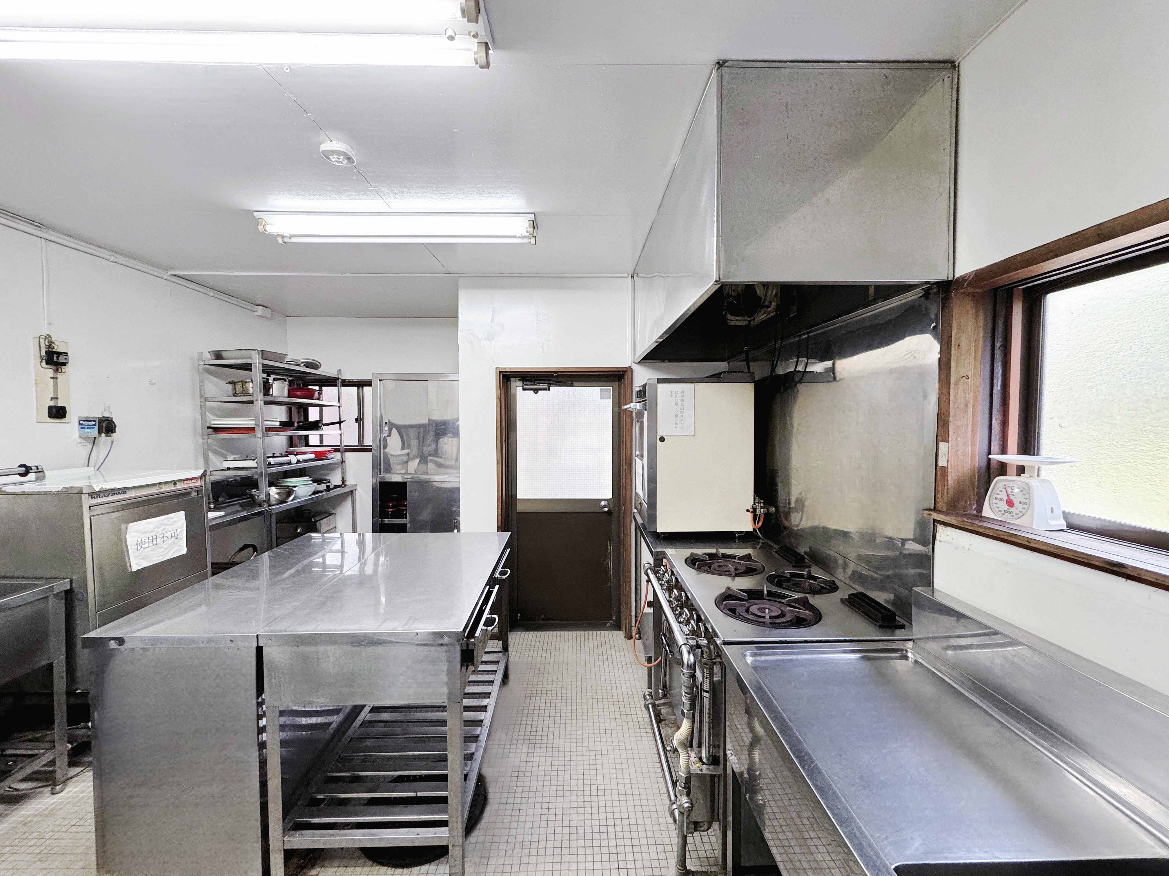 力セットコン口x2・業務用ガスコン口x3・冷蔵庫282L、冷凍庫100L・電子オープンレンジ・炊飯器(8合、5合)・電気湯沸かしポット・トースター×2