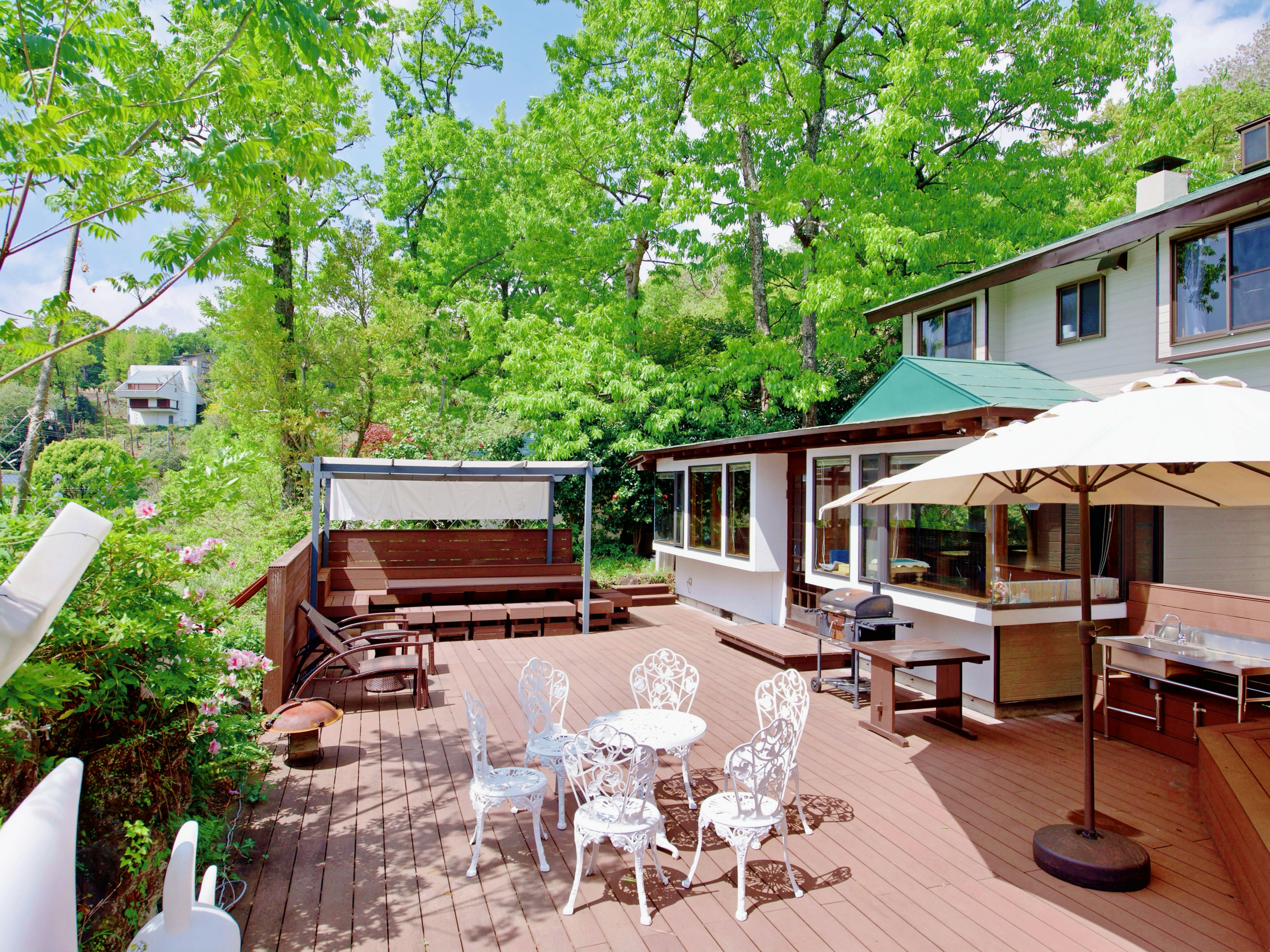 広いデッキガーデンには大人数が入れる、パラソル、ゆったりとしたガーデンソファやBBQセット、焚き火も揃っています。
