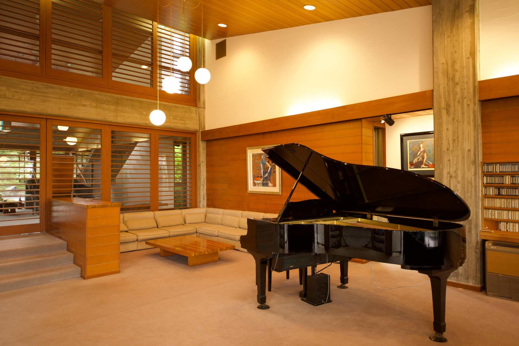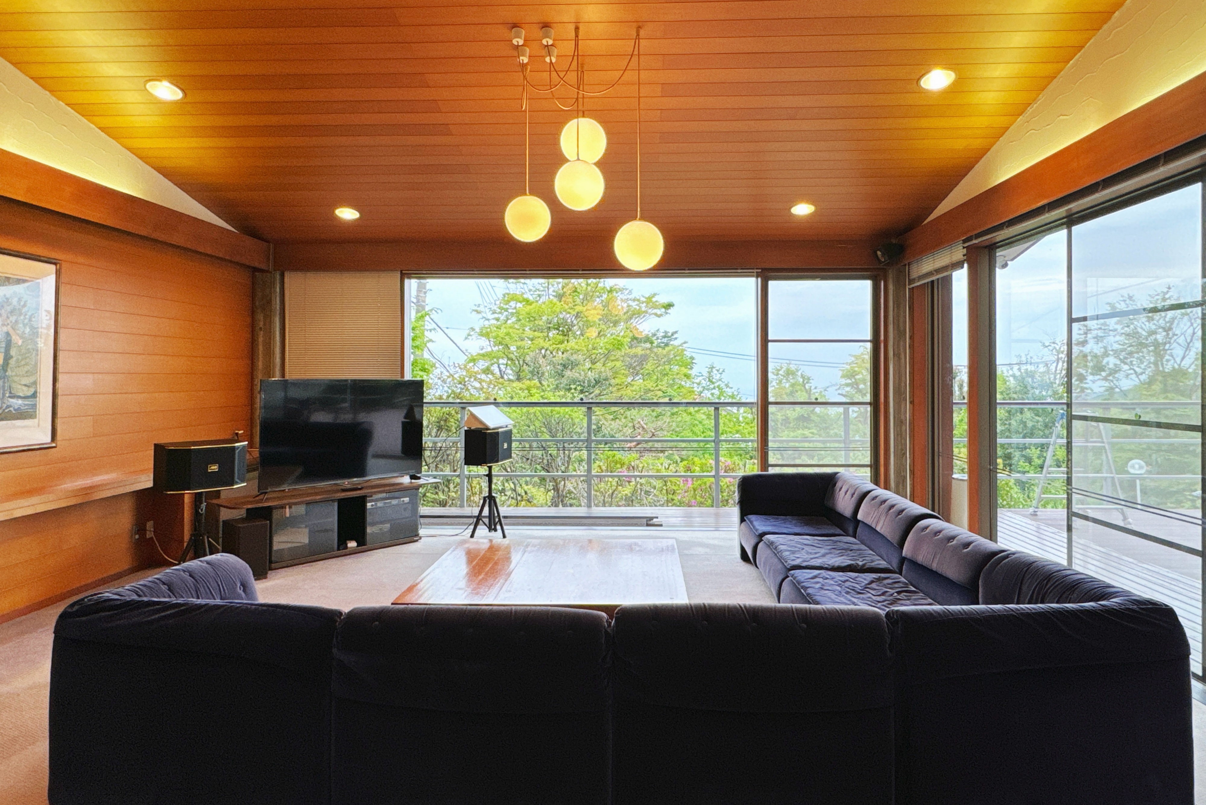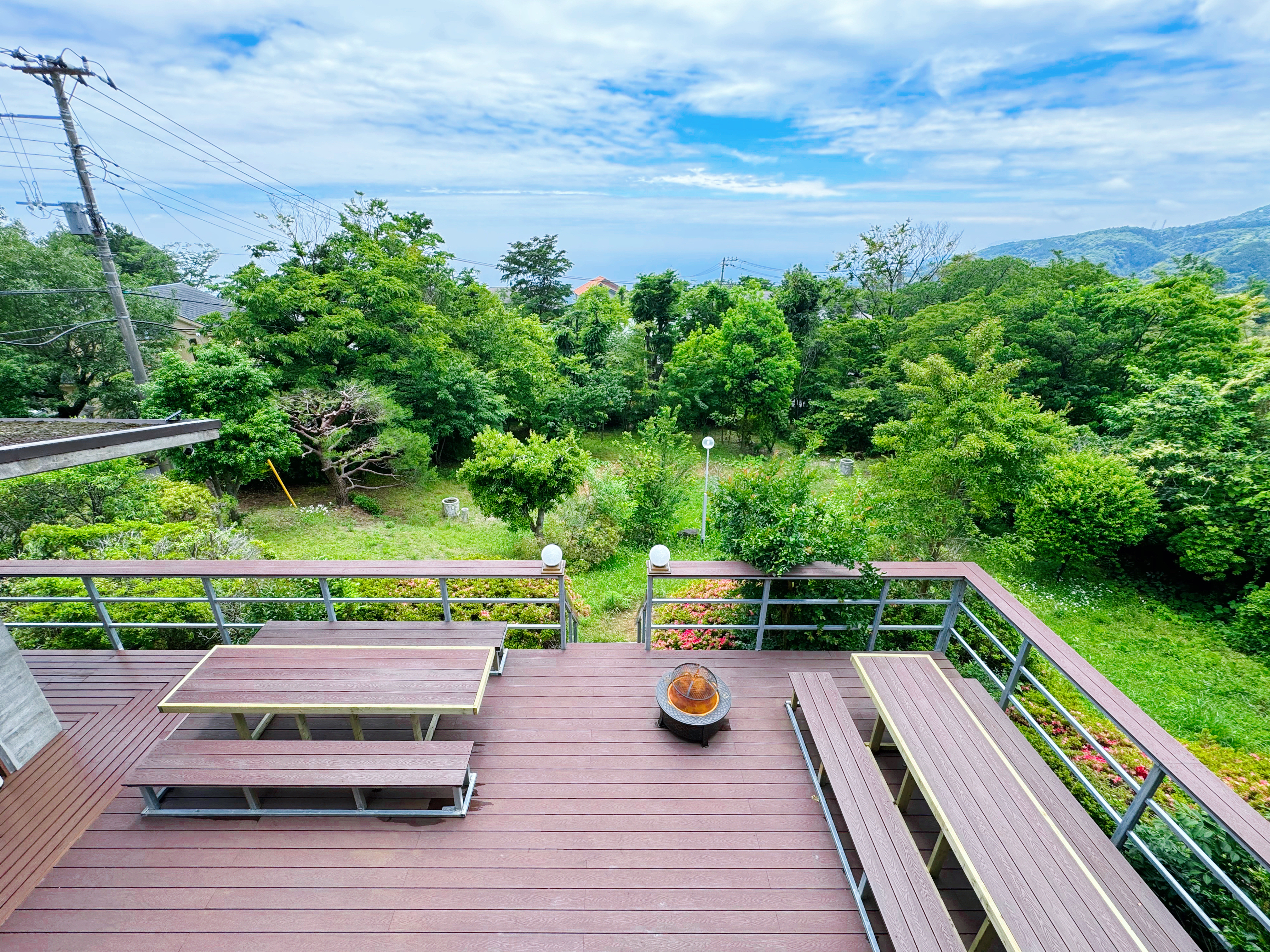 背後には美しい円錐形の大室山が目の前に迫り、眼下には広大な庭の木々越しに雄大な太平洋と伊豆諸島の島々が望めます。