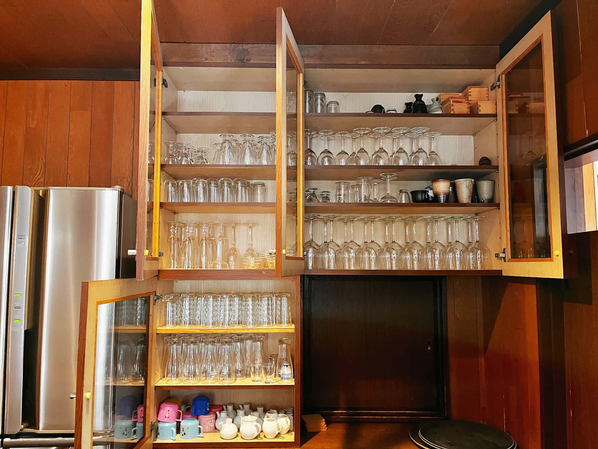 包丁×2・まな板×2・大きい鍋×2・おしどり鍋×2・フライパン×2・ざる×3・ボール×3・菜箸×2・やかん・おたま×2・フライ返し×2・栓抜き×2・缶切り・コルク抜き・皮むき・食器洗剤・スポンジ・キッチンペーパー・水切りネット・カウンタークロス・サランラップ・アルミホイル・ごみ用ビニール袋・着火ライター・お盆×5等